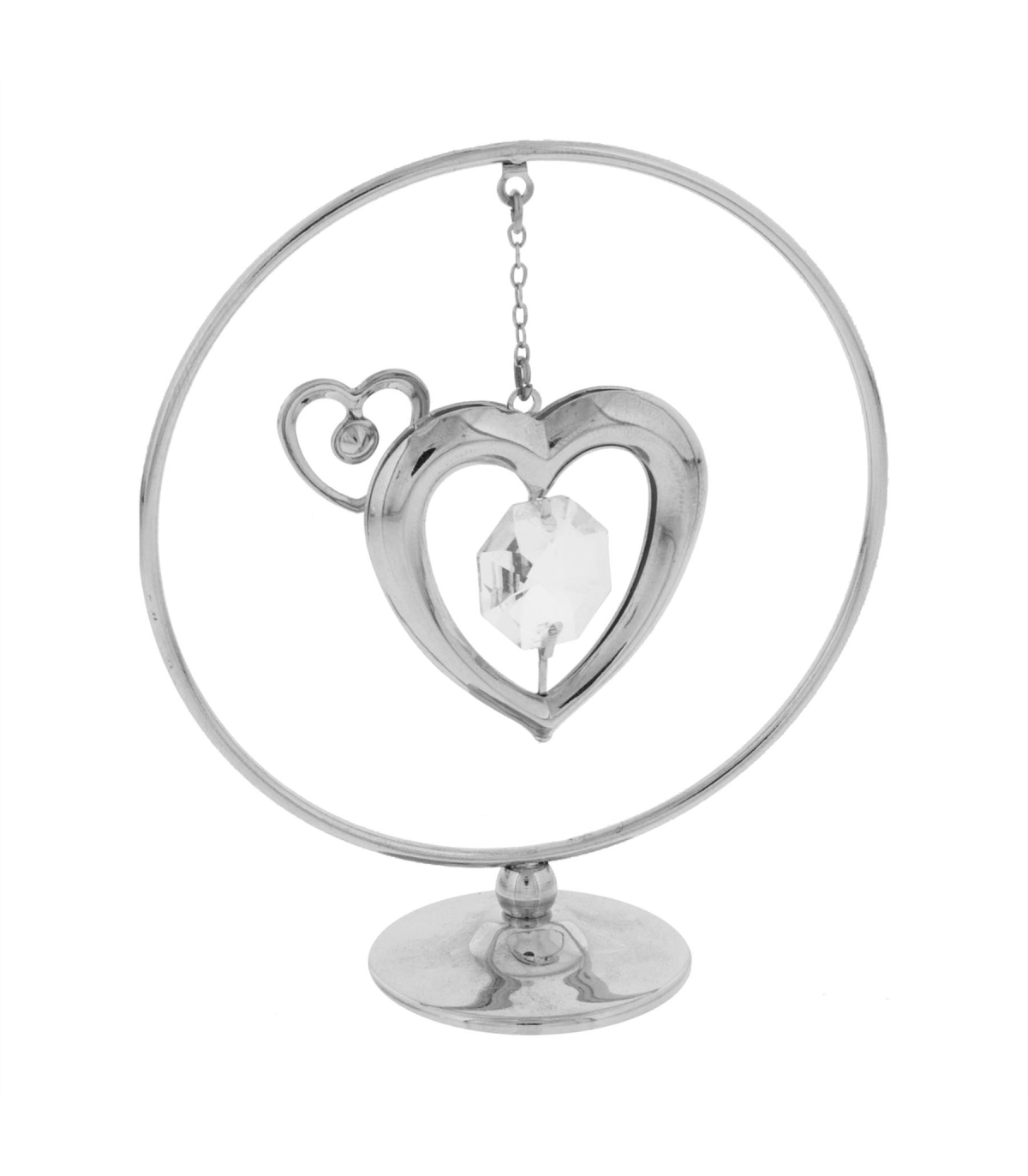 A beautiful, freestanding chrome plated Crystocraft love heart mobile. The decorative love hearts are suspended from a cut out circle frame and embellished with two Austrian Crystals. High quality, branded gift packaging completes this wonderful Crystocraft ornament.