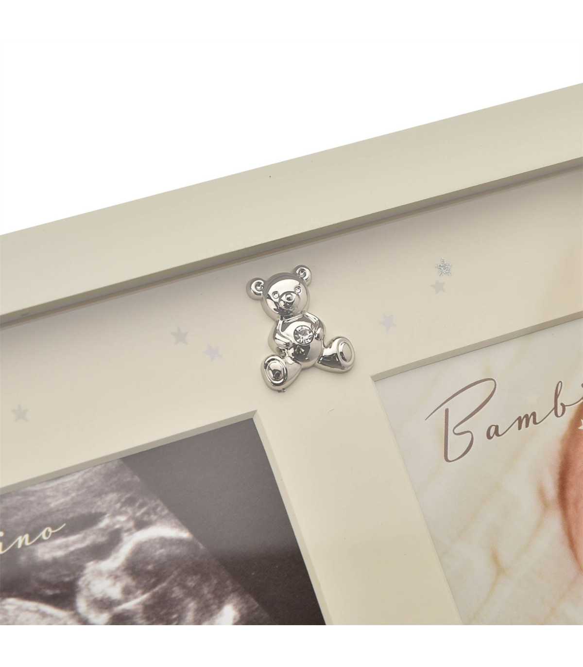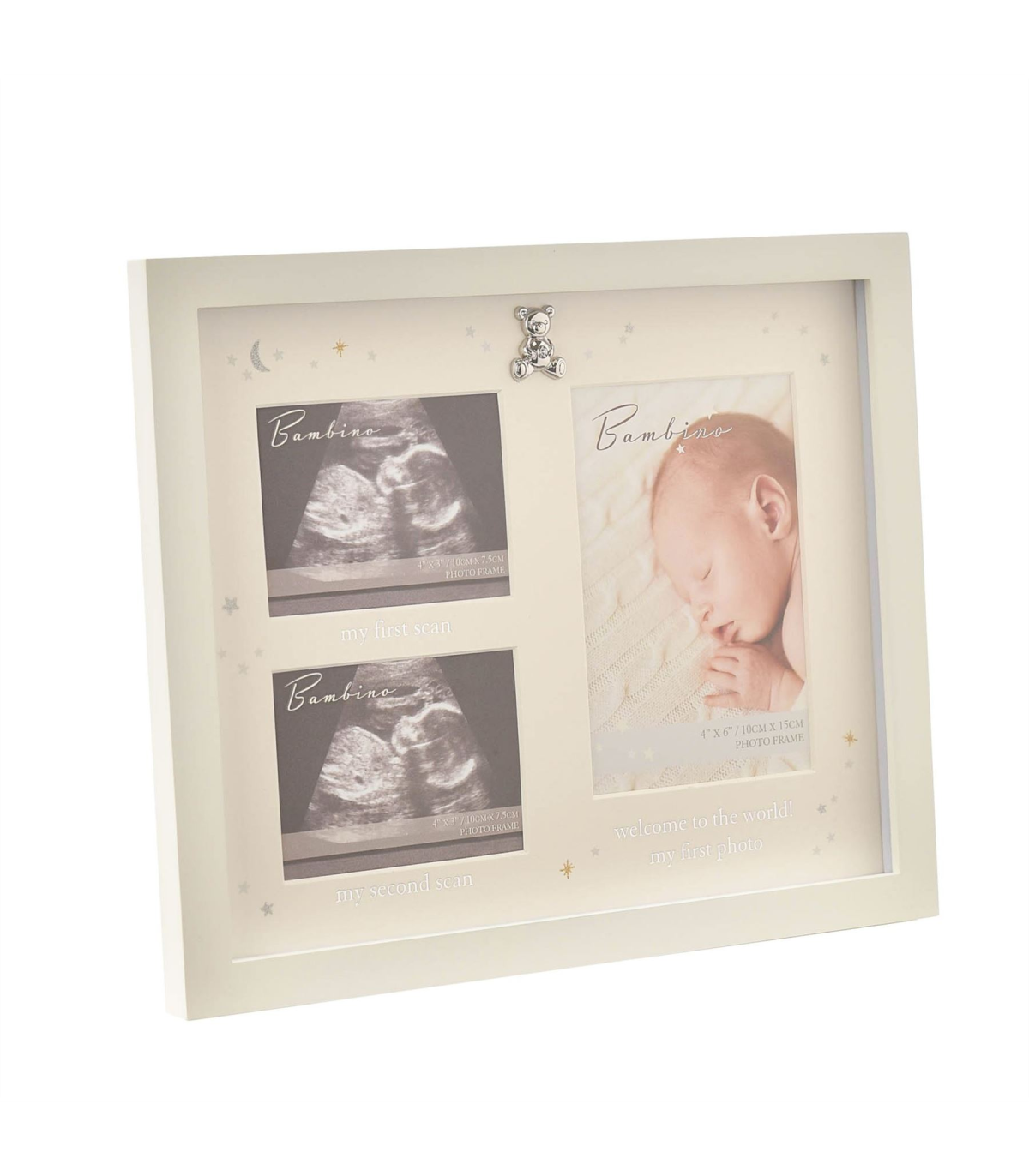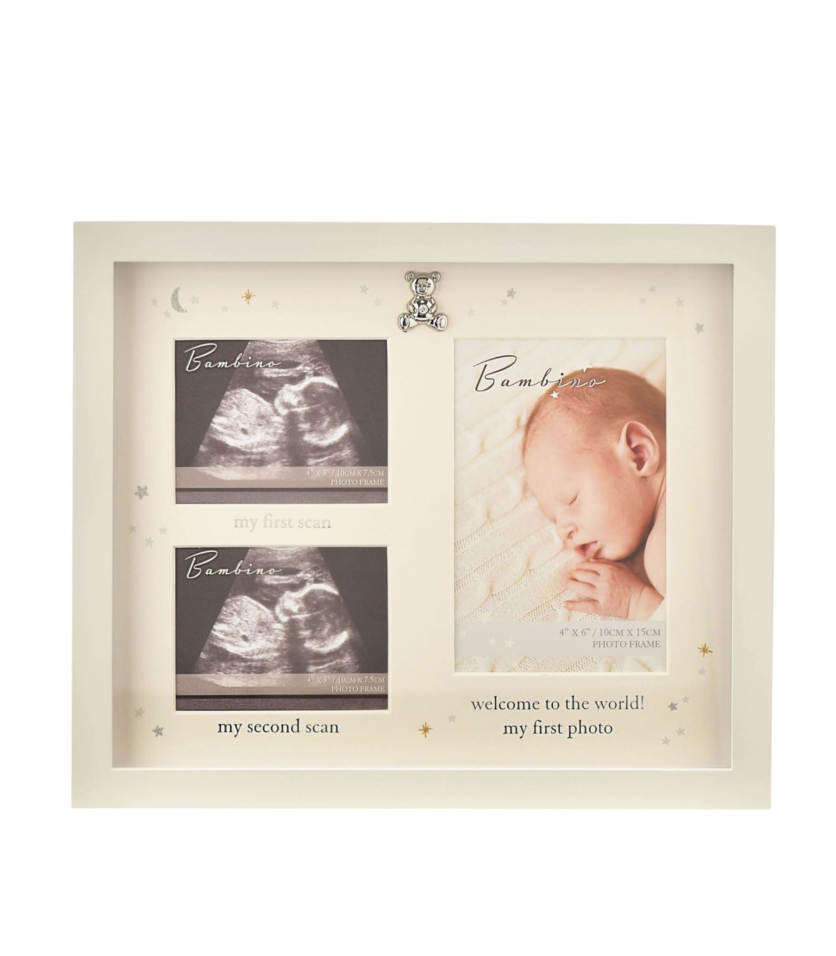 A scan frame with teddy icon from BAMBINO BY JULIANA�. This heart-warming frame truly captures the early moments of a new family arrival, both before and after their birth. The wooden frame has ivory finish - complete with complementary mount, silver plated teddy bear icon and �starry night� decoration � and is designed for either freestanding display or wall hanging. It features three apertures: one portrait (in which to present a baby photo) and two landscape (designed specifically for baby scans), all of which feature relevant wording underneath in silver font. The frame is packaged in a branded closed box.