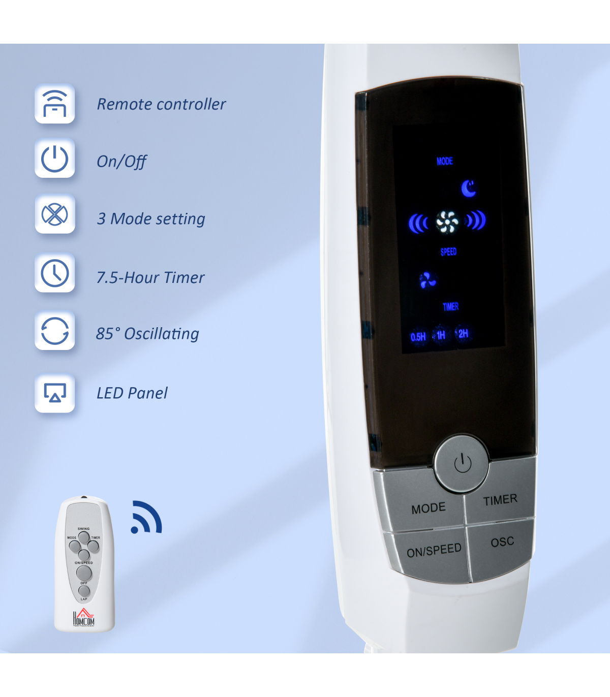 Stay comfortably cool during those hot summer afternoons and nights with this fan from HOMCOM. It is easy to use and perfect for home and office use. It features three variable speed settings and modes for personalised comfort. The 85° oscillation and 20cm adjustable range allows you to direct air to a specific point. A maximum 7.5 hour timer is perfect for night bedroom use. Fitted with an LED panel and comes with a remote for duo control.