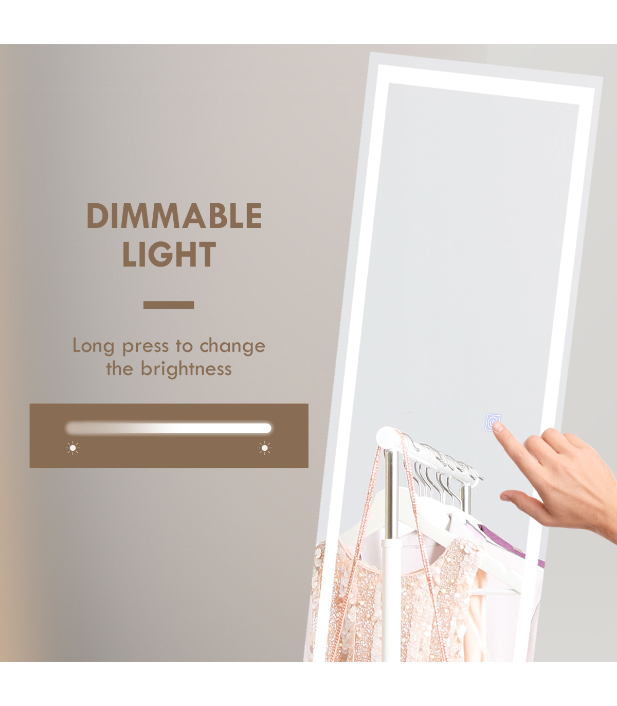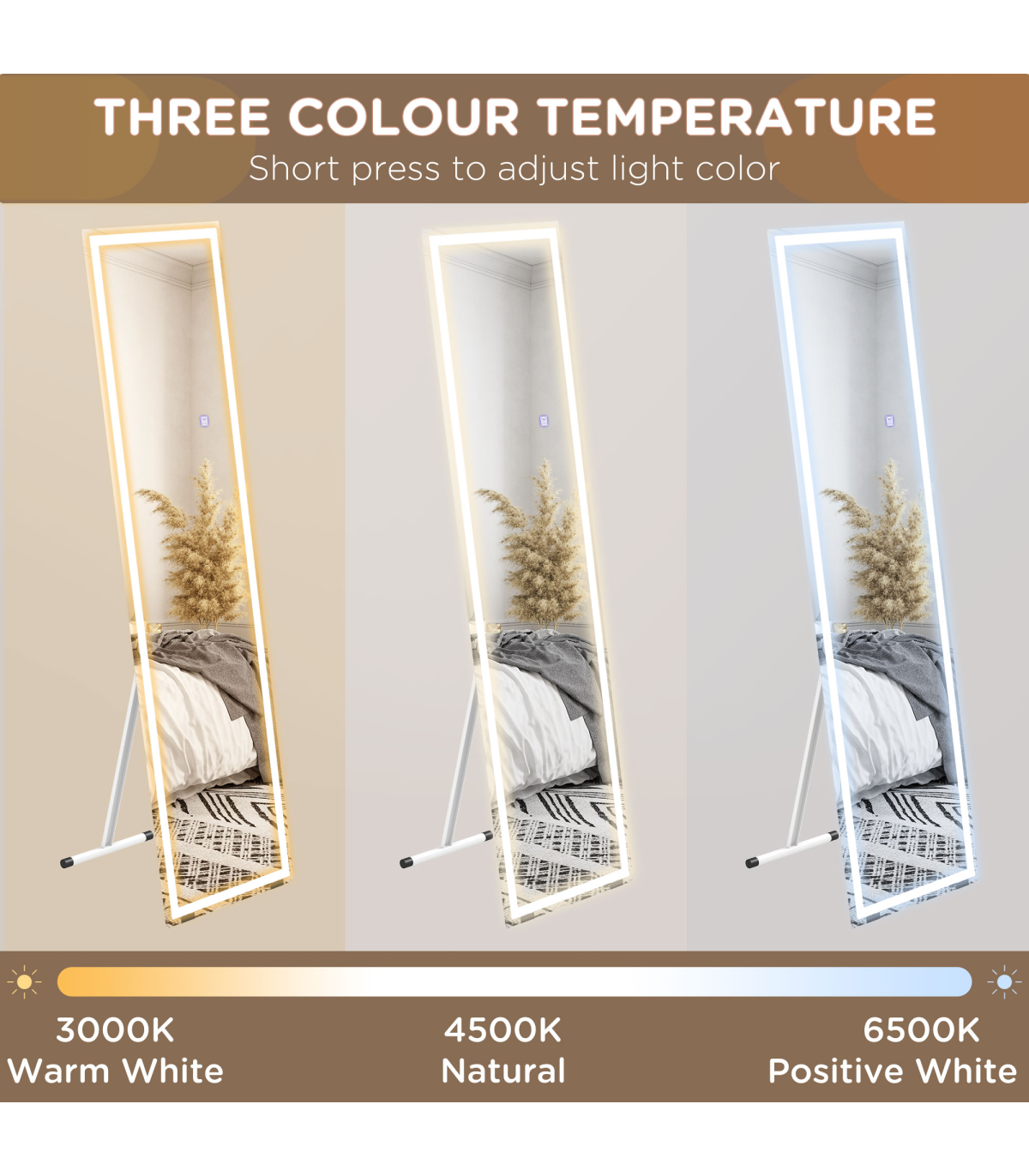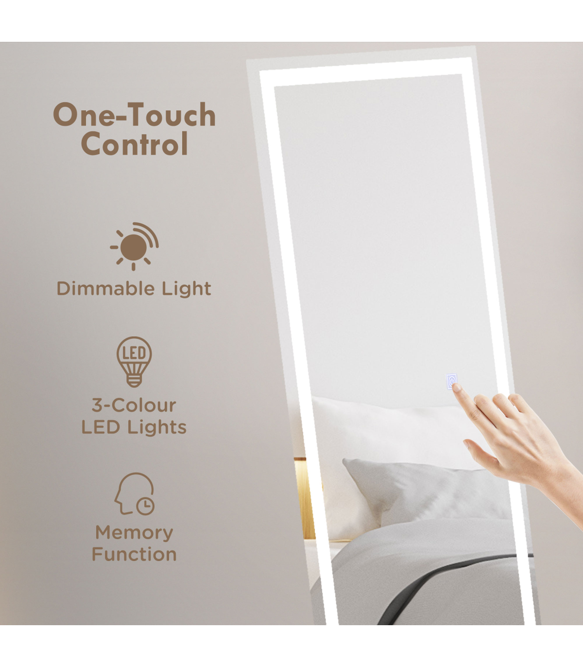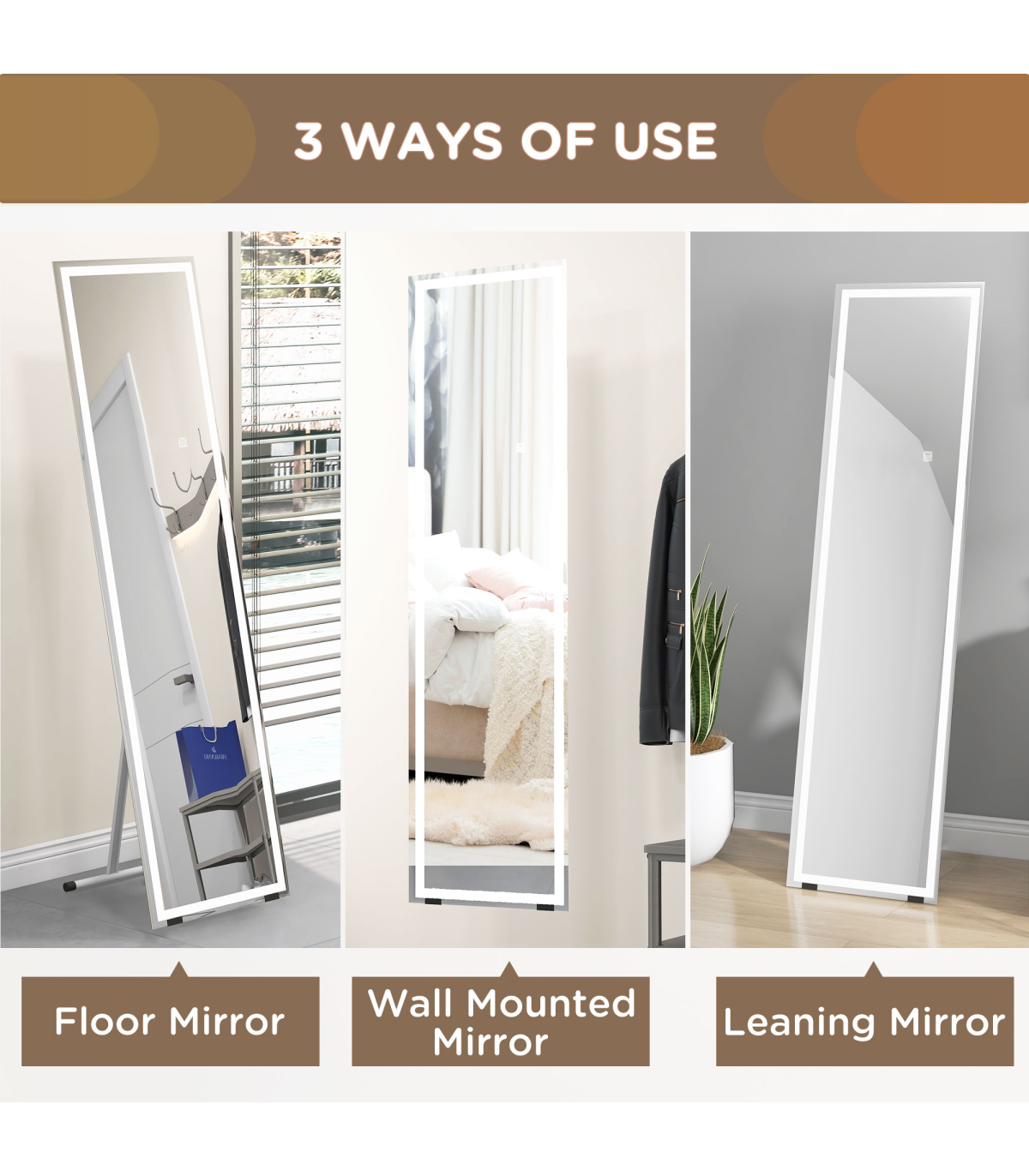 A classic homeware piece, the HOMCOM LED Lighted Full Length Mirror is a versatile addition to any bedroom. Featuring two long light strips on each side, this mirror illuminates beautifully, providing the perfect lighting day and night. The light can be adjusted to switch between warm white, natural, and positive white colors, with adjustable brightness levels controlled by a touch sensor. The mirror also includes a convenient memory function that saves your settings for next time. It can be used freestanding with the back leg, mounted on the wall using the included bracket and fixing accessories, or set up as a leaner mirror.