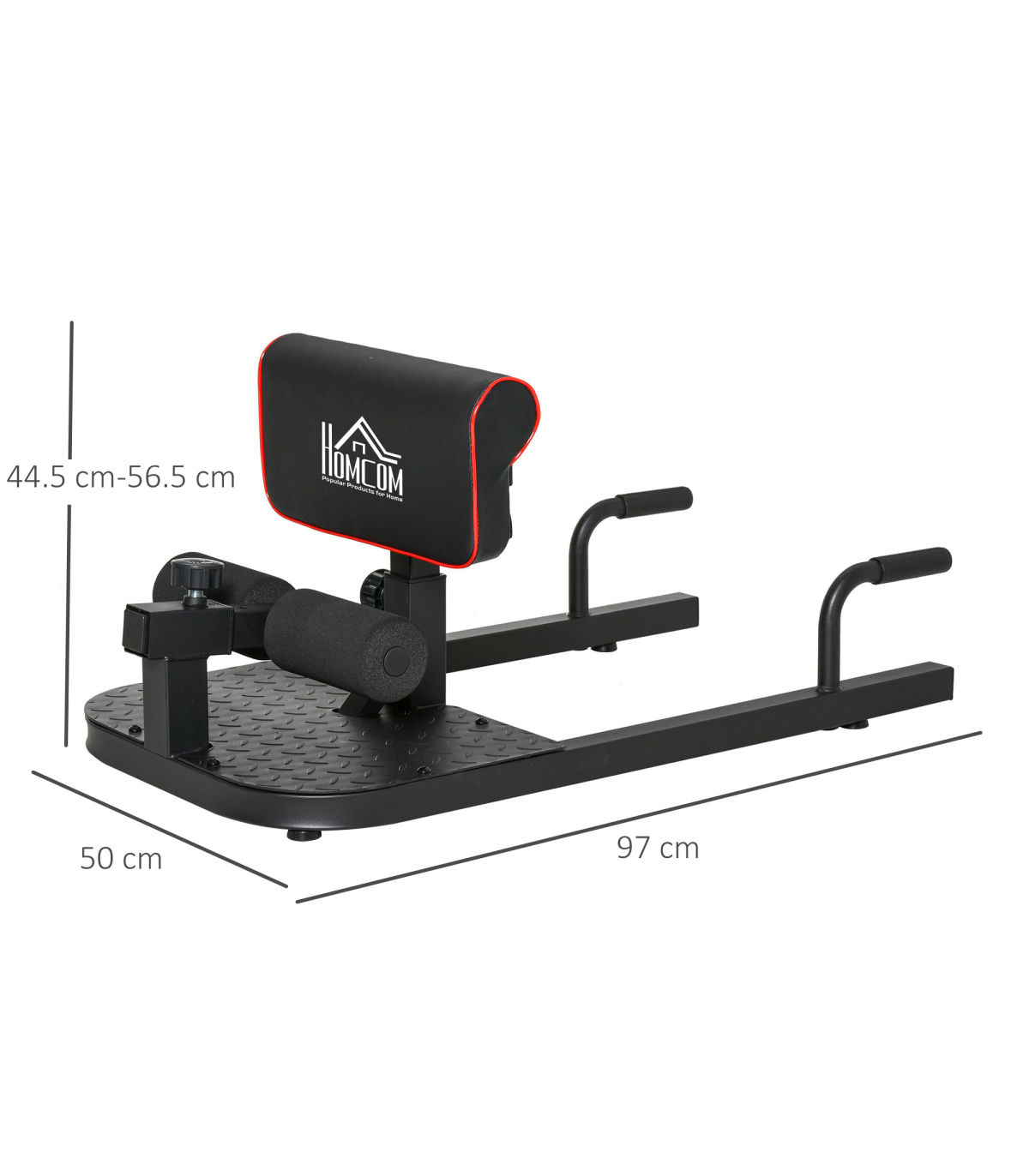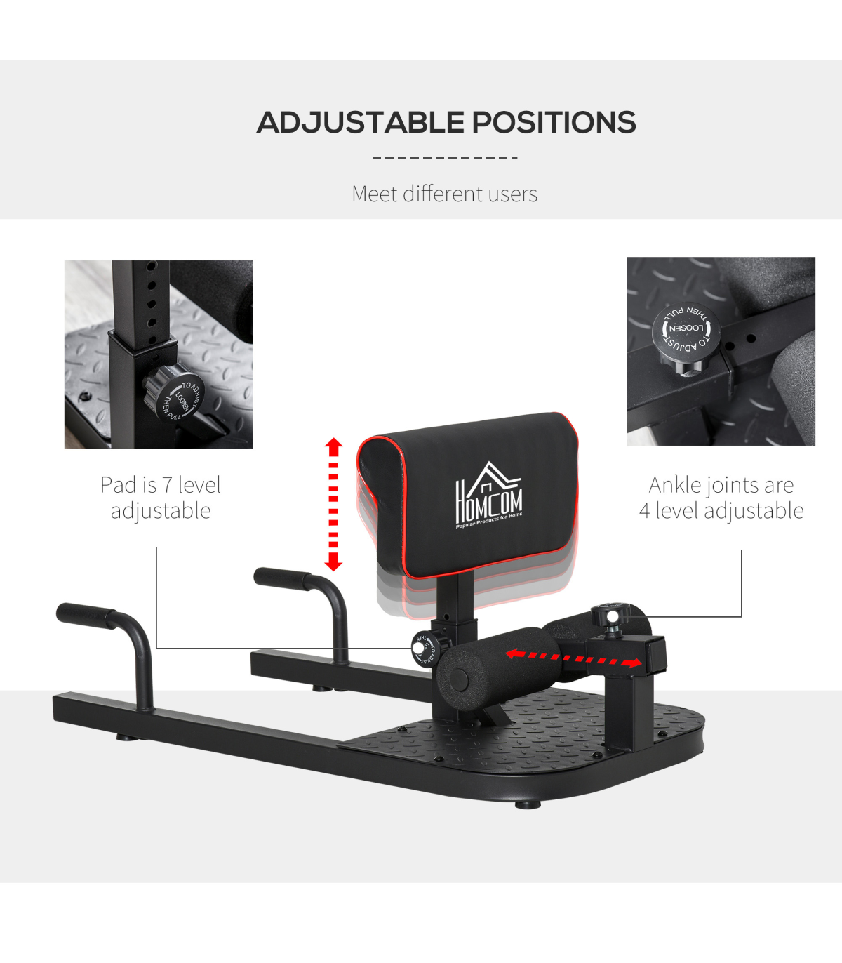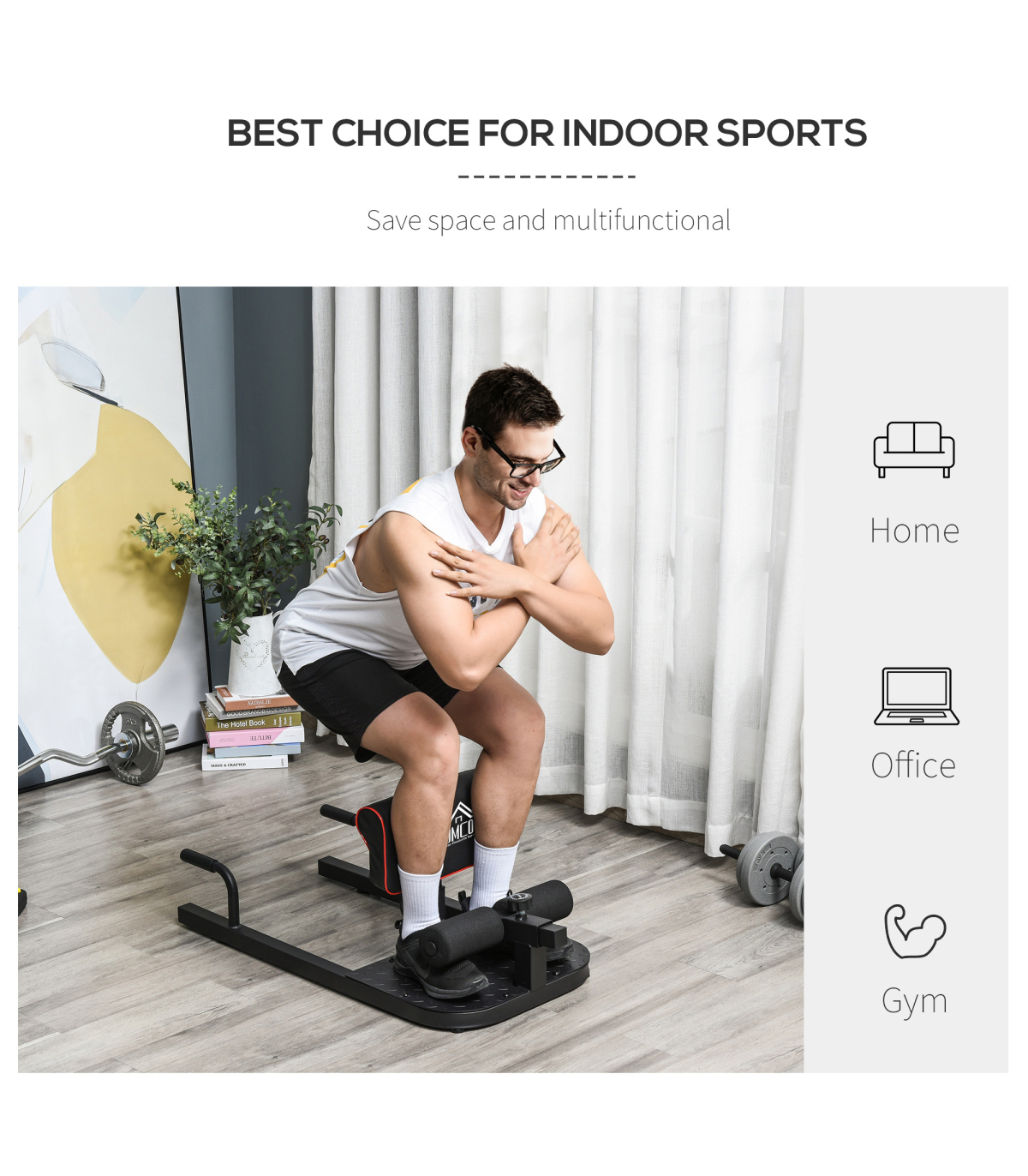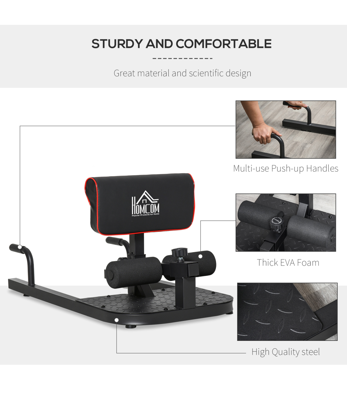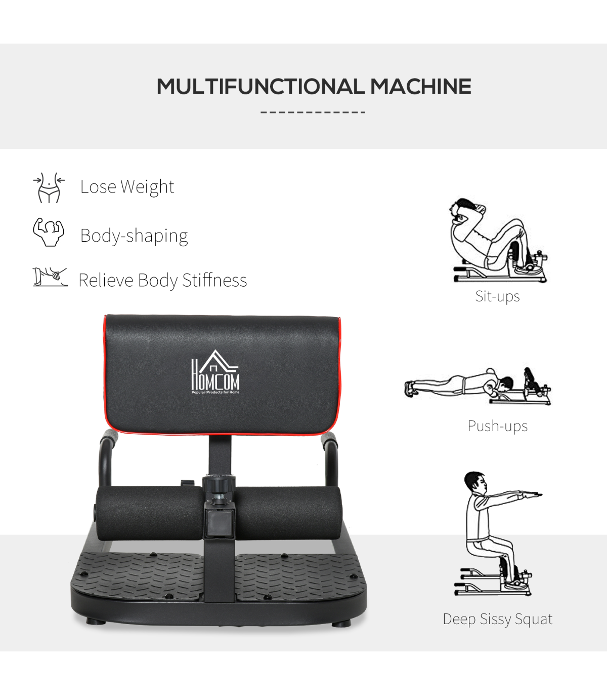 Introducing the versatile 3-in-1 Squat Machine from HOMCOM, designed to offer a comprehensive workout for your entire body. Whether you're looking to strengthen your core, quads, glutes, or calved, this machine has you covered. Perform deep sissy squats, sit-ups, and push-ups all with one piece of equipment. Constructed from sturdy steel and equipped with foam roller footrest and calf pads, it ensures both durability and comfort during your workout sessions. The non-slip foot plate with suction cup pads guarantees stability, allowing you to focus on your exercise without worry.