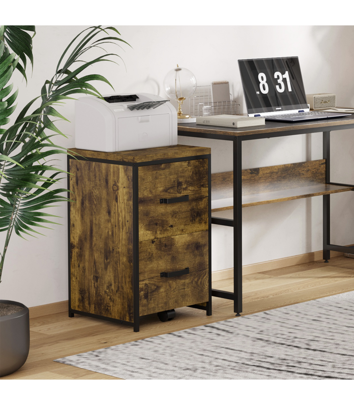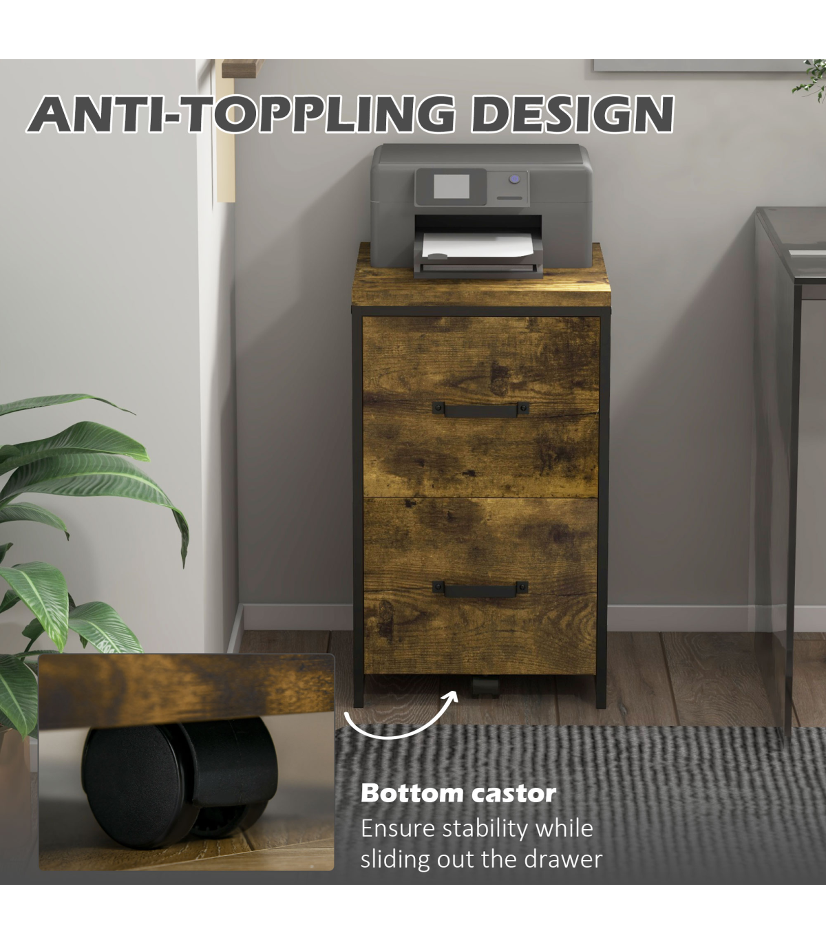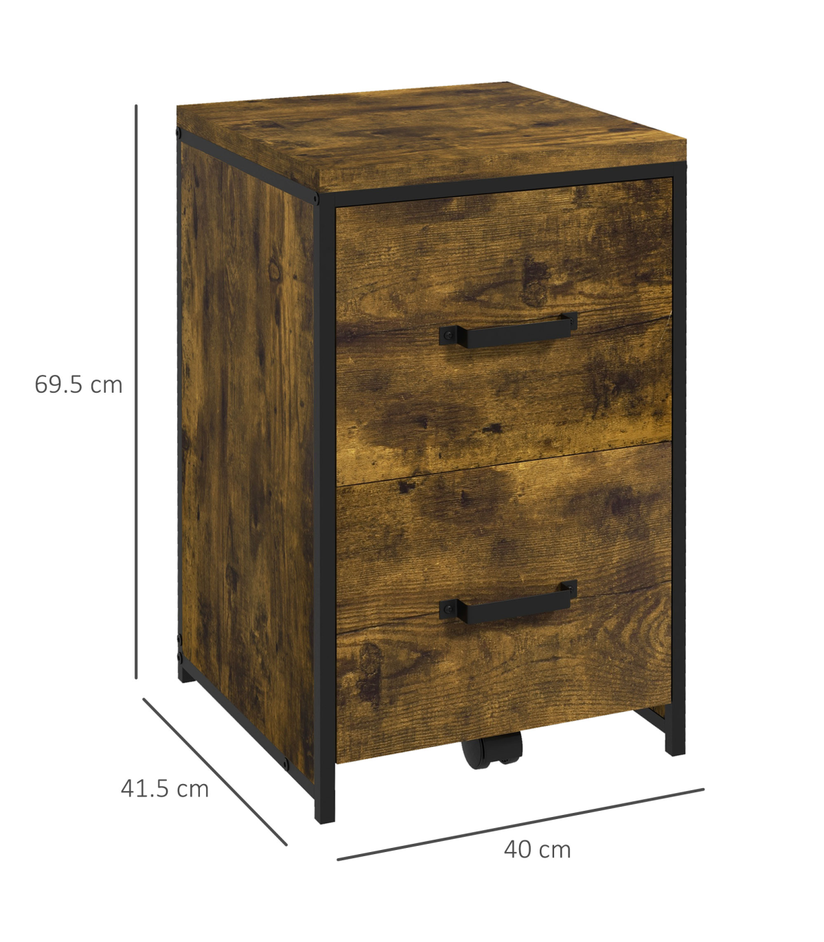 For a new take on traditional filing storage, opt for this cabinet from HOMCOM. Using a steel frame for a tough core structure, it's fitted with MDF panels - each finished in a vintage worn-out brown effect for stand-out style.It features two drawers for lots of personal storage, with the adjustable hanging bar making filing that extra bit easier. It's completed with an anti-tipping wheel to help prevent it falling forwards when the drawers are out.