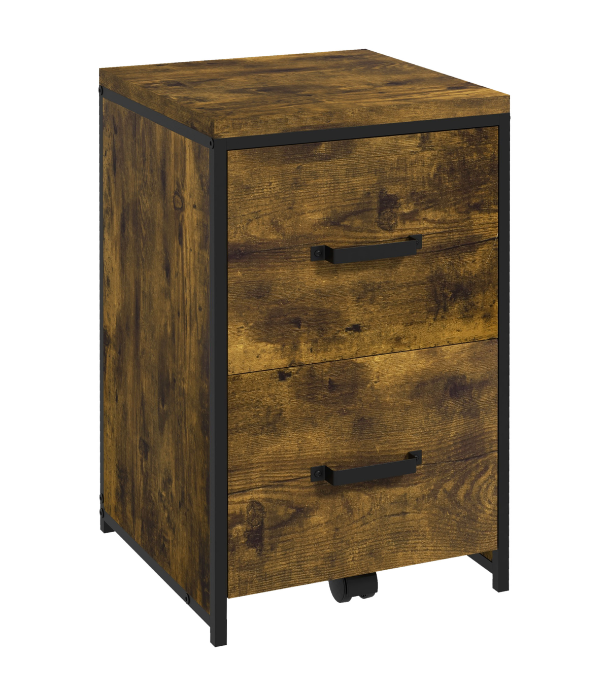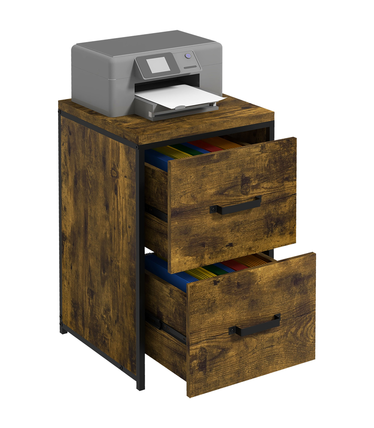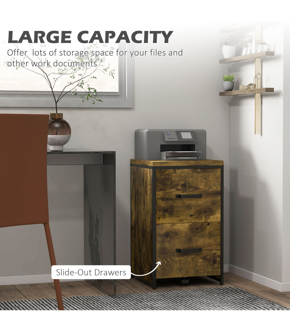 For a new take on traditional filing storage, opt for this cabinet from HOMCOM. Using a steel frame for a tough core structure, it's fitted with MDF panels - each finished in a vintage worn-out brown effect for stand-out style.It features two drawers for lots of personal storage, with the adjustable hanging bar making filing that extra bit easier. It's completed with an anti-tipping wheel to help prevent it falling forwards when the drawers are out.