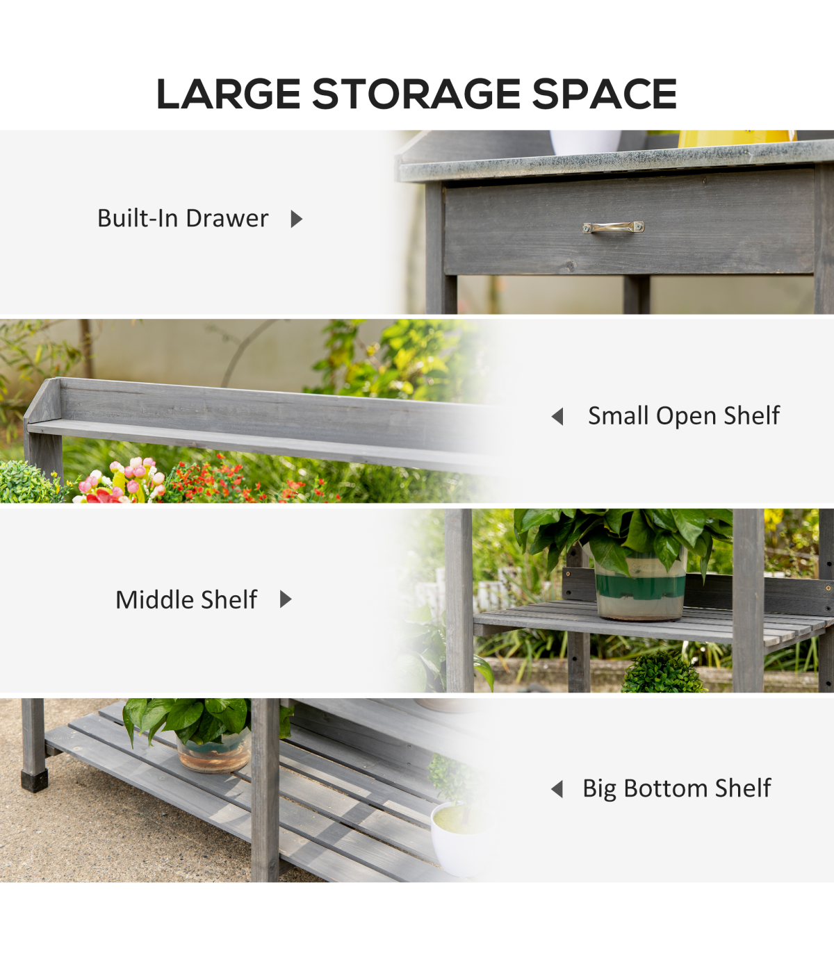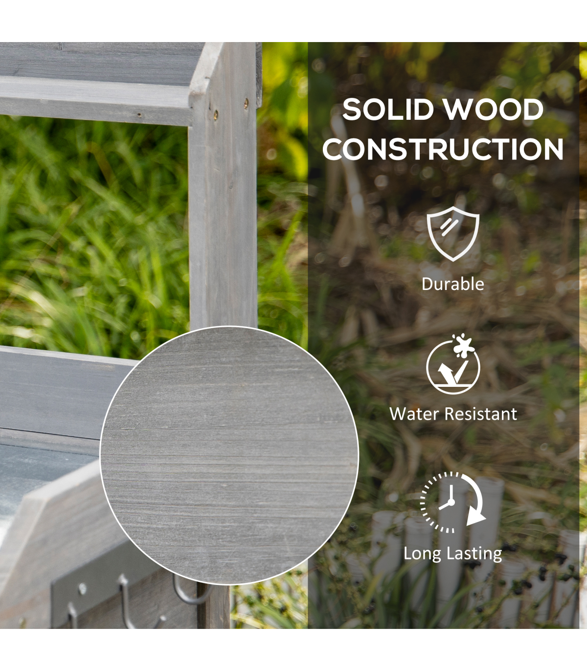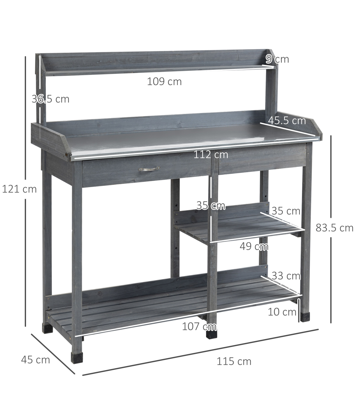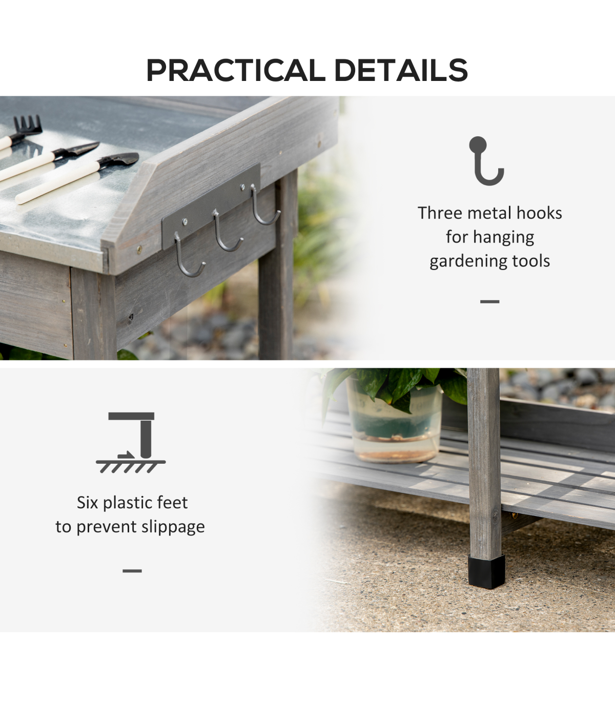 Enhance your gardening experience with this versatile Grey Garden Potting Bench from Outsunny. Designed to blend seamlessly into any outdoor setting, this potting bench combines functionality with style. The durable solid wood construction ensures longevity, while the galvanized metal top provides a rust-resistant surface for all your potting needs. With ample storage options, including a drawer and bottom shelves, all your gardening tools and supplies will be neatly organized and within reach. The addition of three metal hooks allows for convenient hanging of tools. The raised design not only adds to the aesthetic appeal but also provides ergonomic benefits, saving your knees and back during long gardening sessions. Whether you're a seasoned gardener or just starting out, this potting bench is a must-have for any outdoor space.