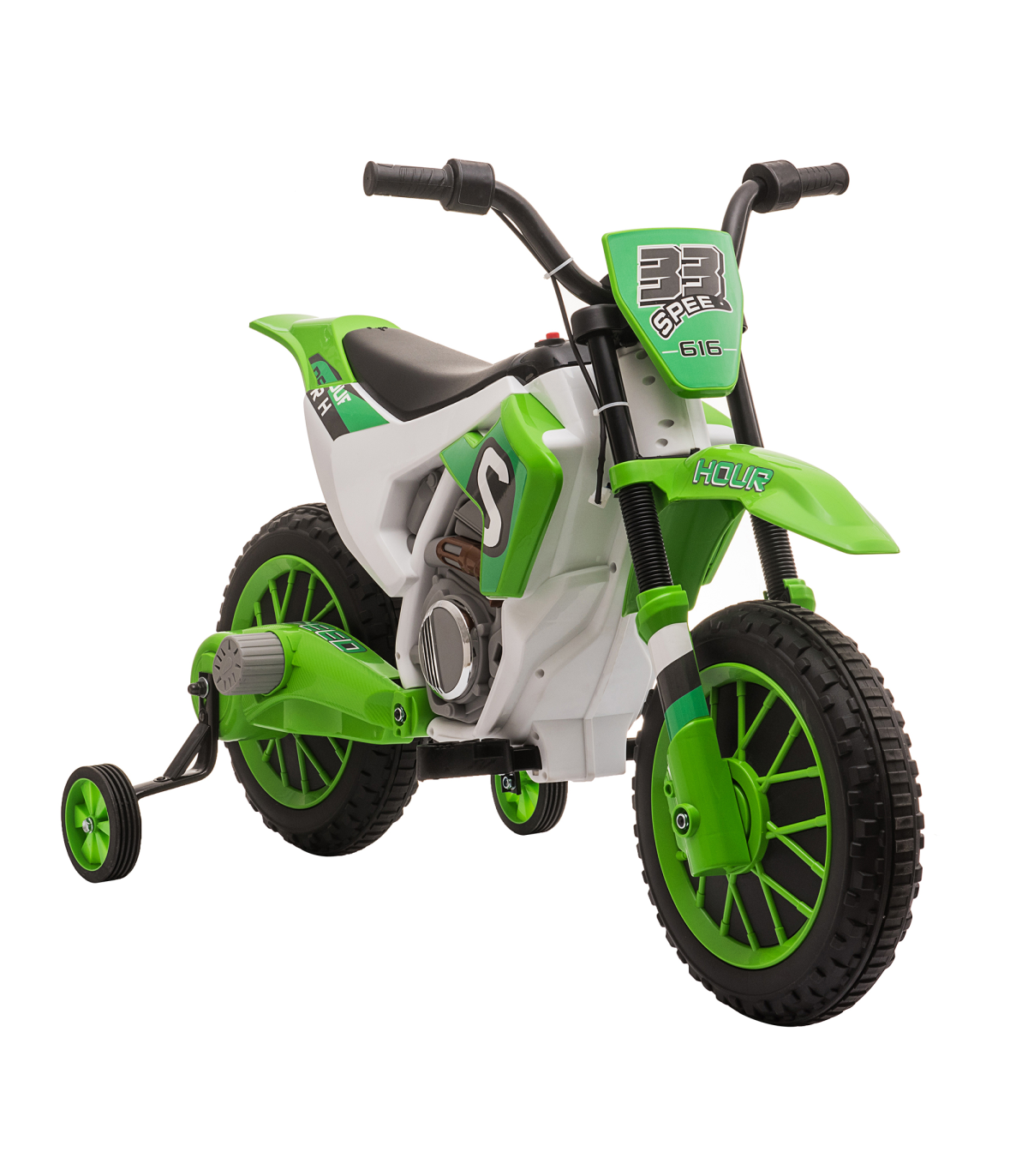 Introduce your little one to the thrill of riding with this 12V Kids Electric Motorbike Ride-On Motorcycle in a vibrant green color. Perfect for children aged 3-5 years, this ride-on toy features two speeds - 3 km/h and 8 km/h, allowing your child to choose a comfortable pace. The battery-powered motorbike can run for up to 45 minutes on a full charge, with a power display to keep track of the remaining battery life. For added safety, removable training wheels provide extra balance, and shock absorbers ensure a smooth ride. Assembly is required for this fun and exciting electric motorbike.