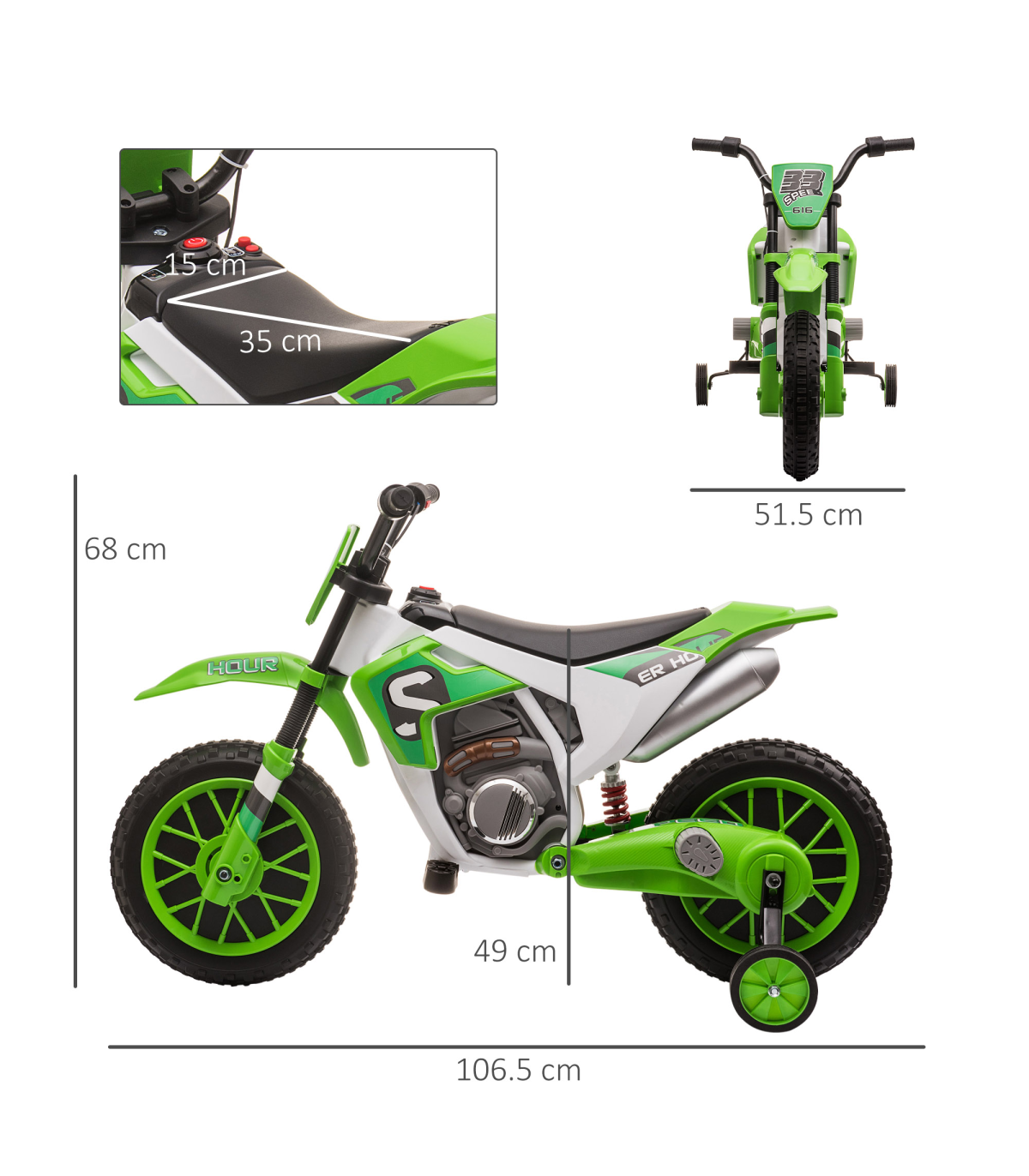 - Two speeds: This kids motorbike can ride at 3 km/h or 8 km/h. Choose a speed that is comfortable.