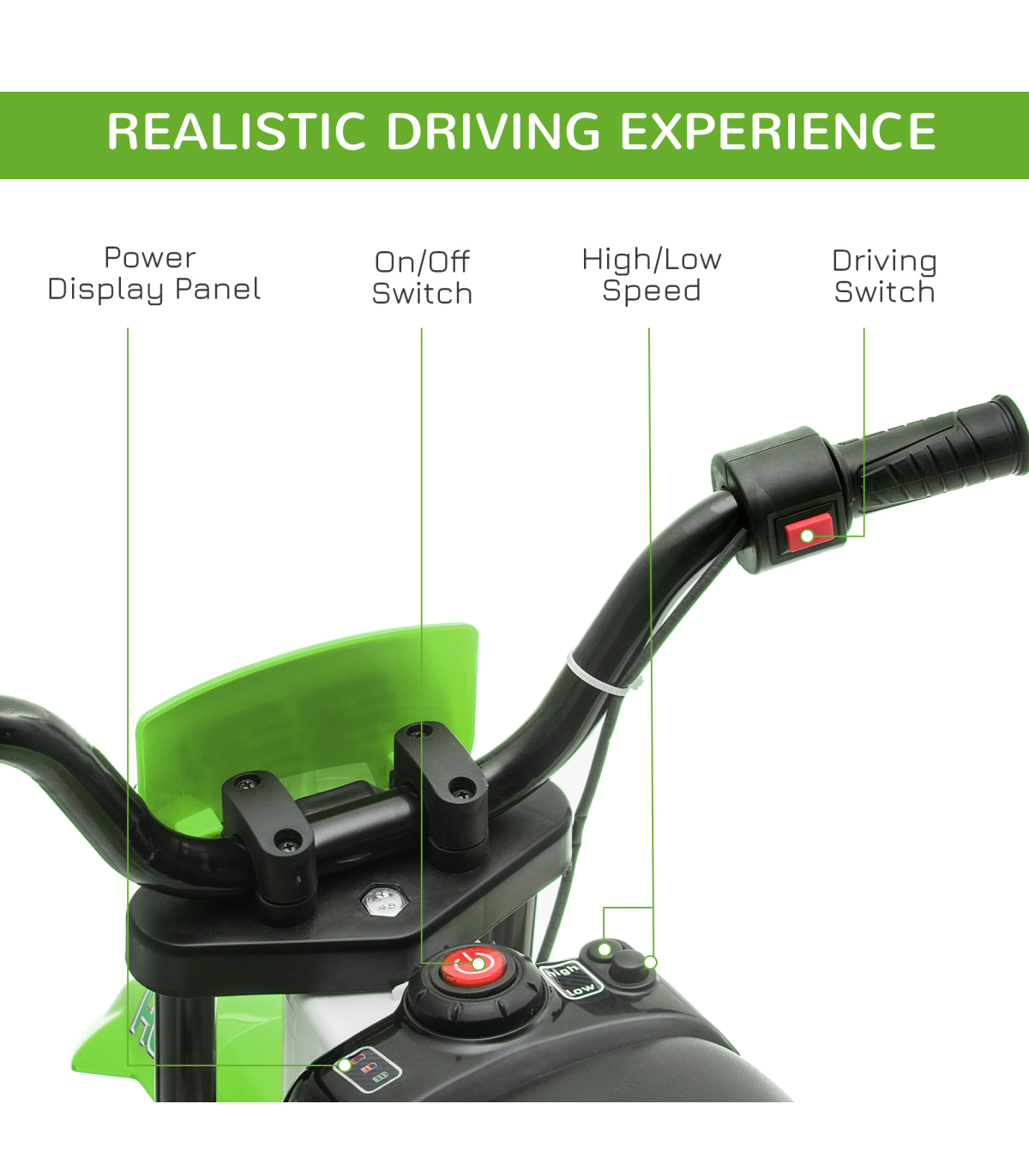 - Battery powered: At full charge, this electric motorbike can run for 45 minutes. The power display shows how much power is left.