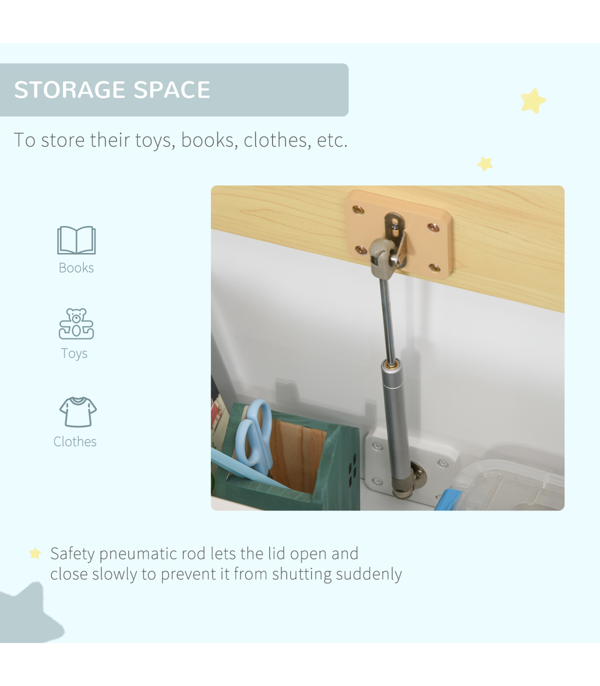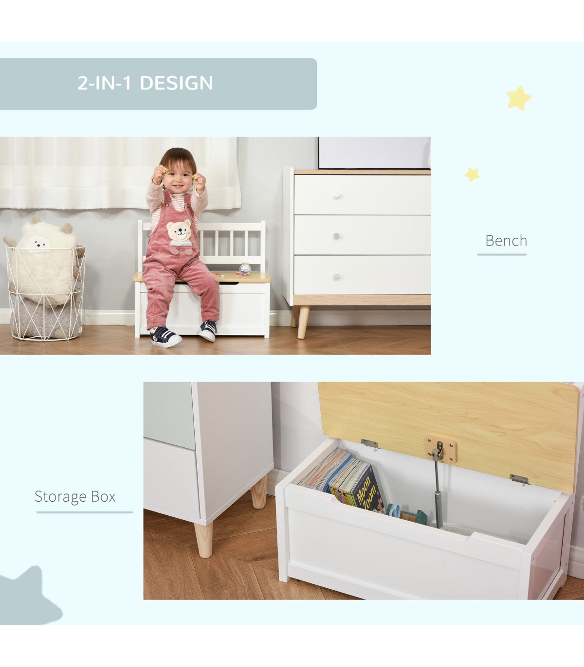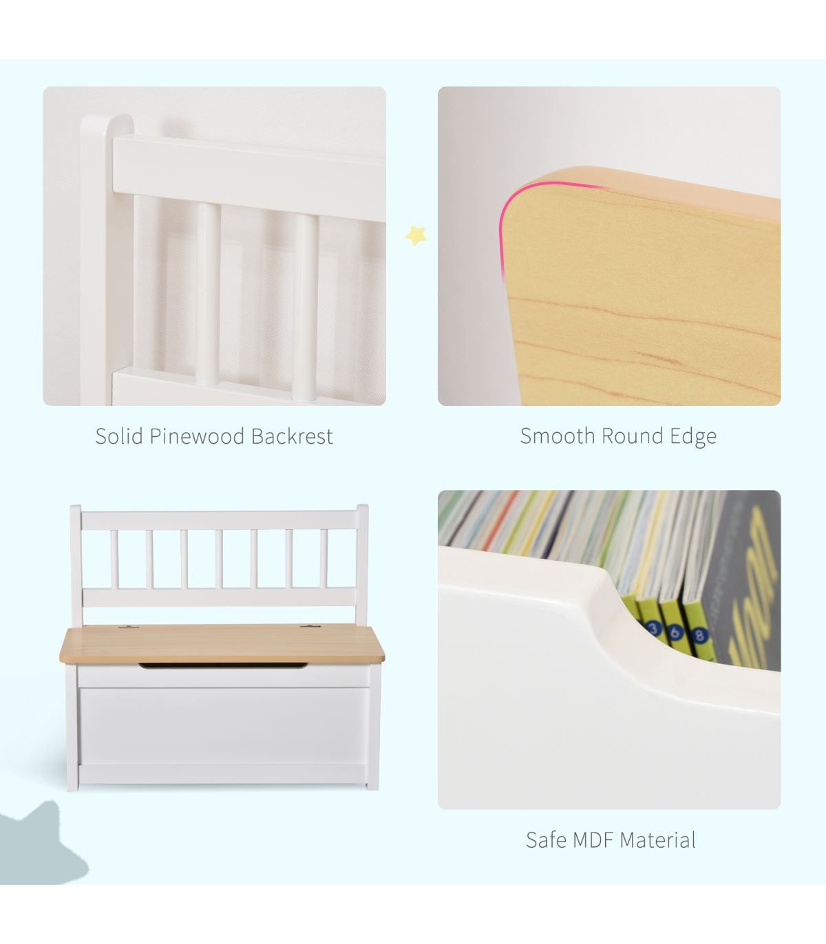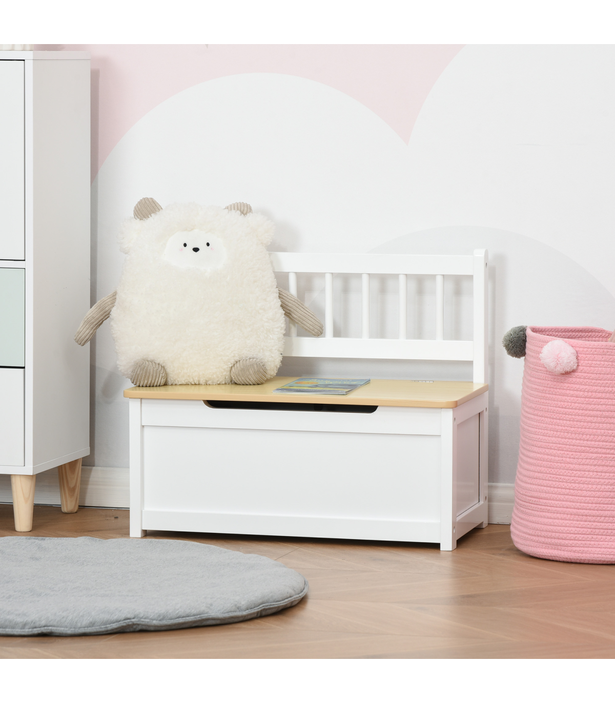 Made from durable MDF and pinewood materials, this toy box is designed to withstand the wear and tear of children's play. The maximum weight capacity of 40kg ensures it can hold plenty of toys. Suitable for children aged 2-5 years, this toy box meets EN 71-1-2-3 safety standards. Assembly is required to set up this versatile and functional piece.