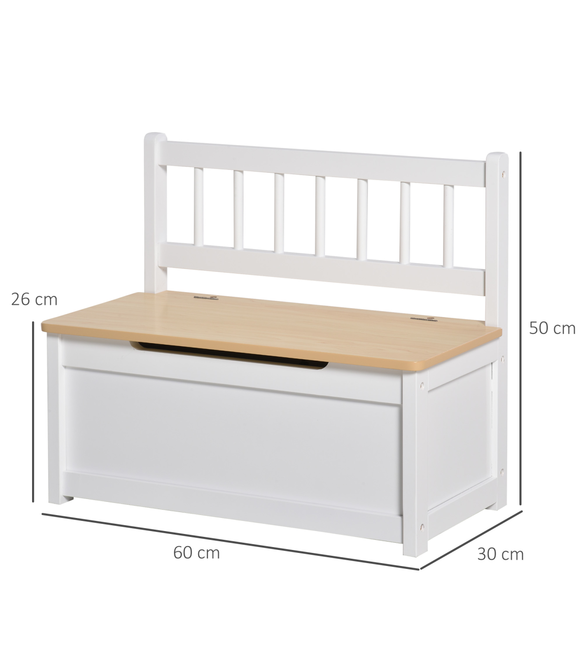 The 2 In 1 Wooden Toy Box doubles as a Kids Seat Bench Storage Chest, measuring 60 x 30 x 50cm. It is the perfect addition to any child's playroom or bedroom, providing ample storage space for toys and a comfortable seating area. The white finish adds a clean and modern touch to any decor.