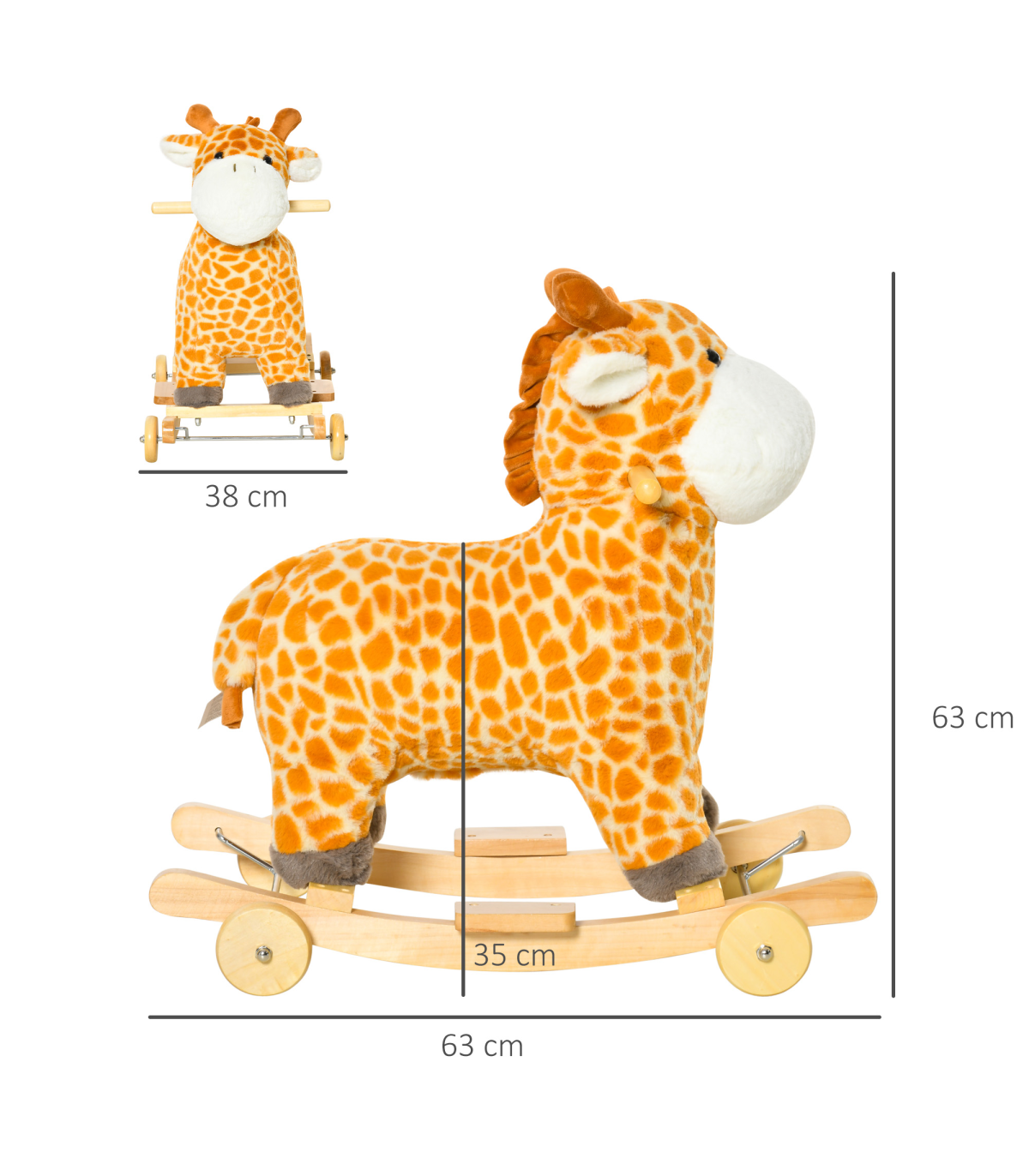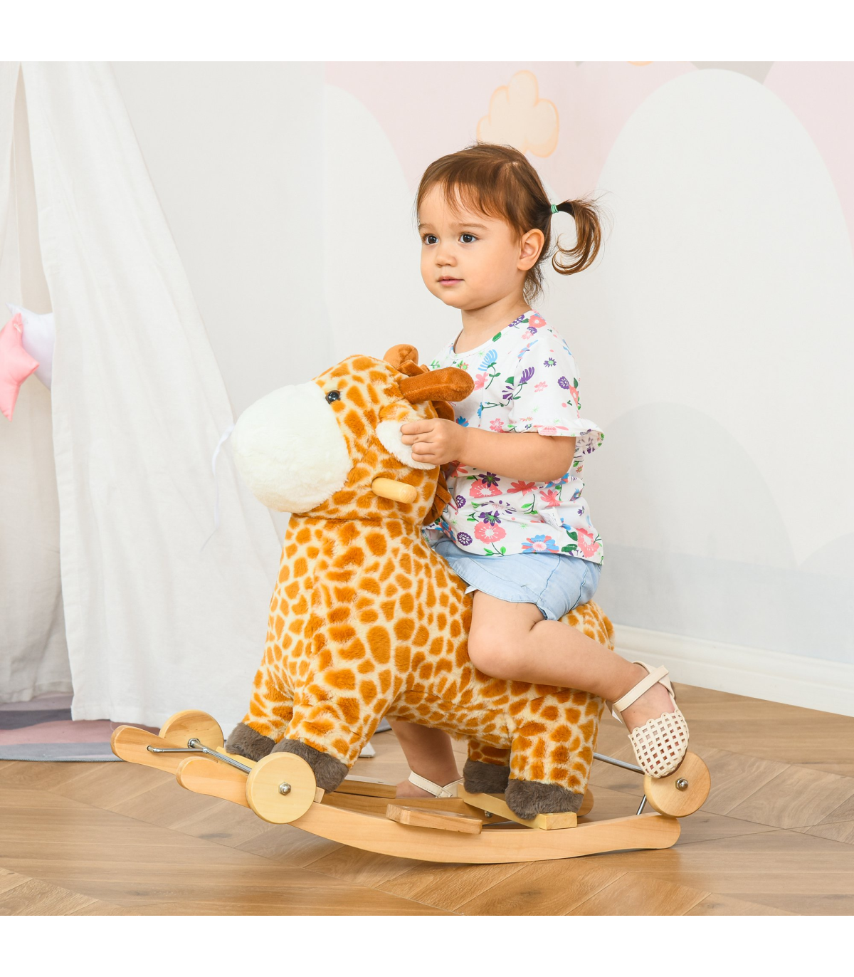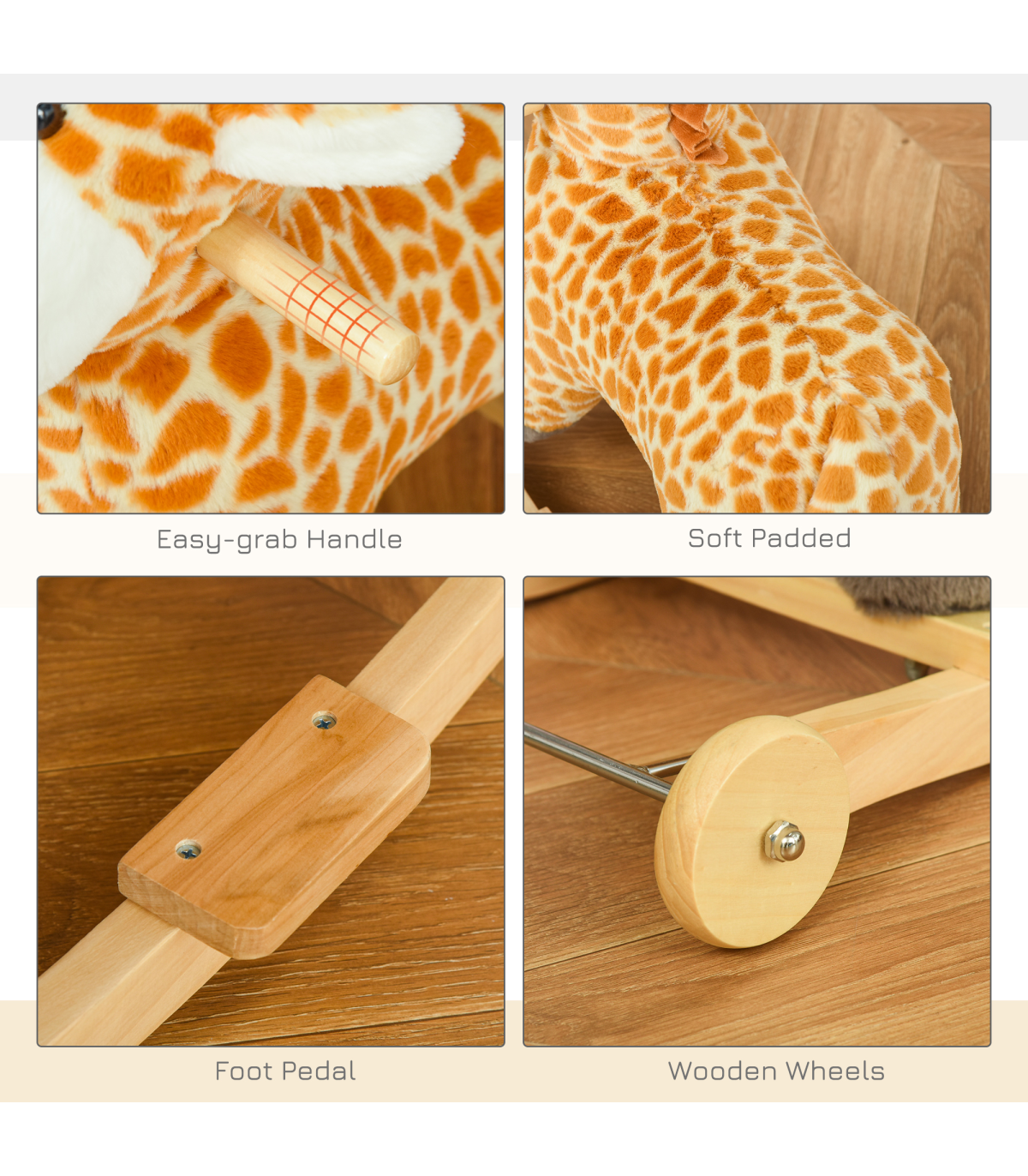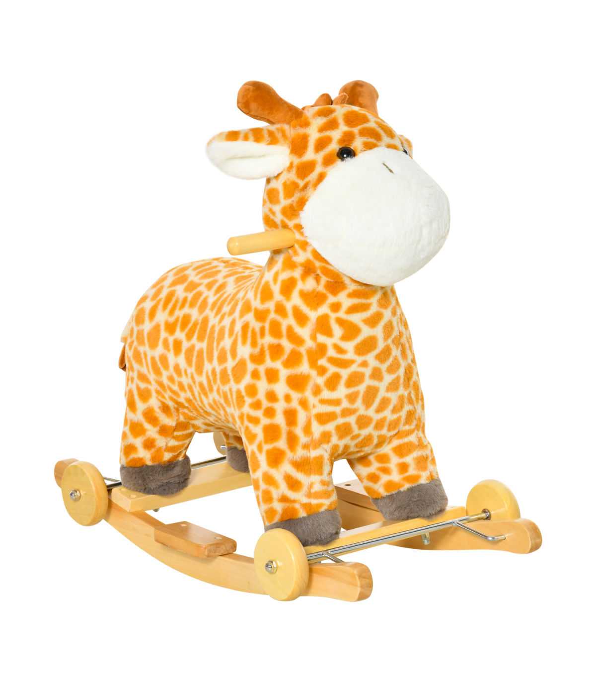 Just like a traditional rocking horse, but with a modern twist, this HOMCOM 2-in-1 Kids Plush Ride-On Giraffe Horse is perfect for children aged 36-72 months. The cute giraffe design is sure to be a hit with your little one, and the soft fabric covering adds an extra touch of comfort. The spacious top provides plenty of room to sit, and the two back handlebars ensure stability while rocking. The solid wooden frame features two curved bottom rails for gentle rocking motion without the risk of tipping over. Plus, press the ear for fun animal sounds to enhance the play experience. Assembly is required.