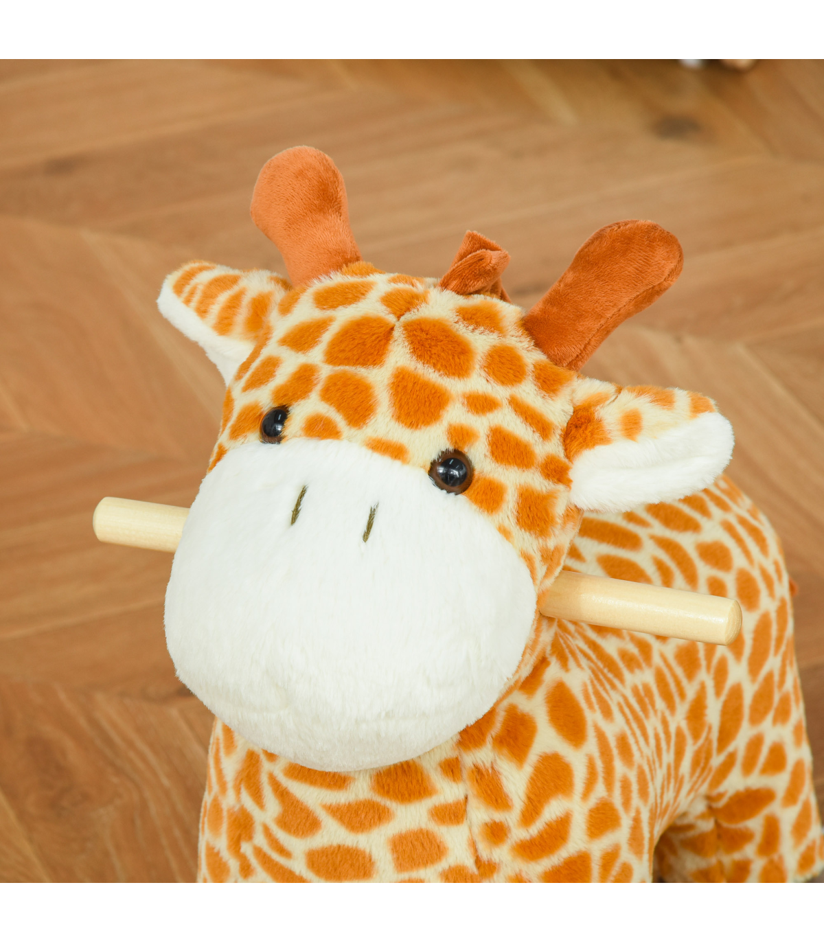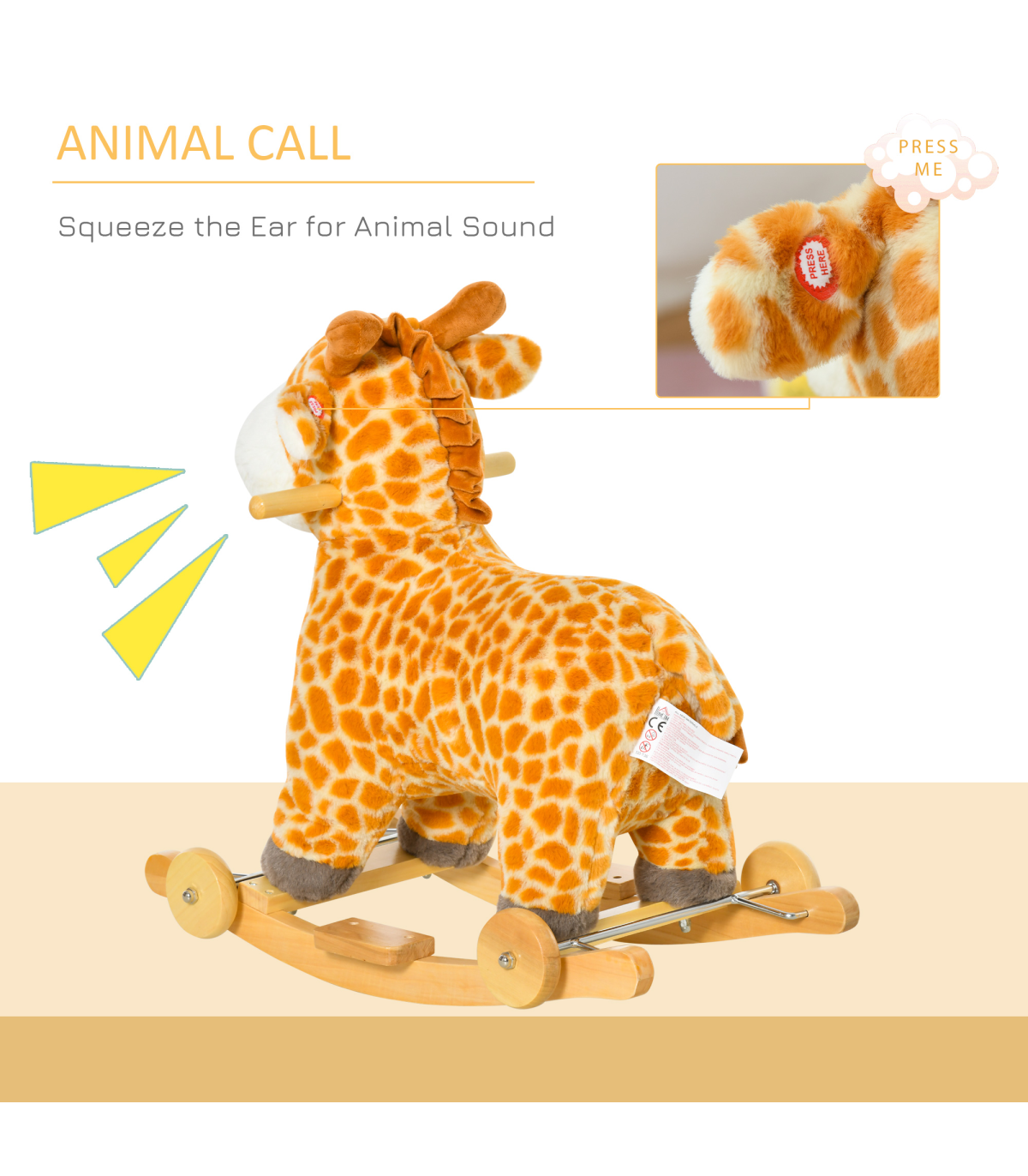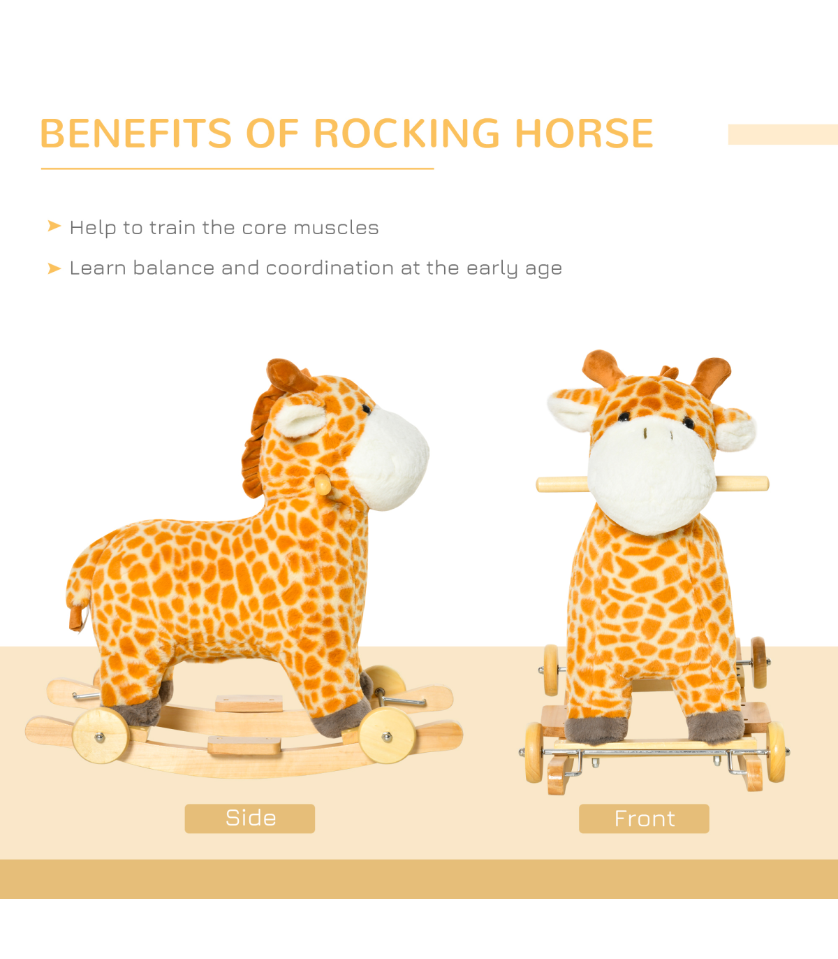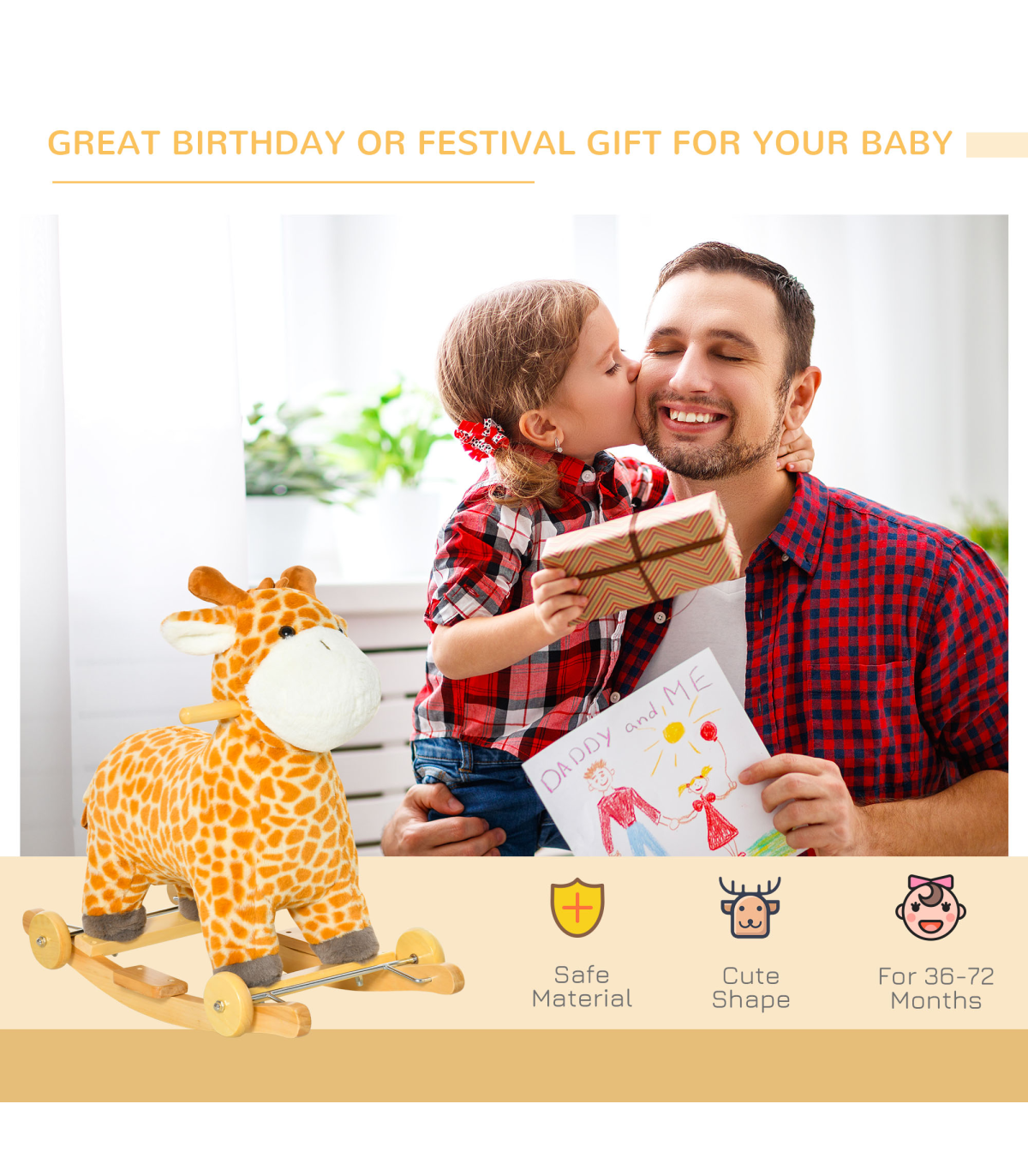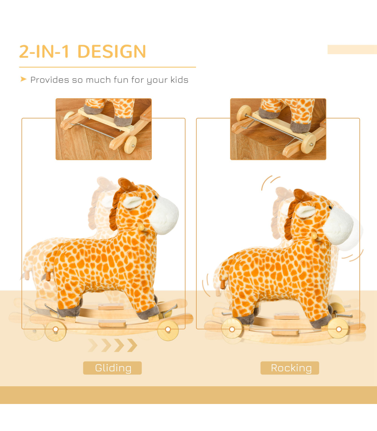 Just like a traditional rocking horse, but with a modern twist, this HOMCOM 2-in-1 Kids Plush Ride-On Giraffe Horse is perfect for children aged 36-72 months. The cute giraffe design is sure to be a hit with your little one, and the soft fabric covering adds an extra touch of comfort. The spacious top provides plenty of room to sit, and the two back handlebars ensure stability while rocking. The solid wooden frame features two curved bottom rails for gentle rocking motion without the risk of tipping over. Plus, press the ear for fun animal sounds to enhance the play experience. Assembly is required.
