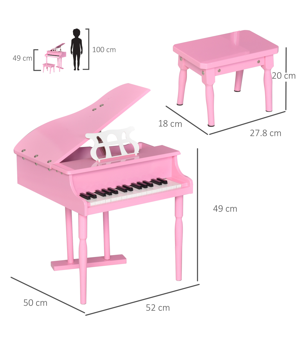- Dimensions: Piano - 49H x 52L x 50Wcm, Stool - 20H x 27.8L x 18Wcm, Sheet stand - 21L x 10.5Wcm