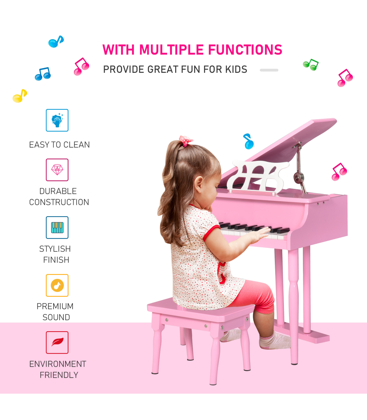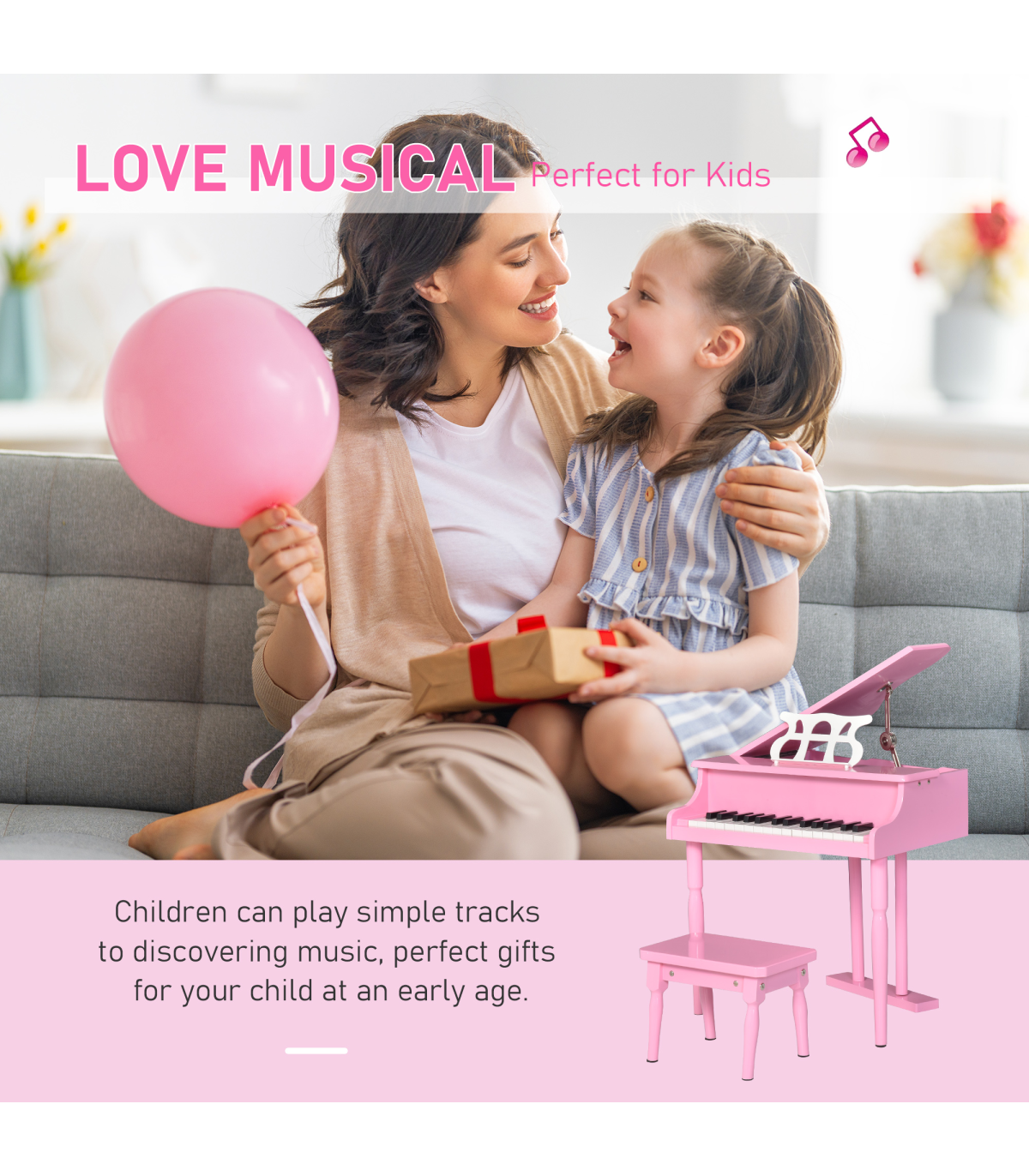 - TWO-PIECE DESIGN: Comes with the piano and matching stool - everything they need to sit down and play.