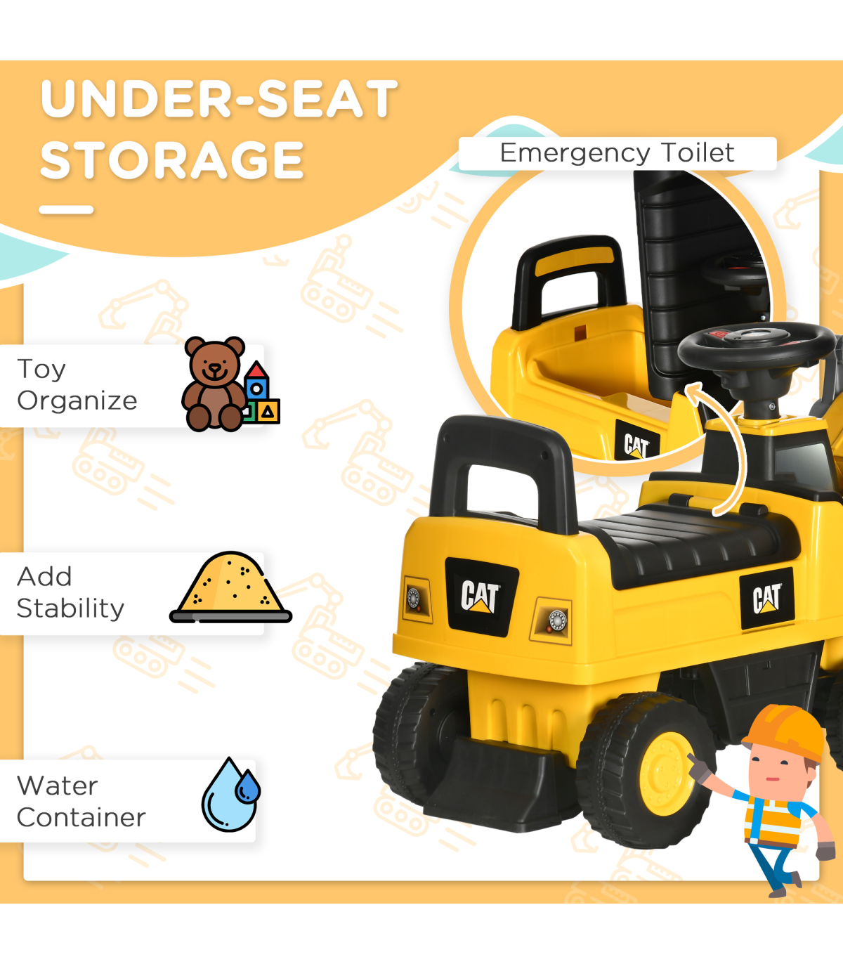 This CAT Licensed Kids Construction Ride-On is perfect for little ones who love to play pretend construction worker. The realistic design and controllable shovel will keep them entertained for hours as they use their feet to move forwards and backwards. The backrest ensures safety by preventing kids from falling backwards while riding, and the textured wheels provide stability and a better grip. Plus, the hidden storage under the seat is great for keeping toys, keys, treats, and other small items. Certified for safety, this ride-on is suitable for children aged 1-3 years.
