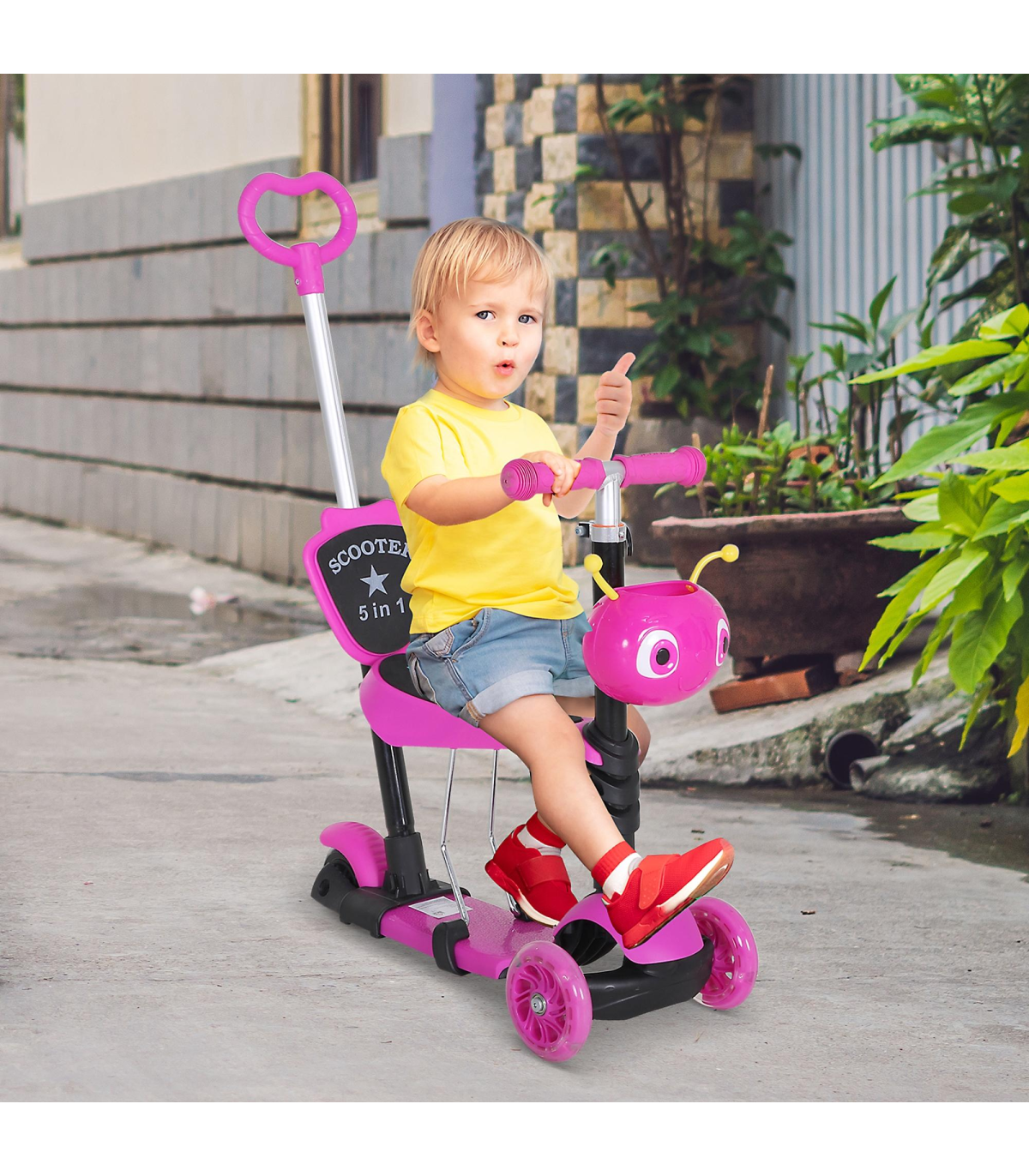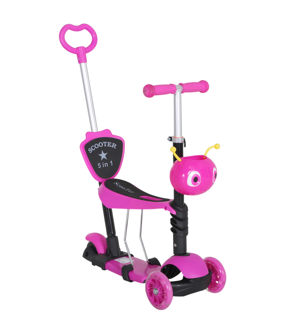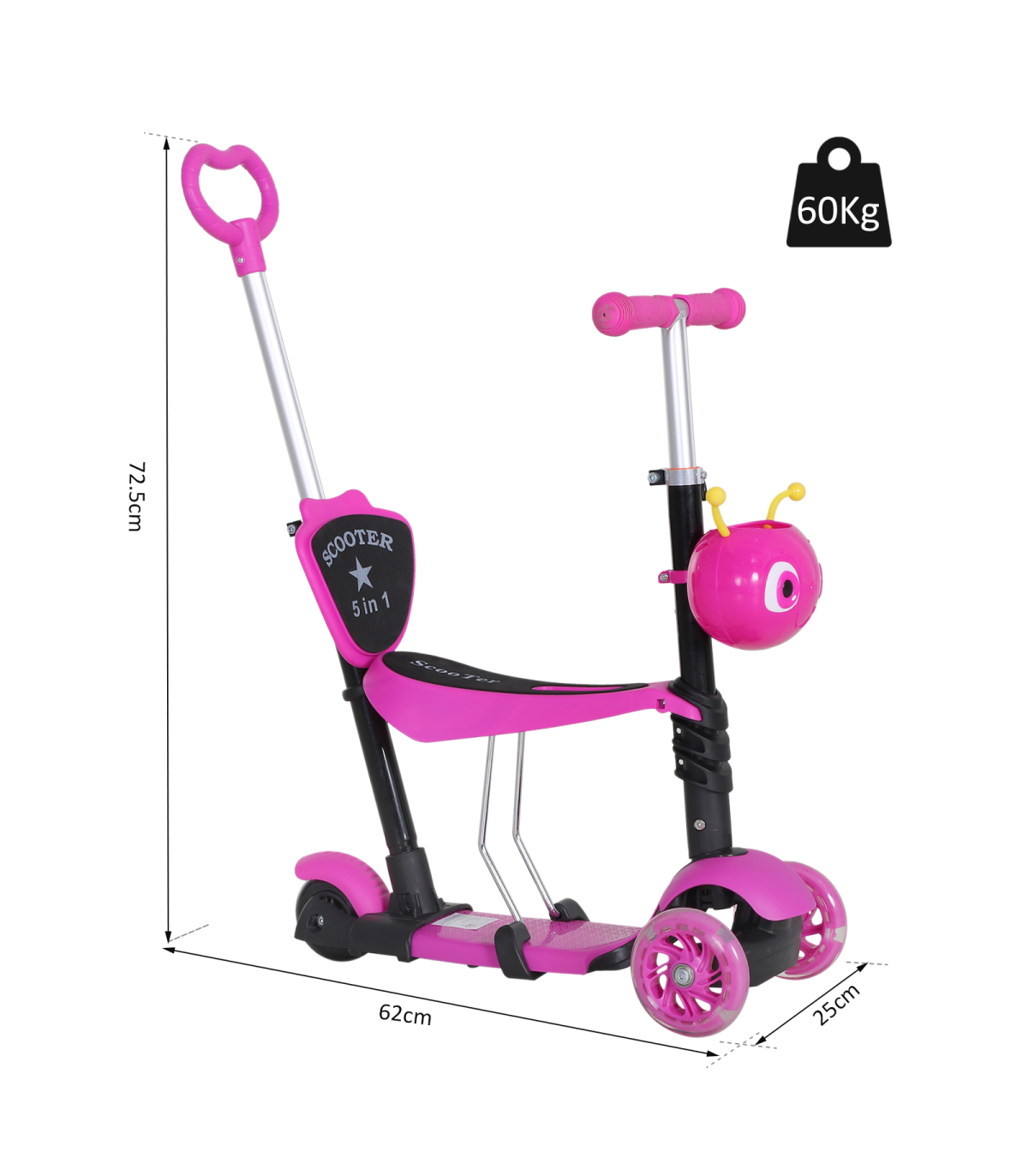 - MULTI-FUNCTION: The 5-in-1 scooter has a removable seat and pushing handle - ADJUSTABLE HEIGHT: 3-level height adjustable pushing handle and handlebars - LEAN-TO-STEER: Lean-to-steer technology for balance and coordination - DURABLE CONSTRUCTION: Reinforced aluminum alloy frame, 3-wheel set-up - DIMENSIONS: 62L x 25W x 72.5H cm, Weight Capacity: 60 kg This 5-in-1 Kids Baby Toddler Kick Scooter with a removable seat and height adjustable features is perfect for children aged 1-8 years. The scooter can be transformed from a parent-controlled push scooter to a fully independent scooter as the child grows. The lean-to-steer technology helps in developing balance and coordination skills. Made from a reinforced aluminum alloy frame, this scooter is sturdy and stable. The small front animal-shaped basket adds a fun element for kids to store their toys or snacks while riding. - Dimensions: 62L x 25W x 72.5H cm - Weight: 3.90 kg - Color: Pink
