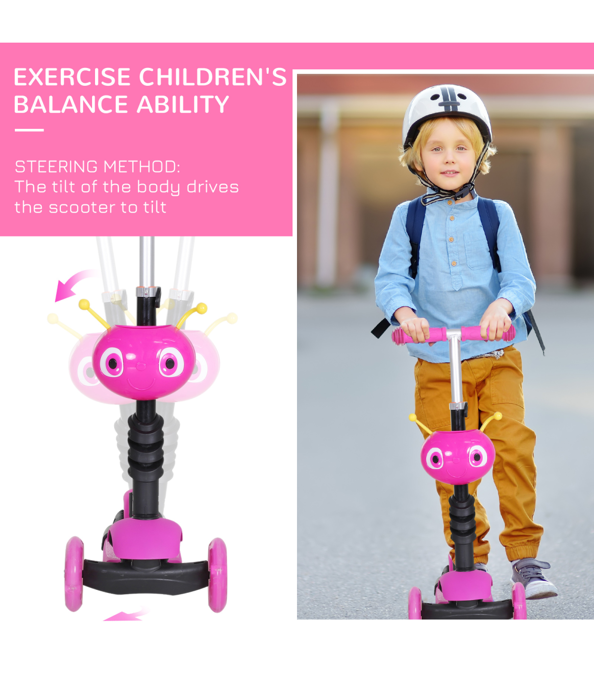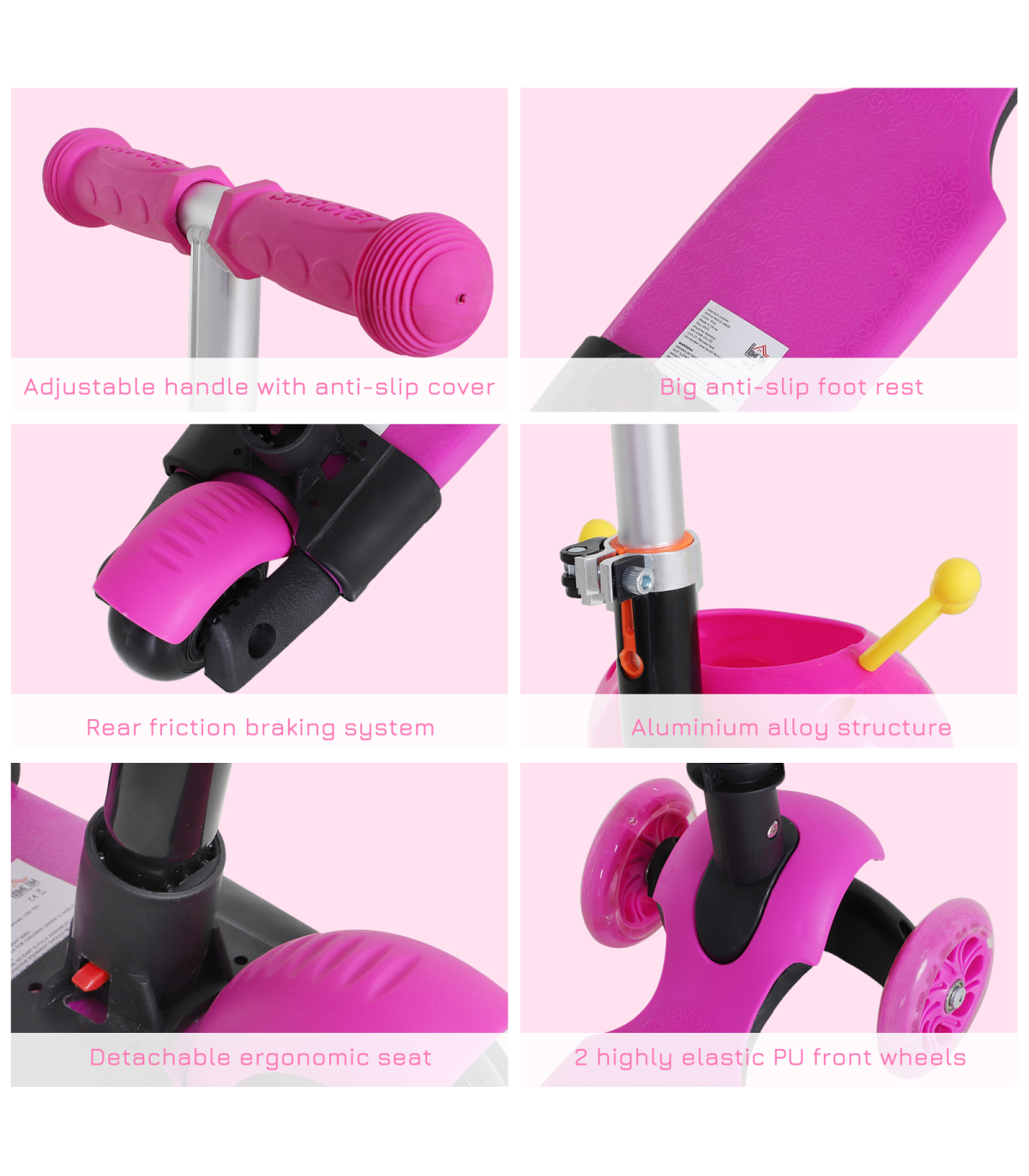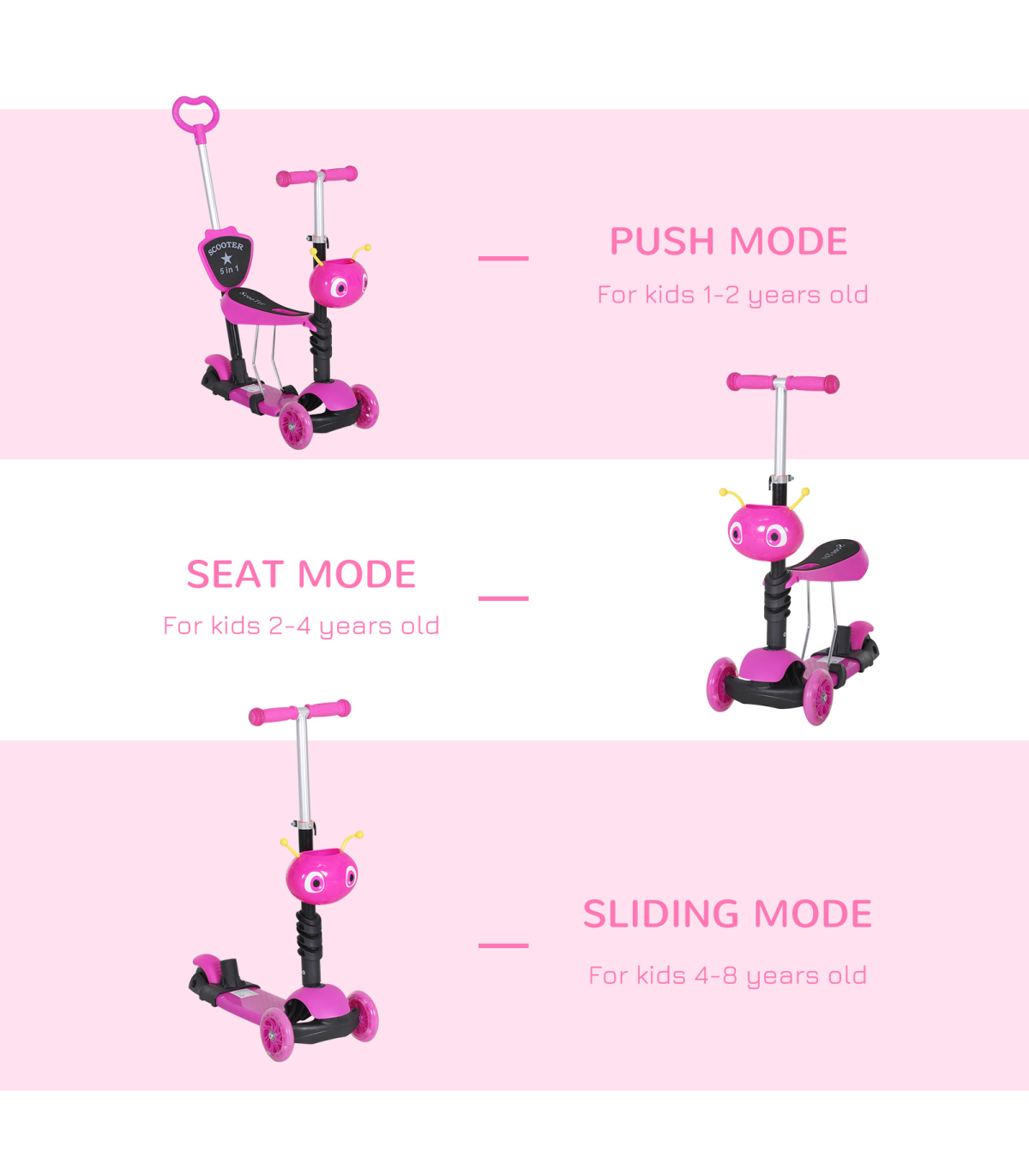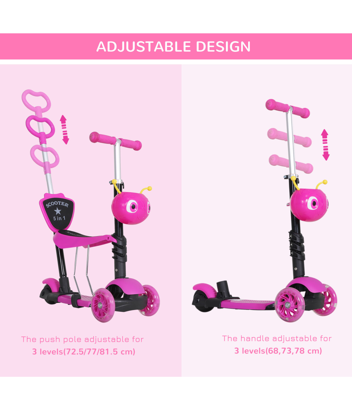 - MULTI-FUNCTION: The 5-in-1 scooter has a removable seat and pushing handle - ADJUSTABLE HEIGHT: 3-level height adjustable pushing handle and handlebars - LEAN-TO-STEER: Lean-to-steer technology for balance and coordination - DURABLE CONSTRUCTION: Reinforced aluminum alloy frame, 3-wheel set-up - DIMENSIONS: 62L x 25W x 72.5H cm, Weight Capacity: 60 kg This 5-in-1 Kids Baby Toddler Kick Scooter with a removable seat and height adjustable features is perfect for children aged 1-8 years. The scooter can be transformed from a parent-controlled push scooter to a fully independent scooter as the child grows. The lean-to-steer technology helps in developing balance and coordination skills. Made from a reinforced aluminum alloy frame, this scooter is sturdy and stable. The small front animal-shaped basket adds a fun element for kids to store their toys or snacks while riding. - Dimensions: 62L x 25W x 72.5H cm - Weight: 3.90 kg - Color: Pink