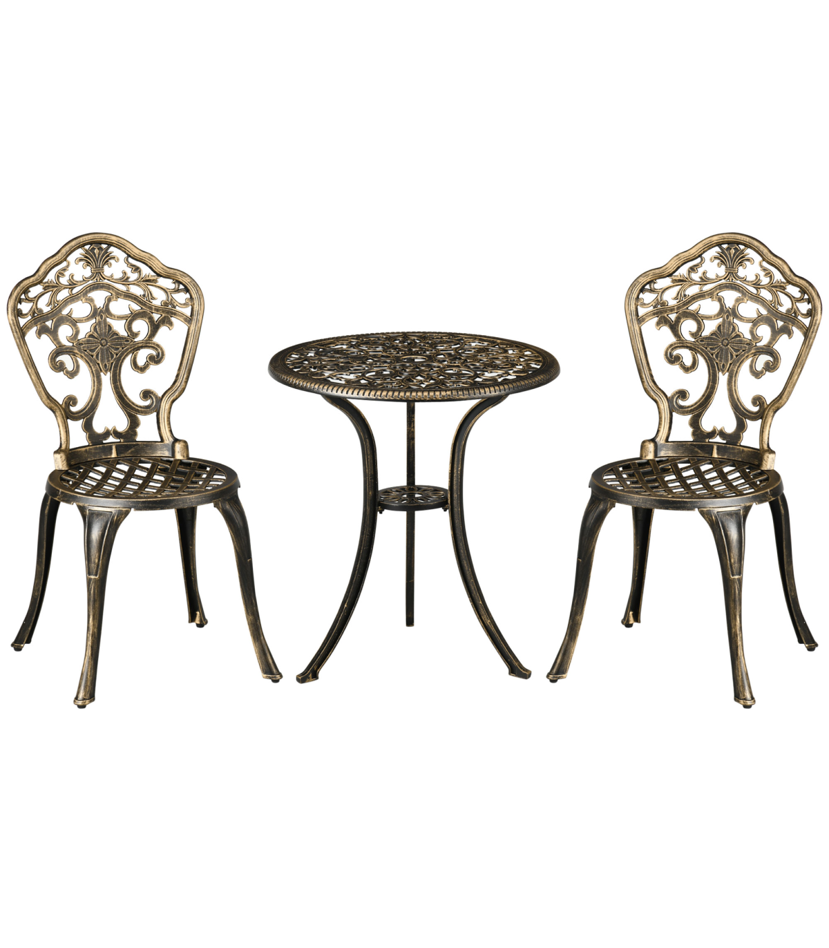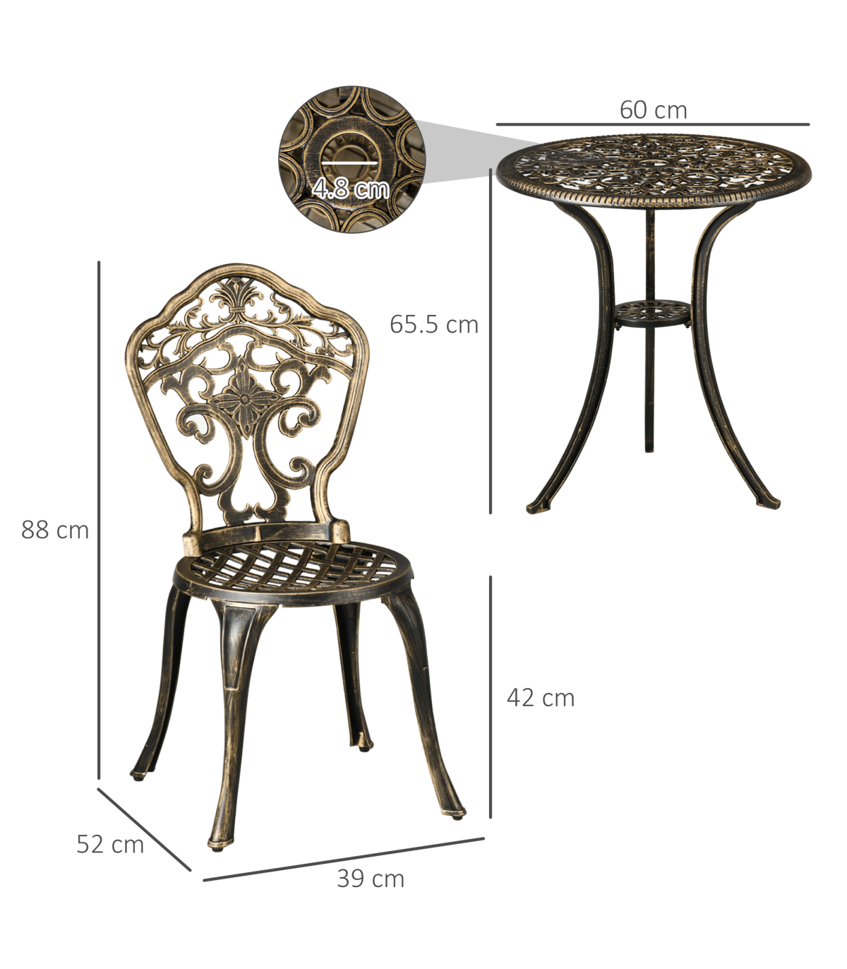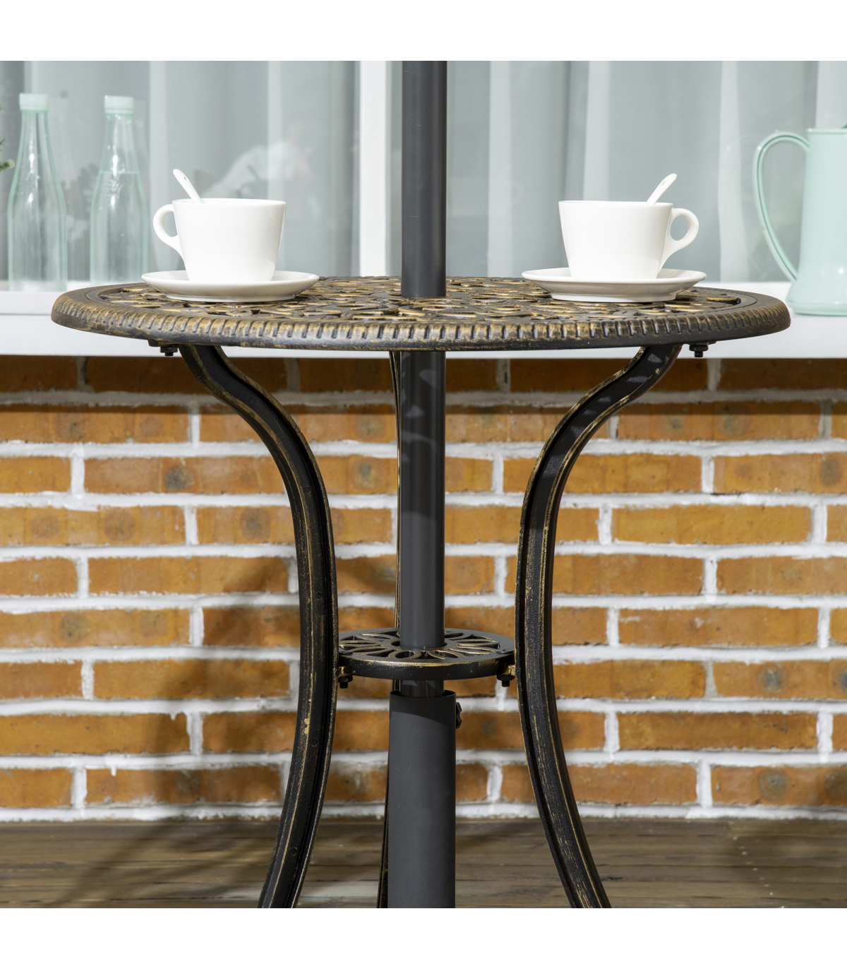 Add a touch of elegance to your garden or patio with this 3 Piece Cast Aluminium Garden Bistro Set. The set includes two armless chairs and a matching round table, providing a perfect spot to relax and unwind in style. The table features a 48mm umbrella hole in the center, allowing you to add a parasol for shade on sunny days (parasol not included). Made of cast aluminium, this bistro set is durable, rust-resistant, and finished in a chic bronze tone paint. The adjustable feet with anti-slip pads ensure stability and prevent slipping. Assembly is required.