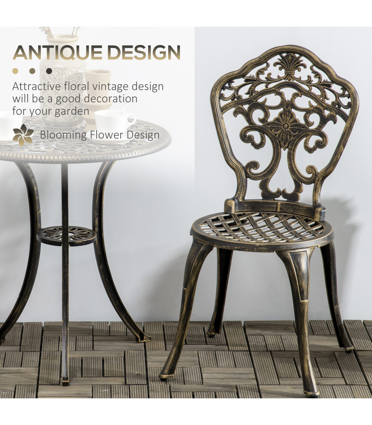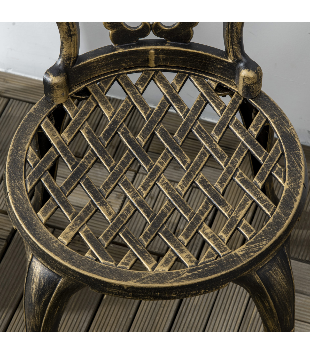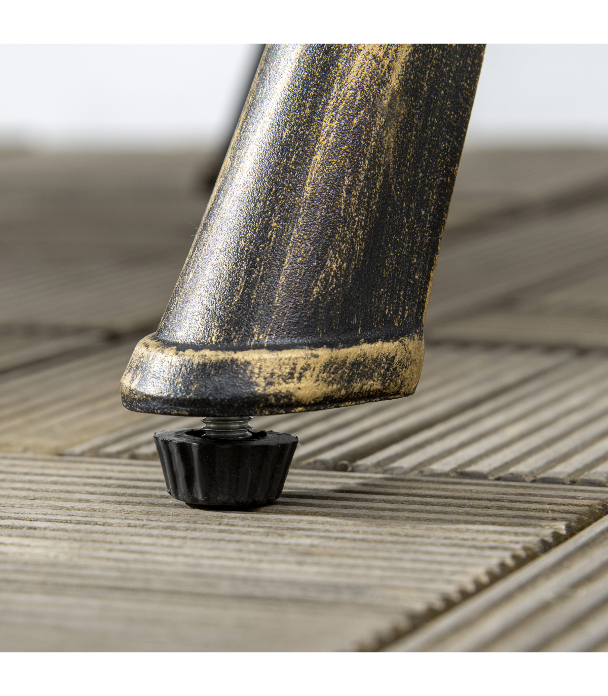 Add a touch of elegance to your garden or patio with this 3 Piece Cast Aluminium Garden Bistro Set. The set includes two armless chairs and a matching round table, providing a perfect spot to relax and unwind in style. The table features a 48mm umbrella hole in the center, allowing you to add a parasol for shade on sunny days (parasol not included). Made of cast aluminium, this bistro set is durable, rust-resistant, and finished in a chic bronze tone paint. The adjustable feet with anti-slip pads ensure stability and prevent slipping. Assembly is required.