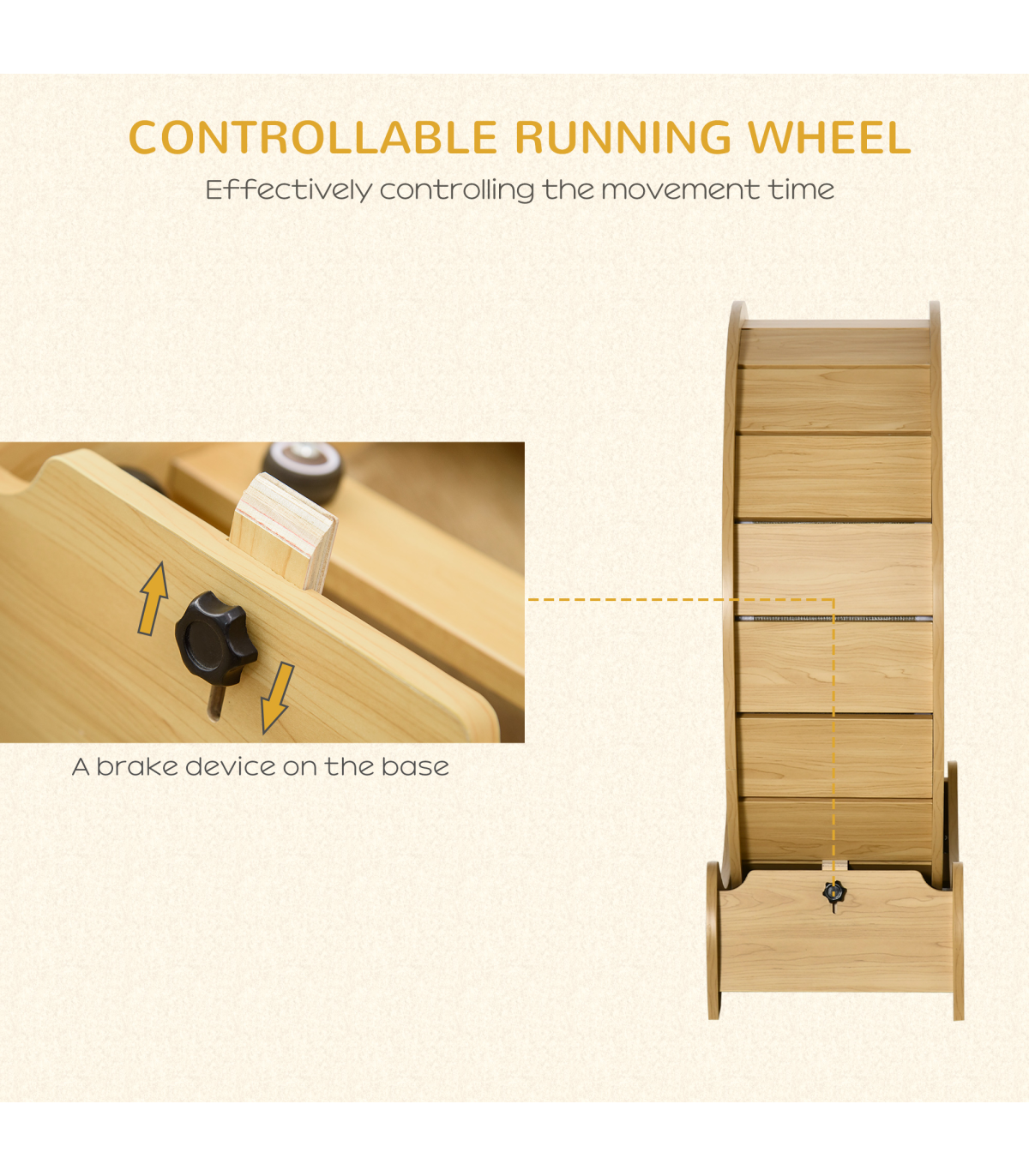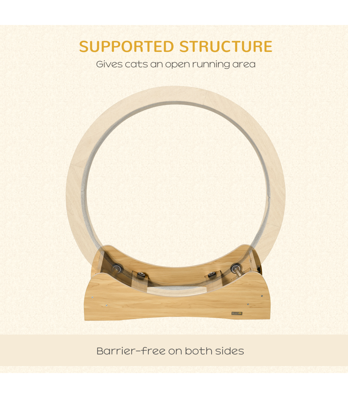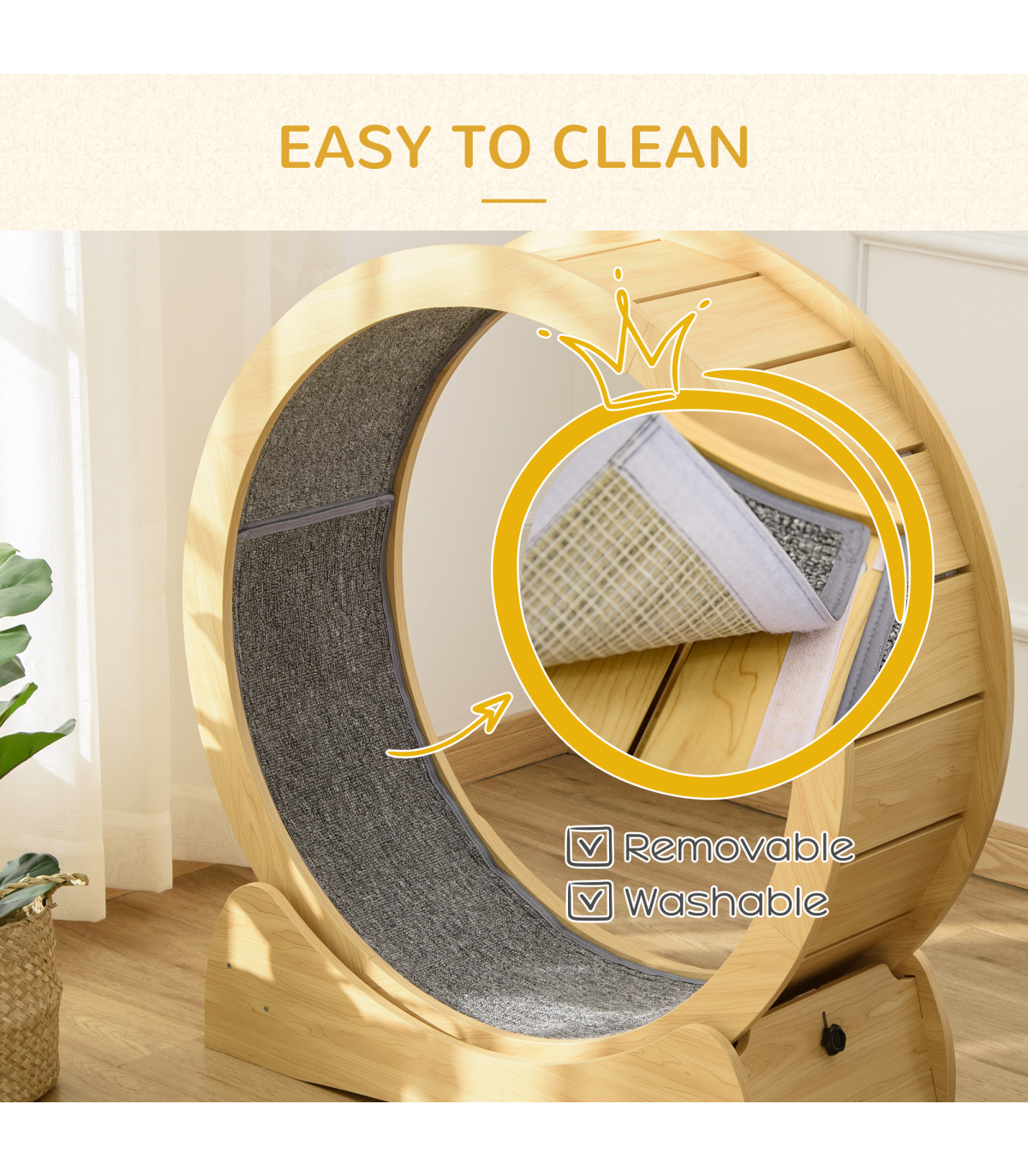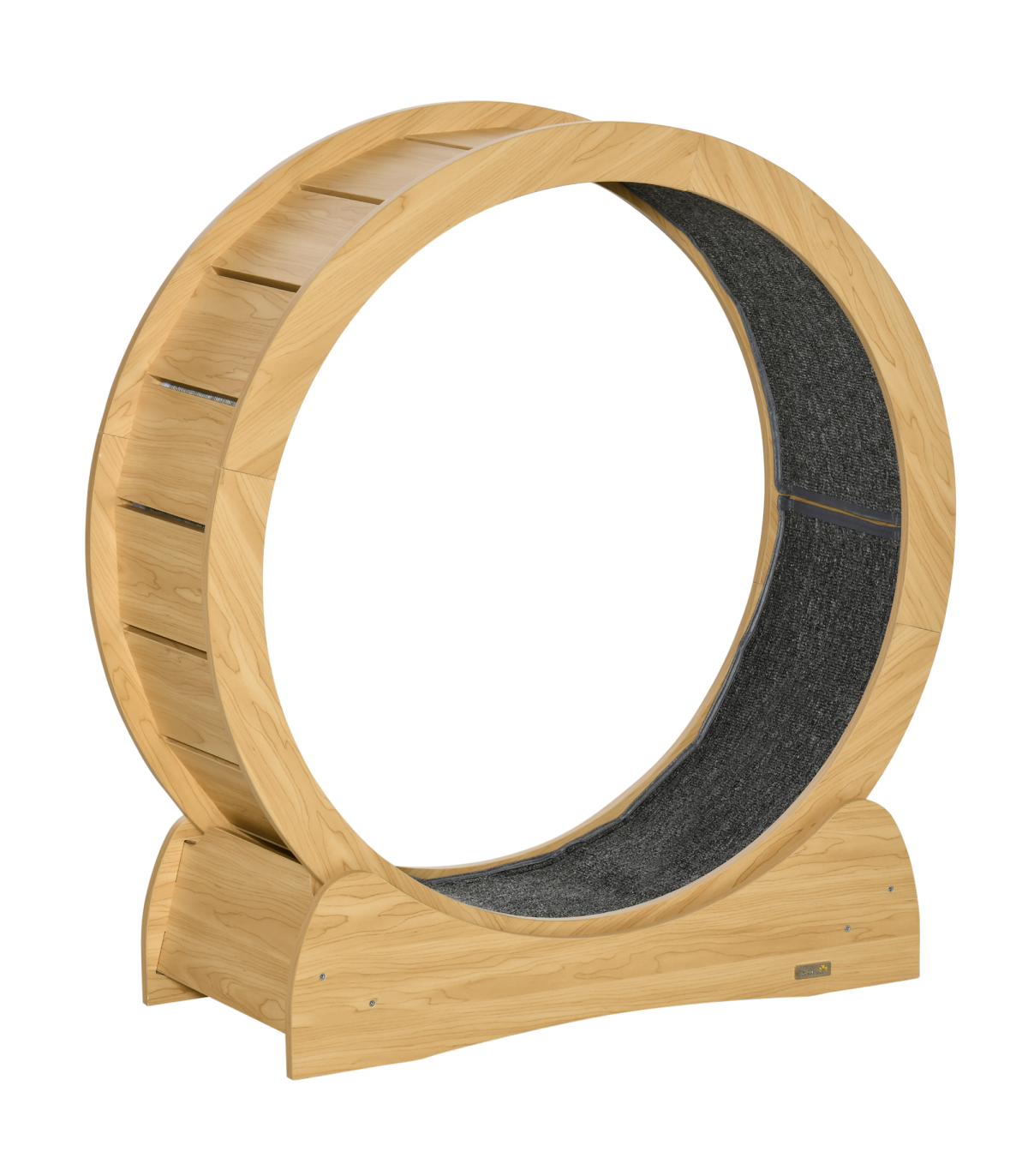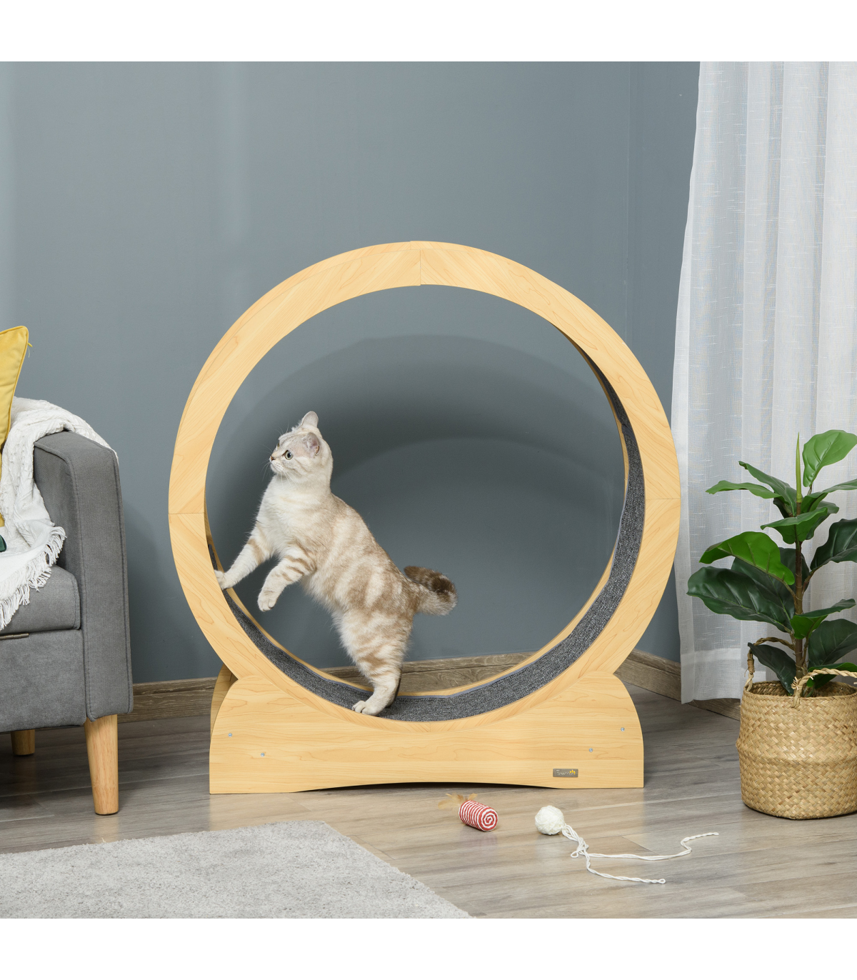 Even at home, cats can stay active and heathy, thanks to this PawHut cat exercise wheel. The inside is covered with a cloth-like material ? it's soft on their paws, keeping them comfortable when running. There's a brake on the base to stop the running wheel when needed ? and when they're feeling active again, just turn it back on. A natural wood grain piece, its minimalistic appearance blends nicely with any decoration. Perfect for house cats, they can exercise at home.