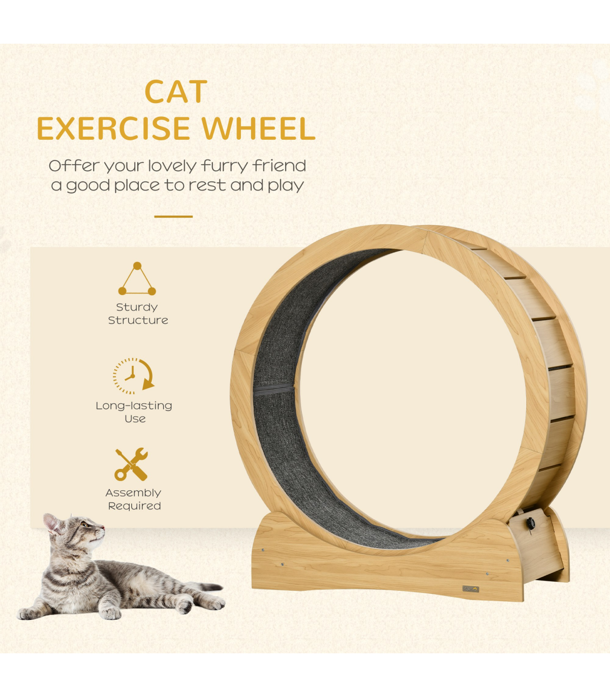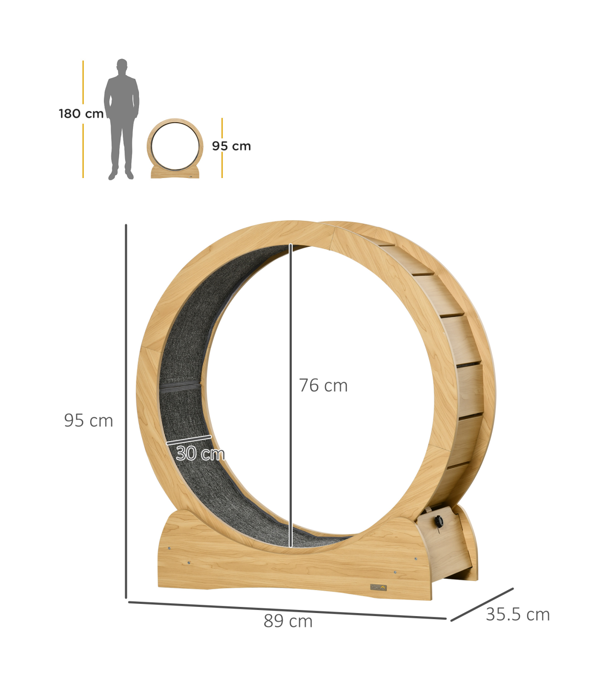 Cat exercise wheel: A fun activity that keeps pets healthy and happy.Comfortable: The inside of this cat running wheel is covered with a cloth-like material, which is soft on their paws.Brake included: Placed on the base, it will stop this cat wheel when needed. Switch the brake off when pets want to run again.Natural wood grain appearance: A simple, yet elegant design, blending perfectly with existing decoration ? this cat treadmill wheel won't look out of place when set up.Dimensions: 95H x 89L x 35.5Wcm. Running wheel diameter: �76cm. Width: 30cm. Assembly required.