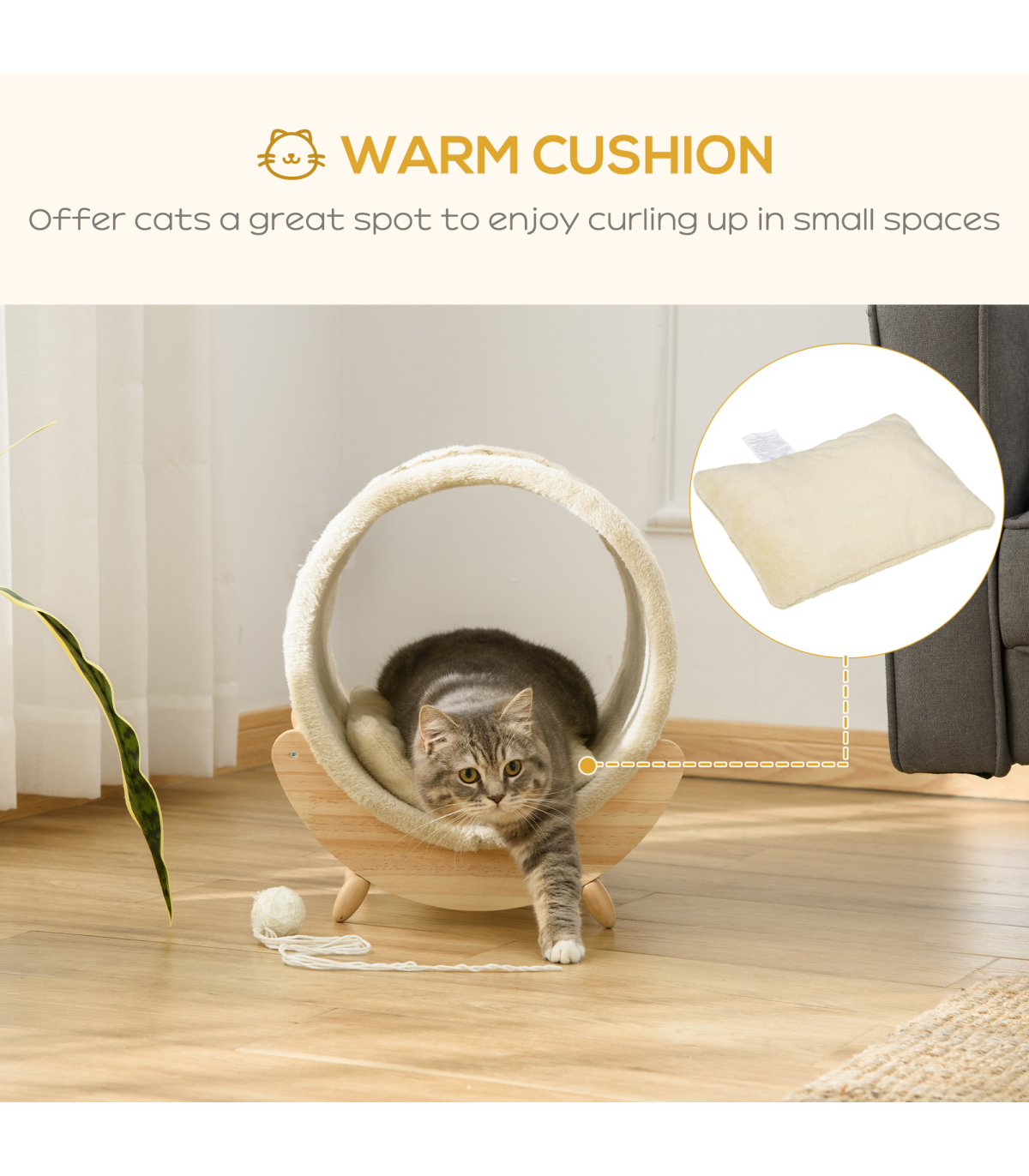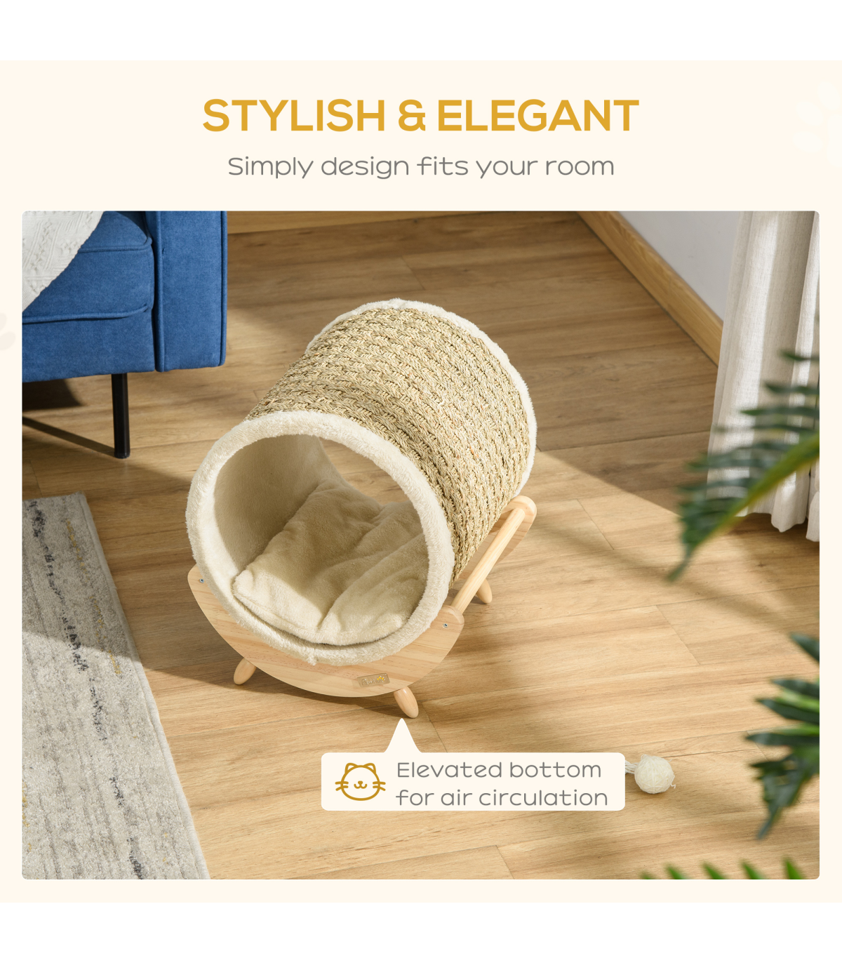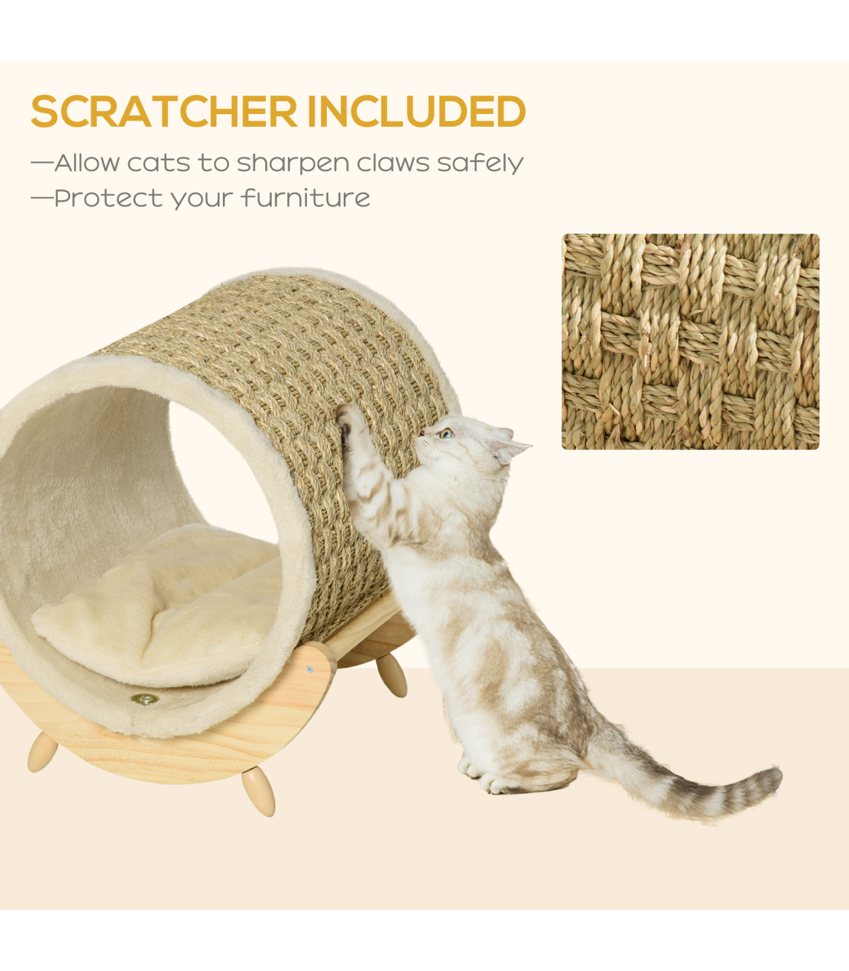 - "Elevated Cat House Kitten Bed Pet Shelter with Scratcher Cushion, Beige" - Description: - A clean, modern design that complements your home décor - Spacious cat bed basket - plenty of room for resting and playing - Strong Pine wood frame makes it stable and durable - Soft cushion inside for extra comfort - Scratcher lets your cat sharpen their claws, deterring them away from using your furniture - Elevated design lets air circulate underneath - Suitable for pets under 5kg - Assembly required