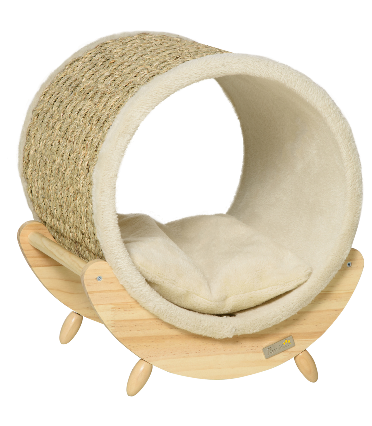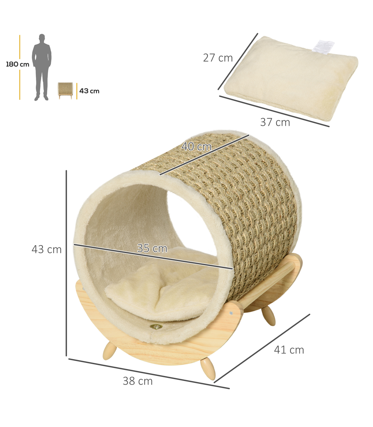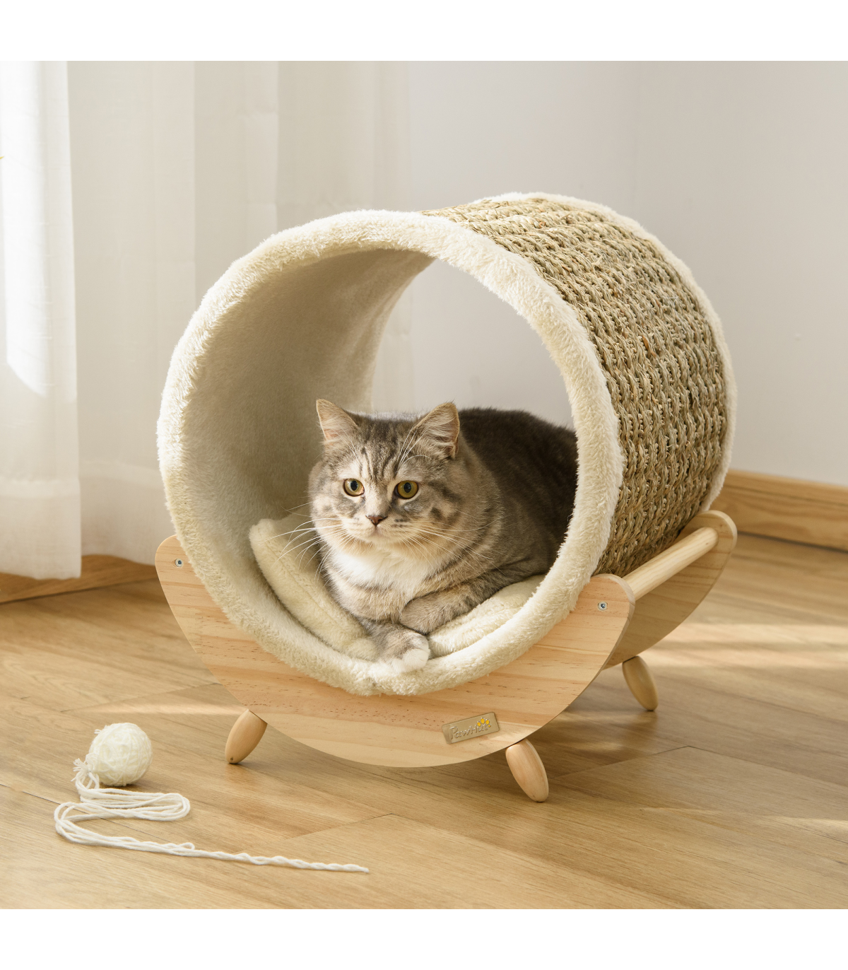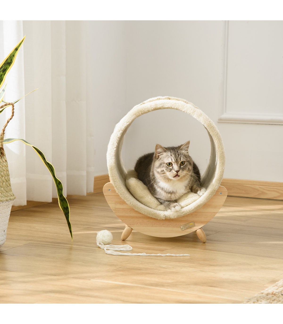 - "Elevated Cat House Kitten Bed Pet Shelter with Scratcher Cushion, Beige" - Description: - A clean, modern design that complements your home décor - Spacious cat bed basket - plenty of room for resting and playing - Strong Pine wood frame makes it stable and durable - Soft cushion inside for extra comfort - Scratcher lets your cat sharpen their claws, deterring them away from using your furniture - Elevated design lets air circulate underneath - Suitable for pets under 5kg - Assembly required