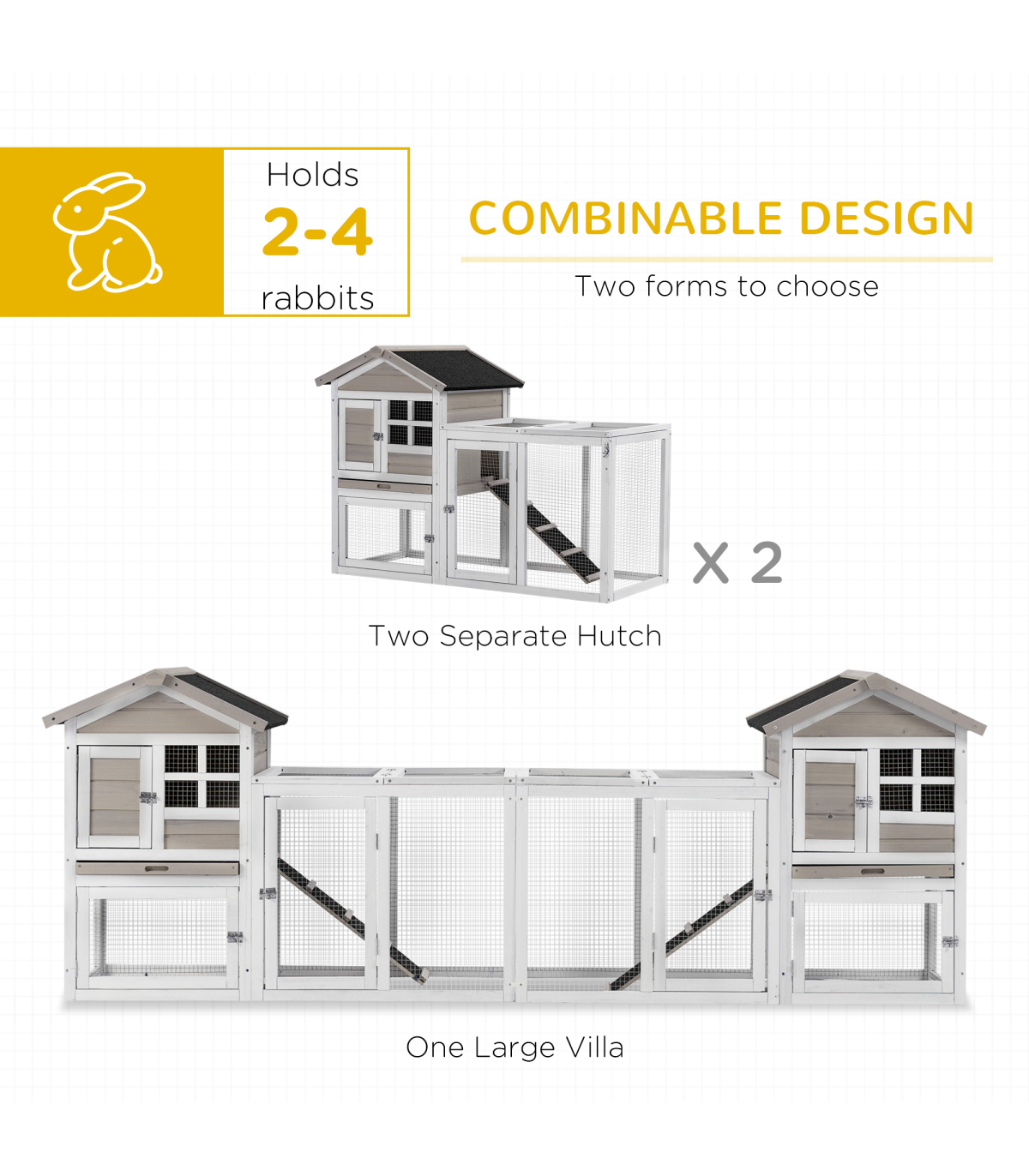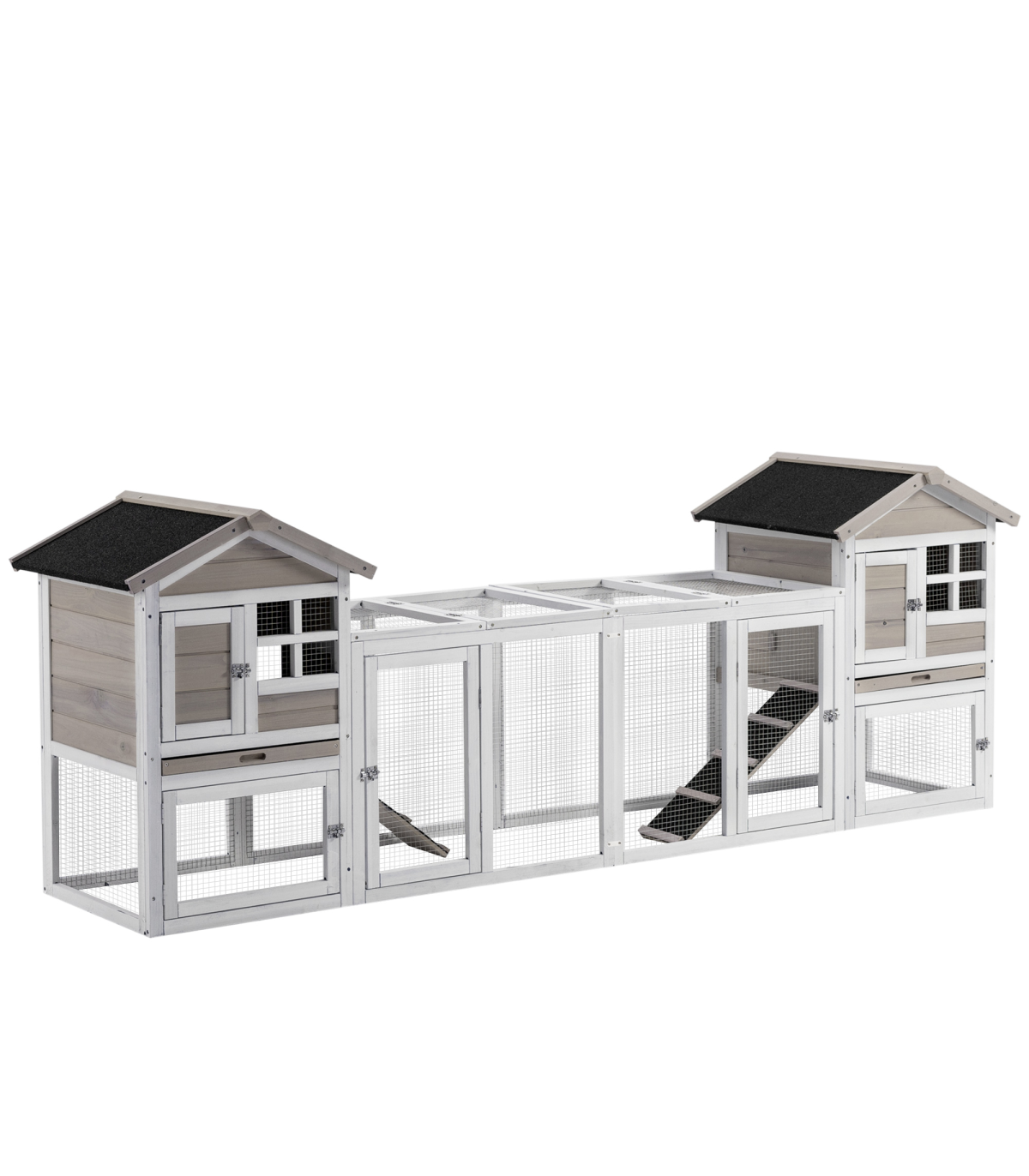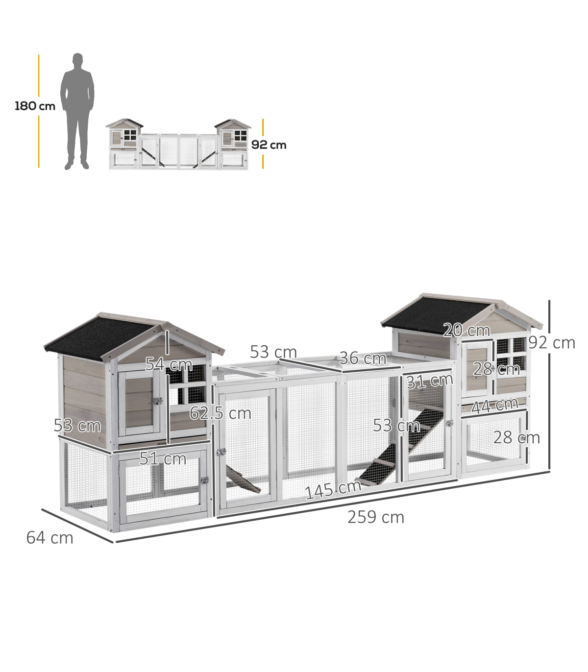 - Colour: White, Grey, Black - Material: Fir, Steel Wire, Asphalt - Overall Dimension: 259L x 64W x 92H cm - Living House Dimension: 51L x 53W x 54H cm - Living House Door Size: 20L x 28H cm - Run Boxes Sizes (under the main house): 51L x 53W x 36.5H cm, Door: 44L x 28H cm - Run Box Size (Middle): 145L x 53W x 62.5H cm, Door: 31L x 53H cm(front), 53L x 36H cm(top) - Ramp Size: 58L x 17W cm - Tray Size: 44.5L x 51W cm - Suitable for 2-4 rabbits - Item Label: D51-301V01GY