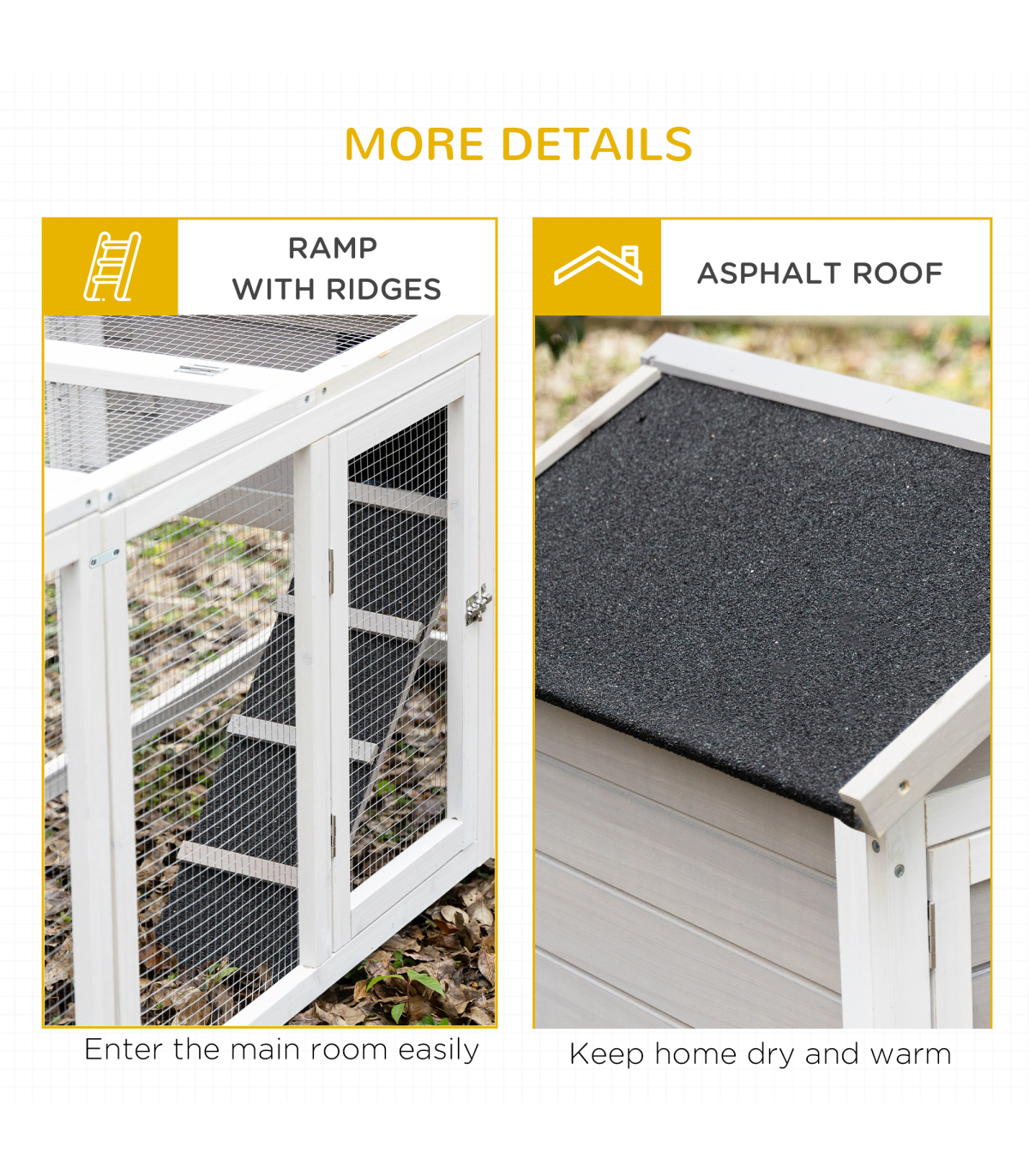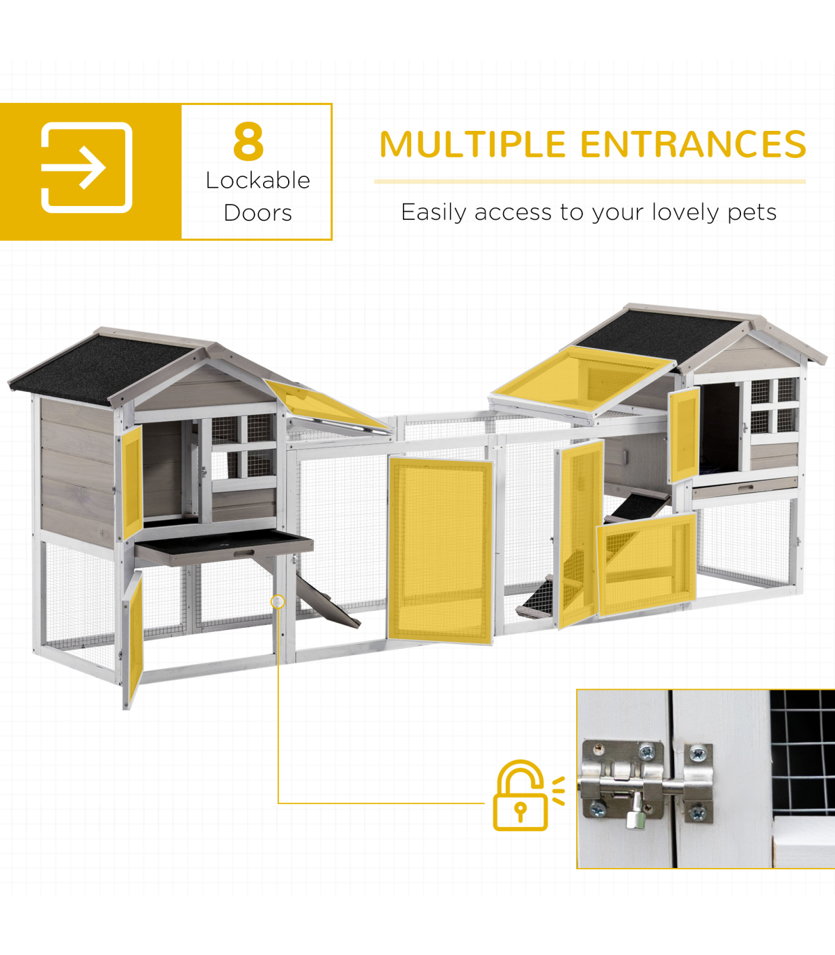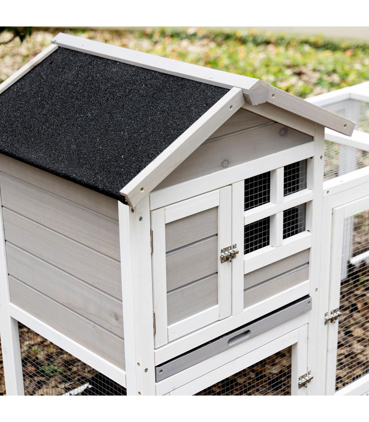 - Colour: White, Grey, Black - Material: Fir, Steel Wire, Asphalt - Overall Dimension: 259L x 64W x 92H cm - Living House Dimension: 51L x 53W x 54H cm - Living House Door Size: 20L x 28H cm - Run Boxes Sizes (under the main house): 51L x 53W x 36.5H cm, Door: 44L x 28H cm - Run Box Size (Middle): 145L x 53W x 62.5H cm, Door: 31L x 53H cm(front), 53L x 36H cm(top) - Ramp Size: 58L x 17W cm - Tray Size: 44.5L x 51W cm - Suitable for 2-4 rabbits - Item Label: D51-301V01GY