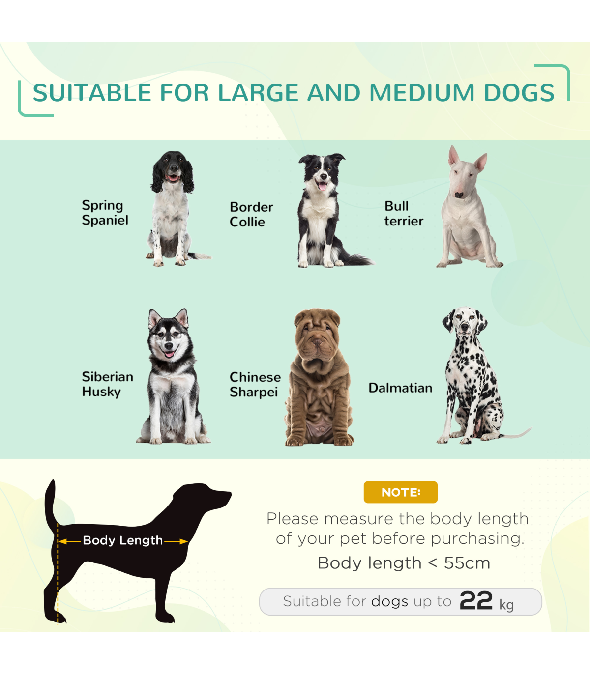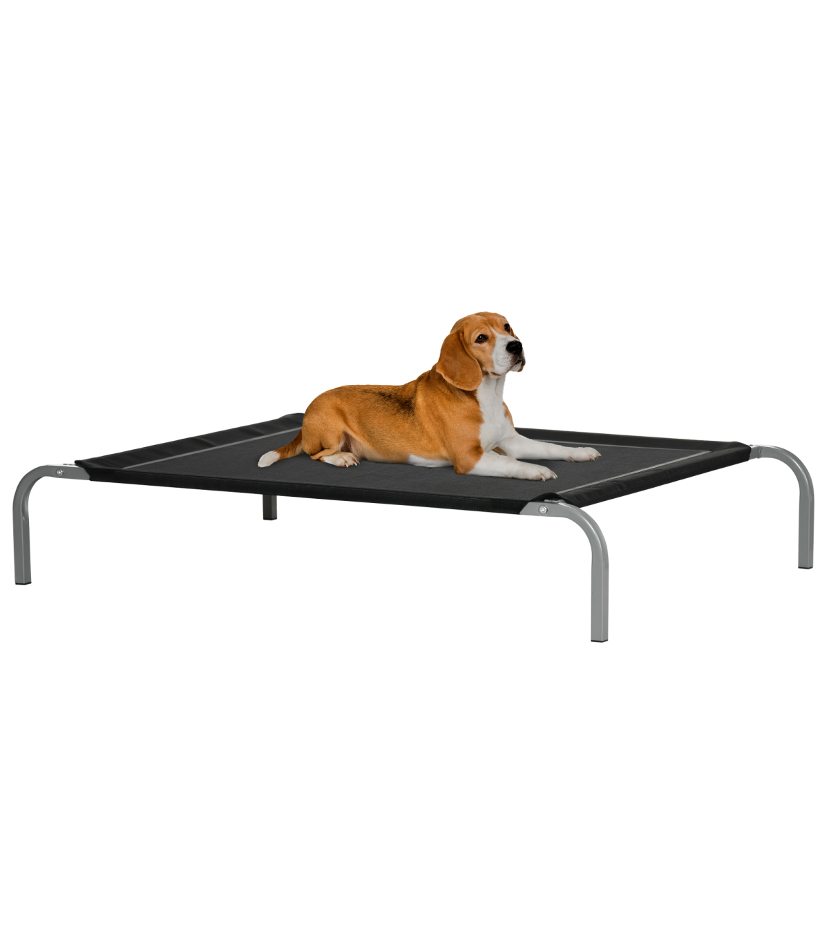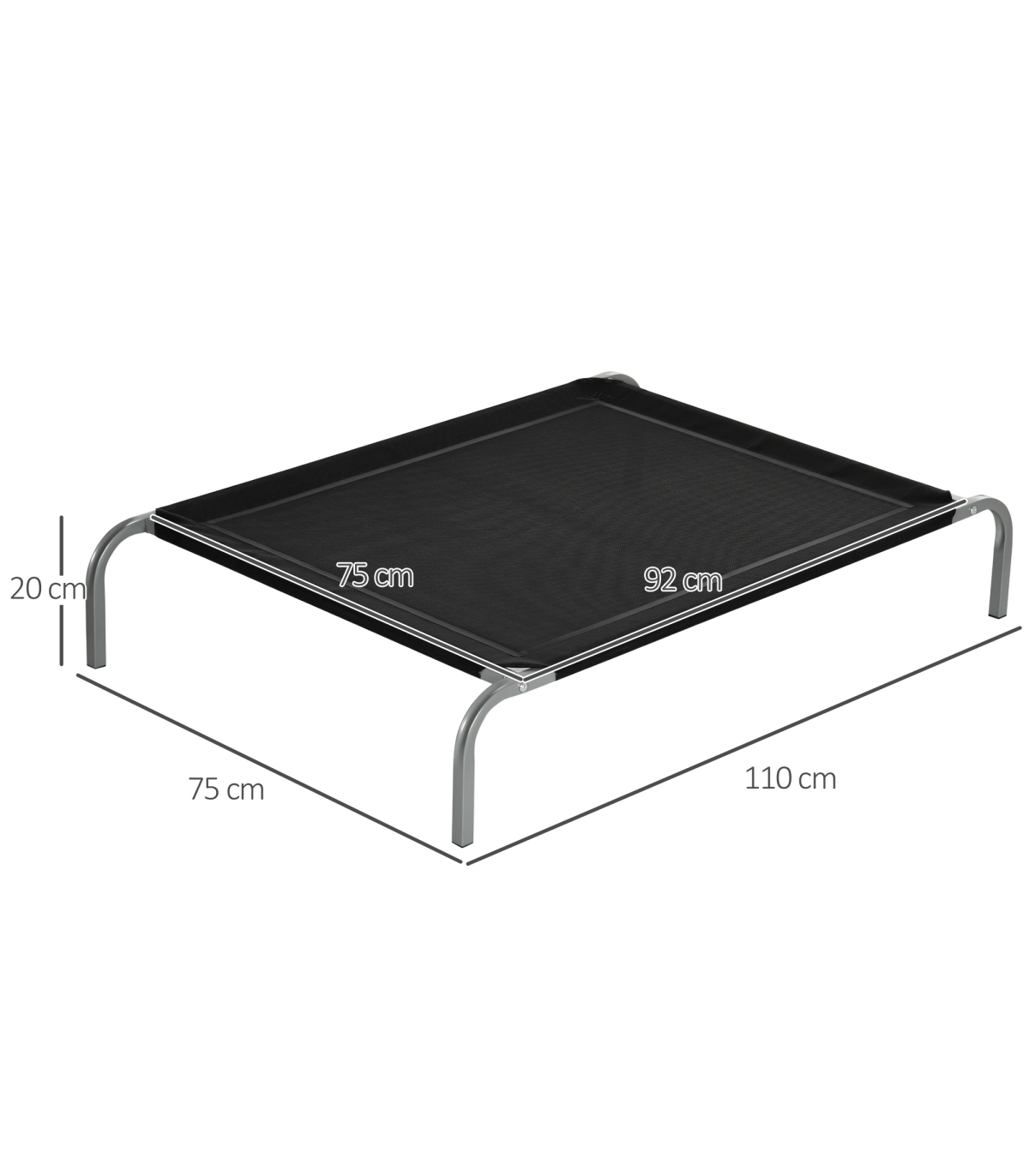 - Cooling Pet Bed Elevated Dog Bed with Non-slip Pads for Large Dogs by Pawhut - Description: - Raised dog bed with four steel legs for balance and stability, ensuring pets' security while they relax. - Made with comfortable and breathable mesh fabric, providing a cozy spot for pets to unwind. - Easy to clean and suitable for outdoors, making it the ideal outside dog bed. - The steel frame is powder-coated to ensure strength and durability. - Non-slip pads are attached to the feet for extra stability. - Dimensions: 20H x 110L x 75Wcm. - Maximum load capacity: 22kg. - Assembly is required.