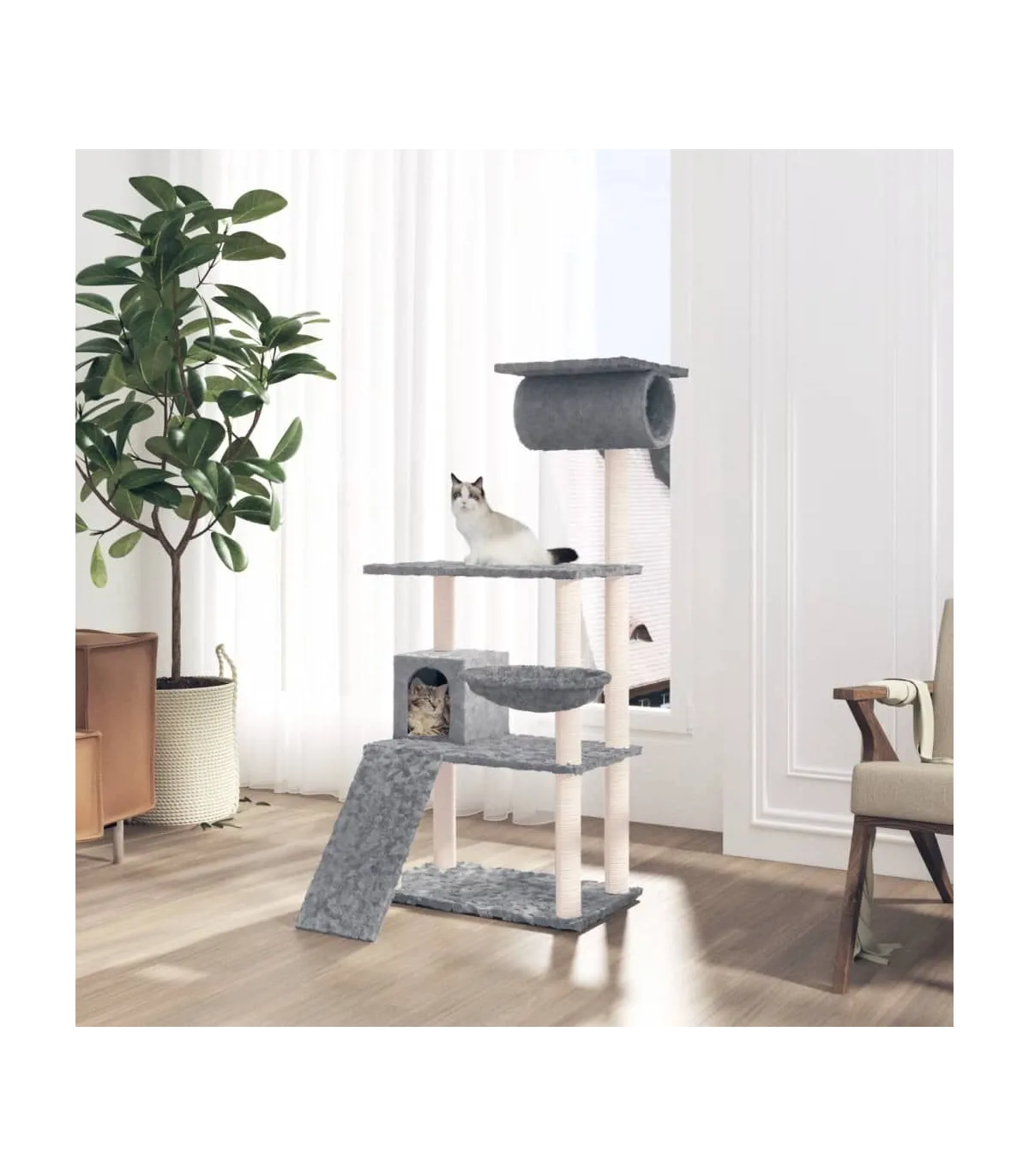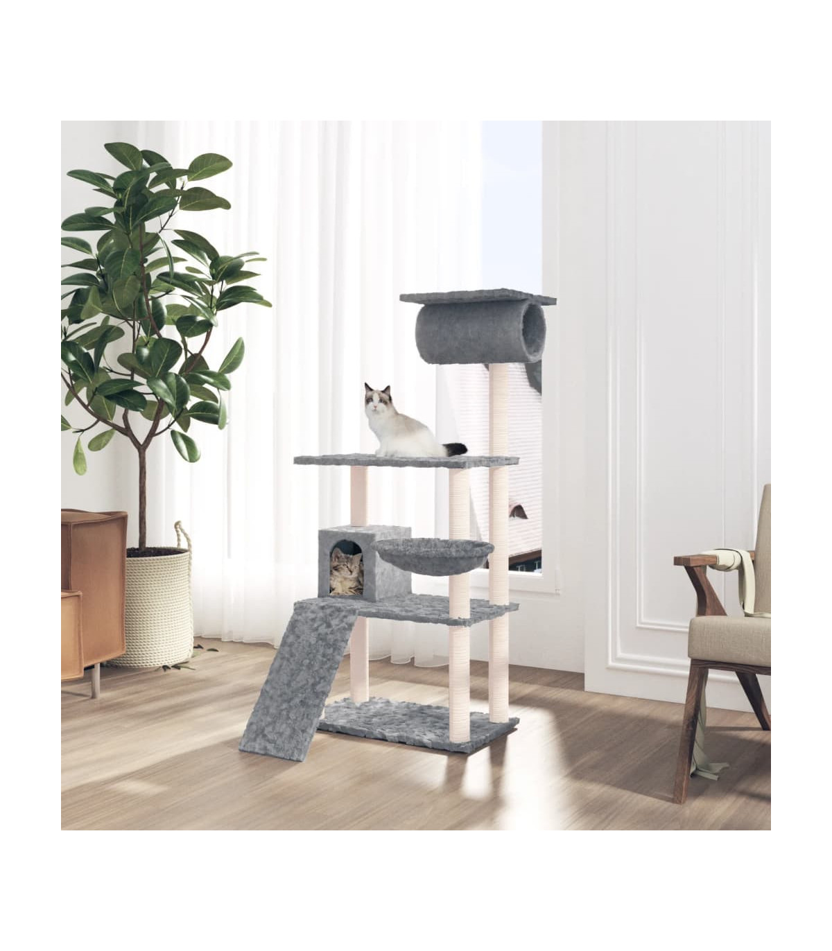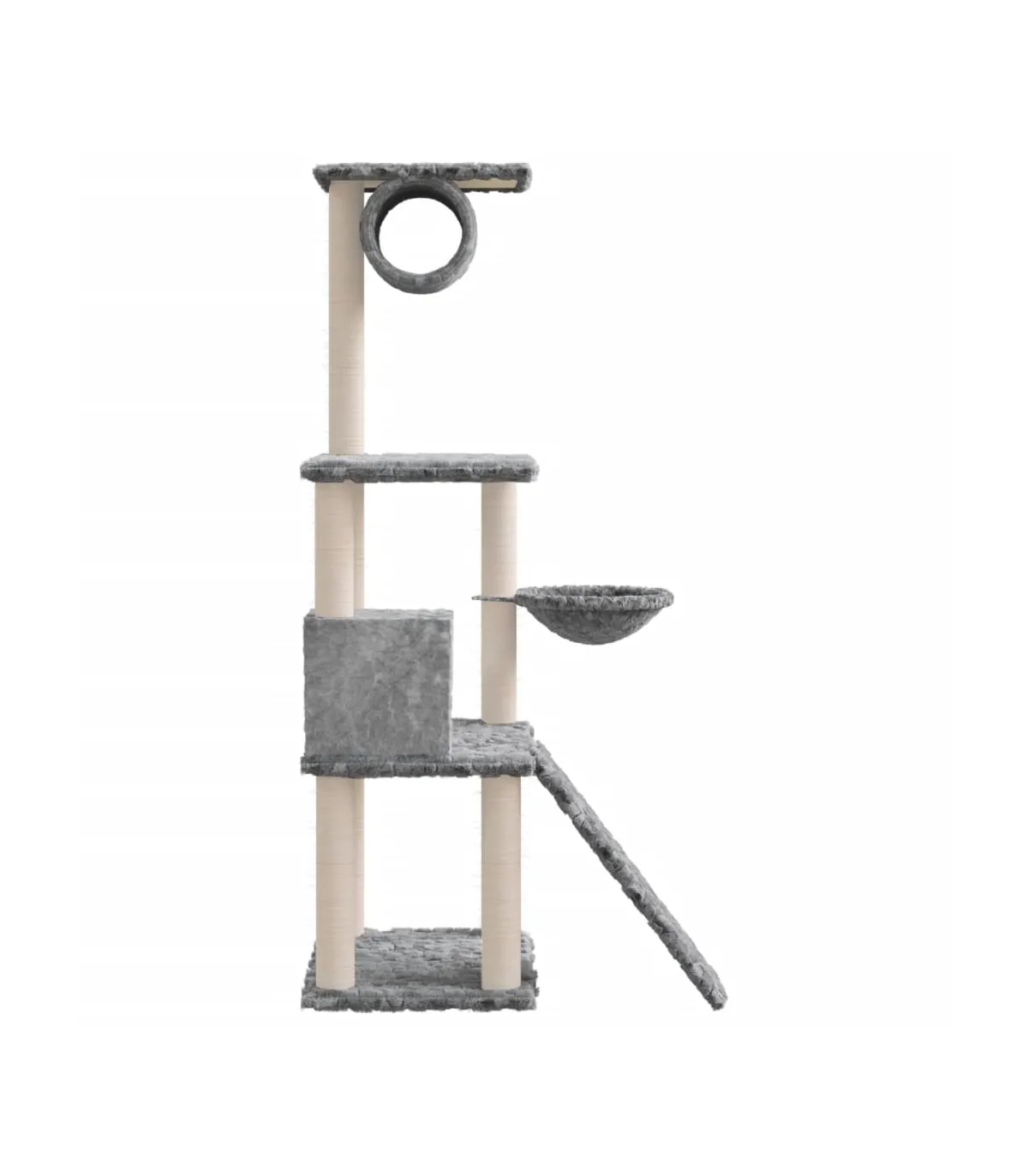 - Material: Engineered wood, plush, sisal