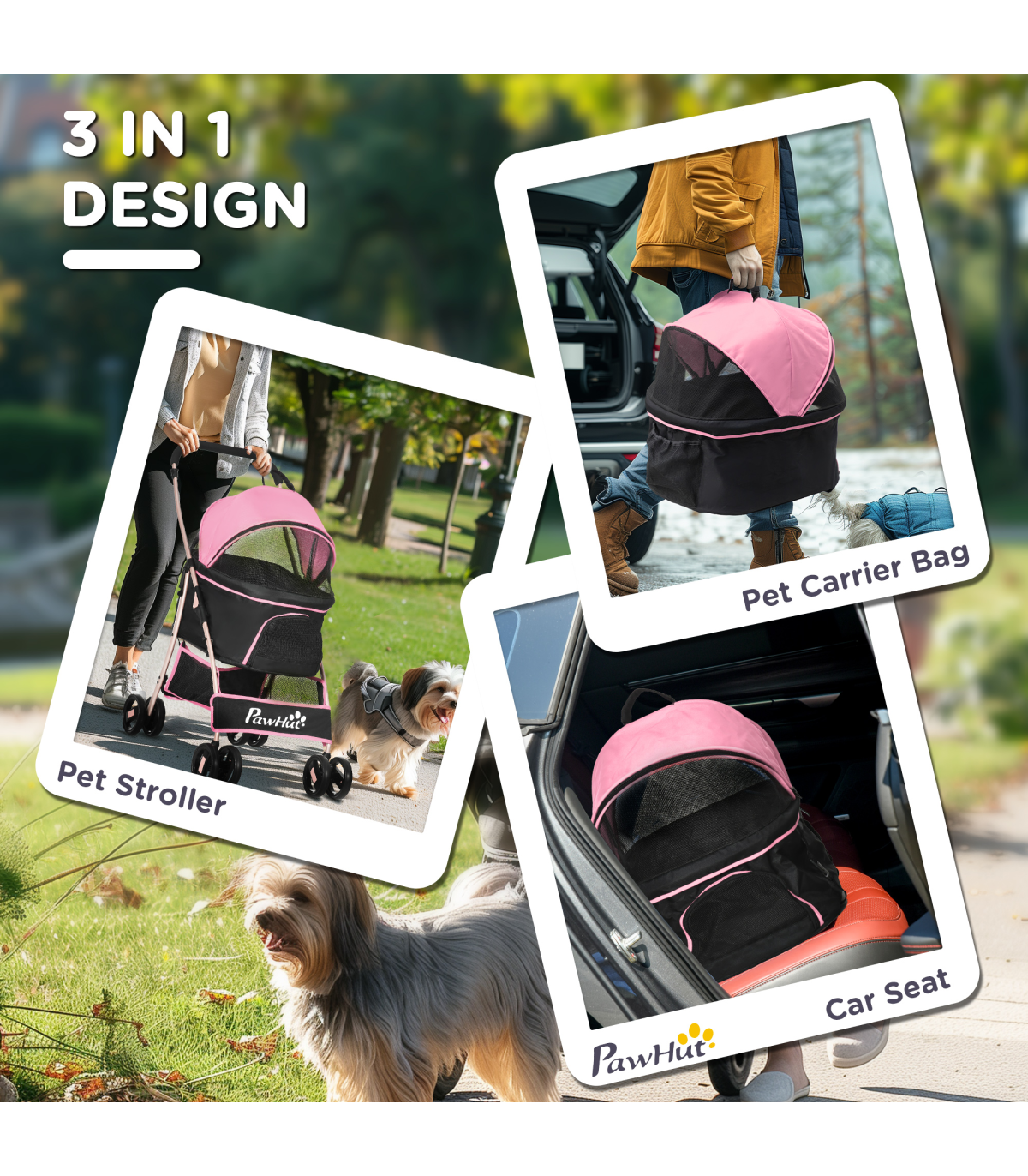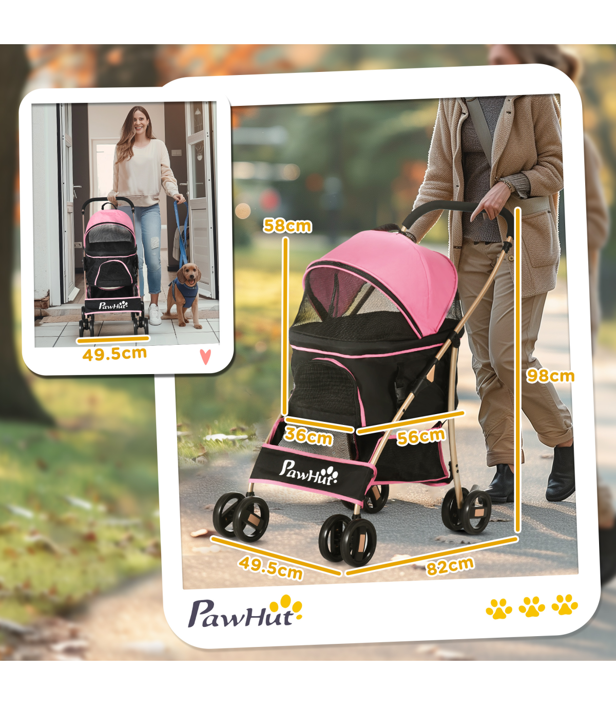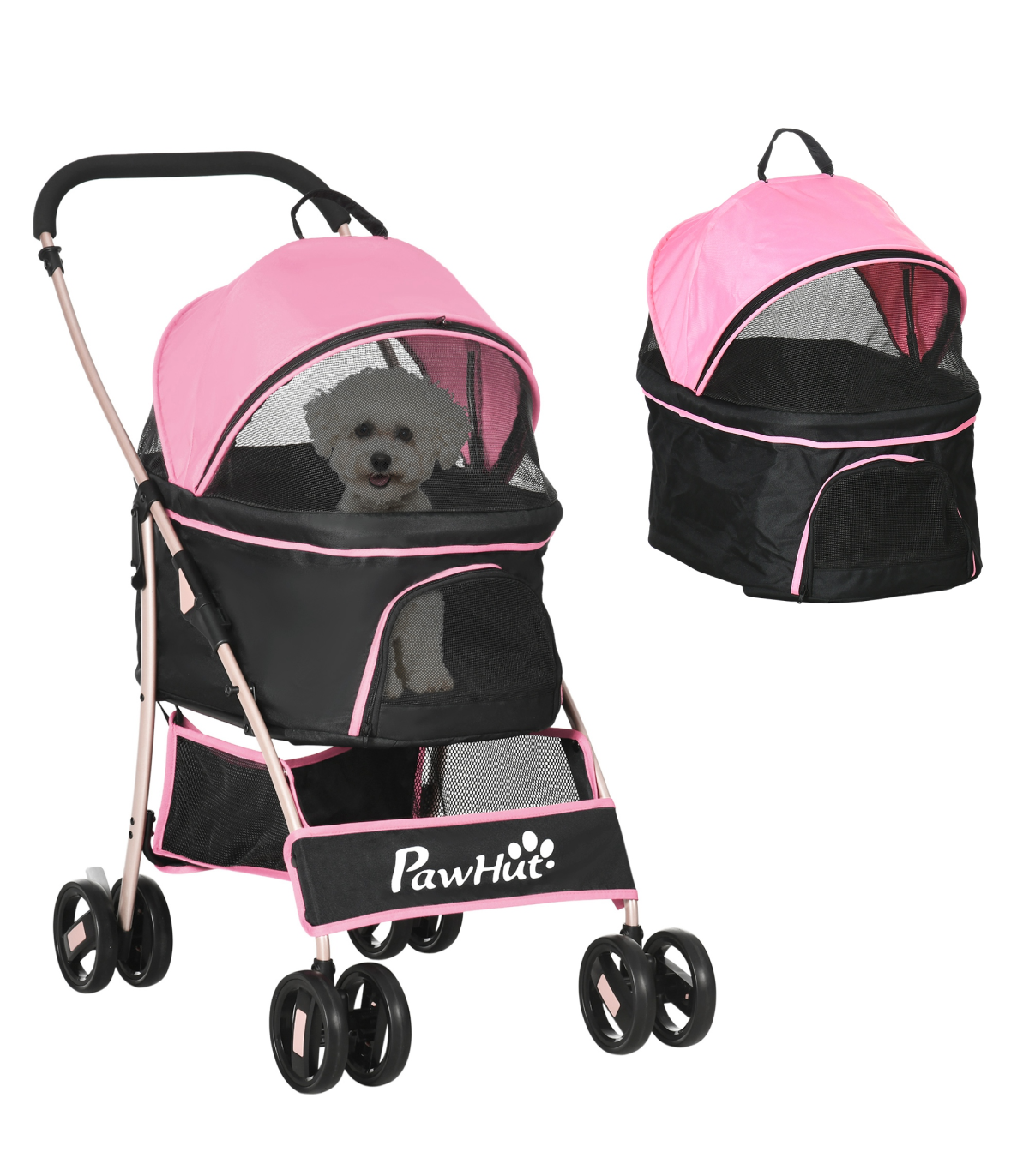 - "PawHut 3 In 1 Pet Stroller, Detachable Dog Cat Travel Carriage - Pink" - Description: - Versatile: Can be used as a stroller for dogs, carrying bag, or car seat. - Take it anywhere, so pets always have a comfortable and familiar space to relax in. - Smooth and safe: Two ?13.5cm EVA rear wheels with brakes, making it easy to park. - Two universal front wheels make the ride smooth. - Two safety leashes keep pets securely strapped in. - Solid frame: Made from steel, it's strong and sturdy. - The oxford cloth is durable and suitable for daily use. - Foldable: Easy to carry and store. - Includes a basket and storage bag to keep pet supplies and personal belongings. - Dimensions: - Overall: 98H x 82L x 49.5Wcm. - Inside (with canopy): 58H x 56L x 36Wcm. - Inside (without canopy): 27H x 56L x 36Wcm. - Suitable for extra small and small pets, which are less than 35cm in length and 10kg in weight.