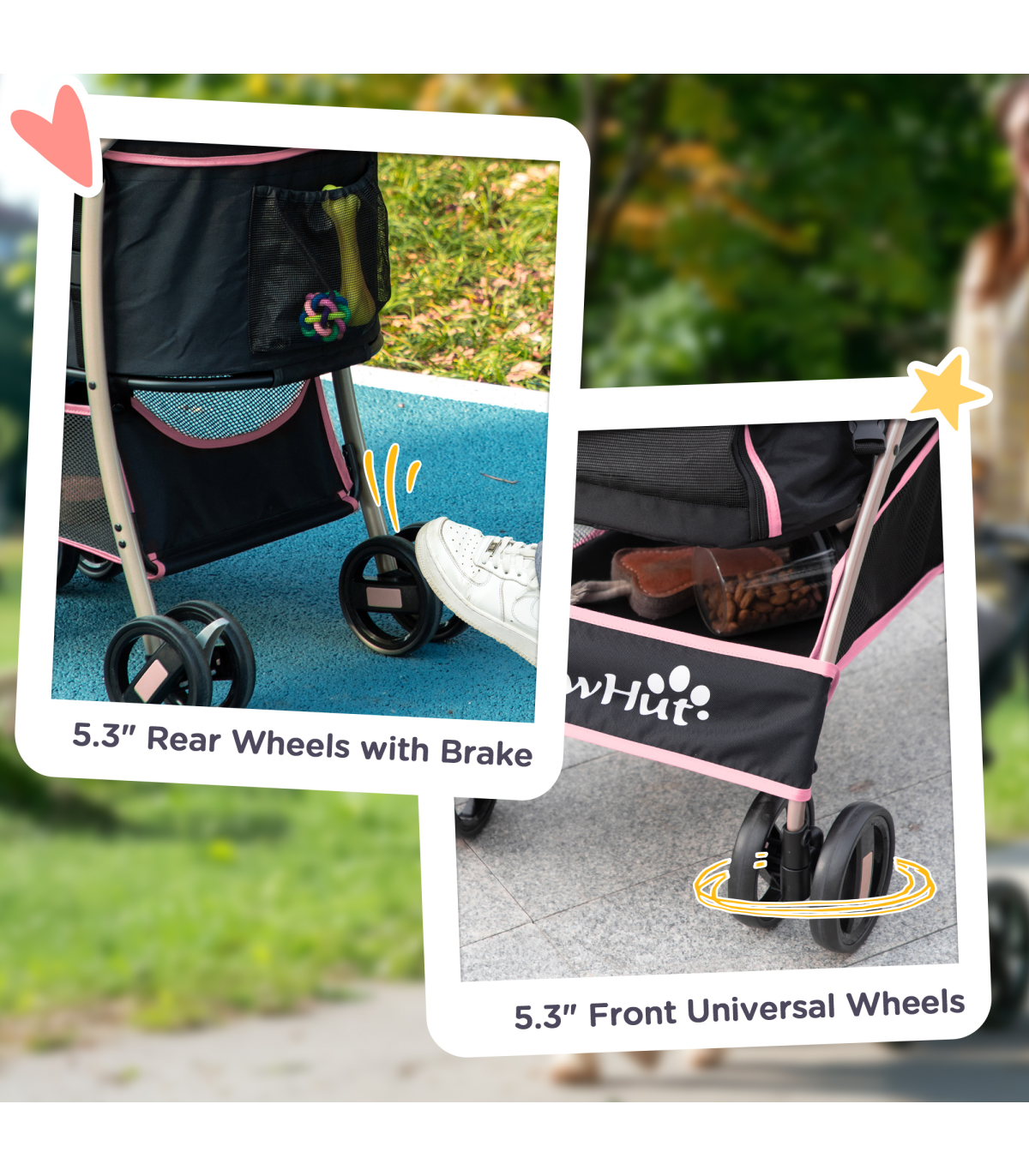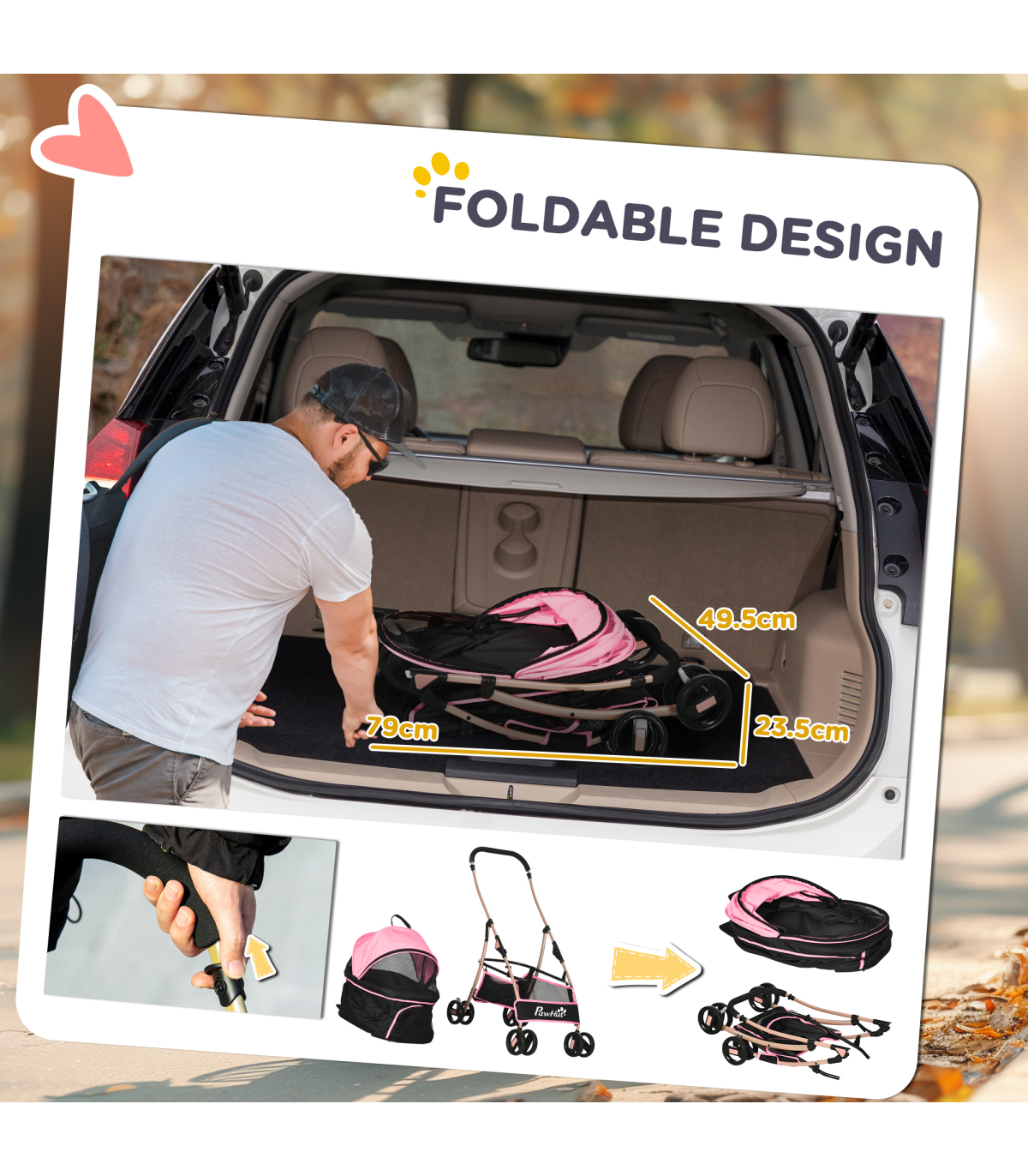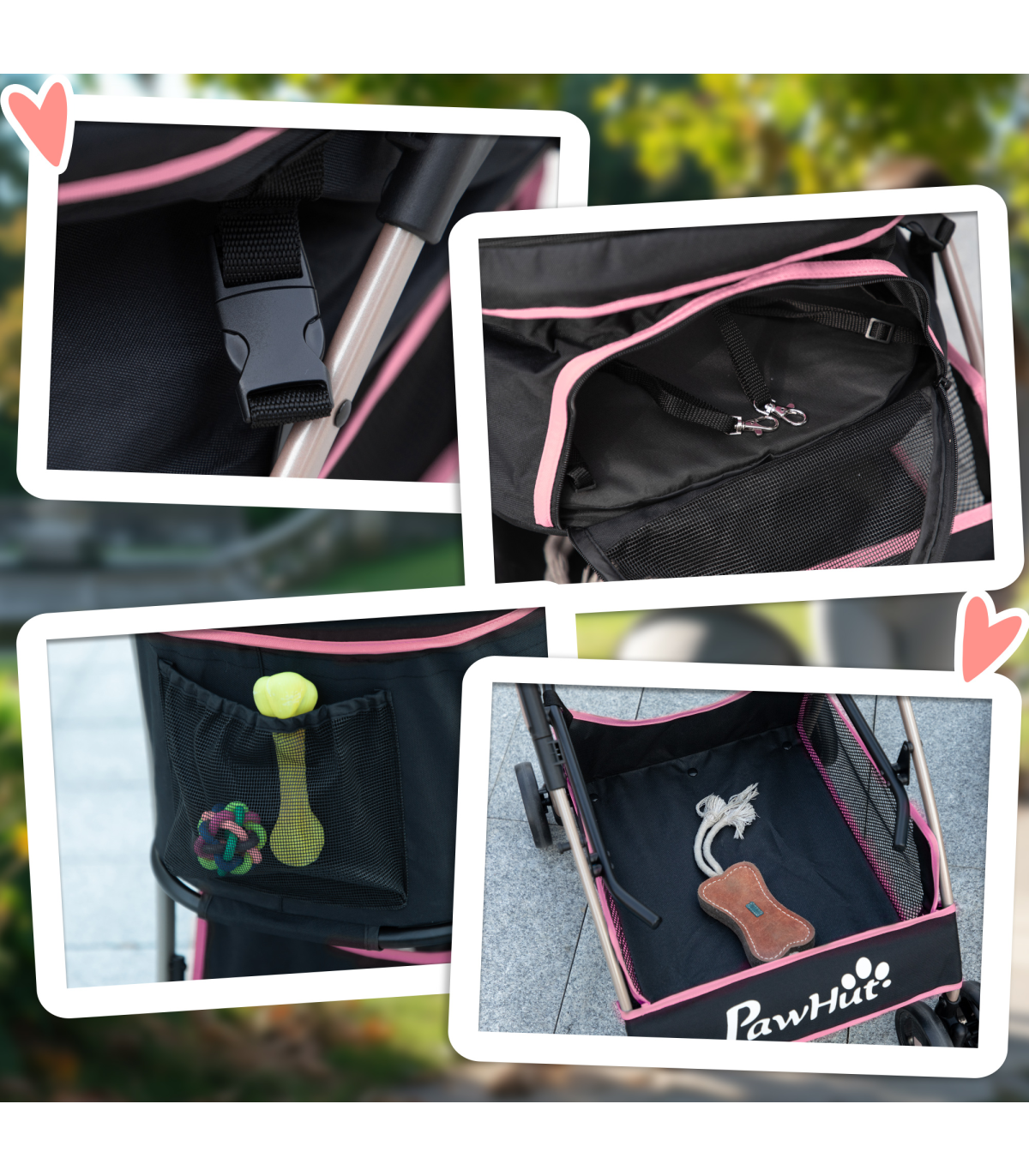 - "PawHut 3 In 1 Pet Stroller, Detachable Dog Cat Travel Carriage - Pink" - Description: - Versatile: Can be used as a stroller for dogs, carrying bag, or car seat. - Take it anywhere, so pets always have a comfortable and familiar space to relax in. - Smooth and safe: Two ?13.5cm EVA rear wheels with brakes, making it easy to park. - Two universal front wheels make the ride smooth. - Two safety leashes keep pets securely strapped in. - Solid frame: Made from steel, it's strong and sturdy. - The oxford cloth is durable and suitable for daily use. - Foldable: Easy to carry and store. - Includes a basket and storage bag to keep pet supplies and personal belongings. - Dimensions: - Overall: 98H x 82L x 49.5Wcm. - Inside (with canopy): 58H x 56L x 36Wcm. - Inside (without canopy): 27H x 56L x 36Wcm. - Suitable for extra small and small pets, which are less than 35cm in length and 10kg in weight.