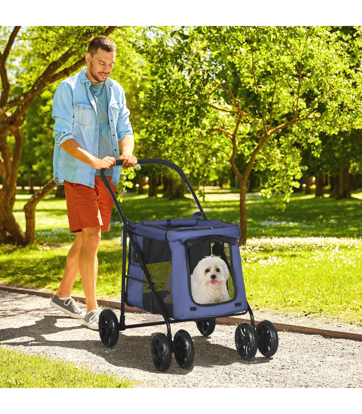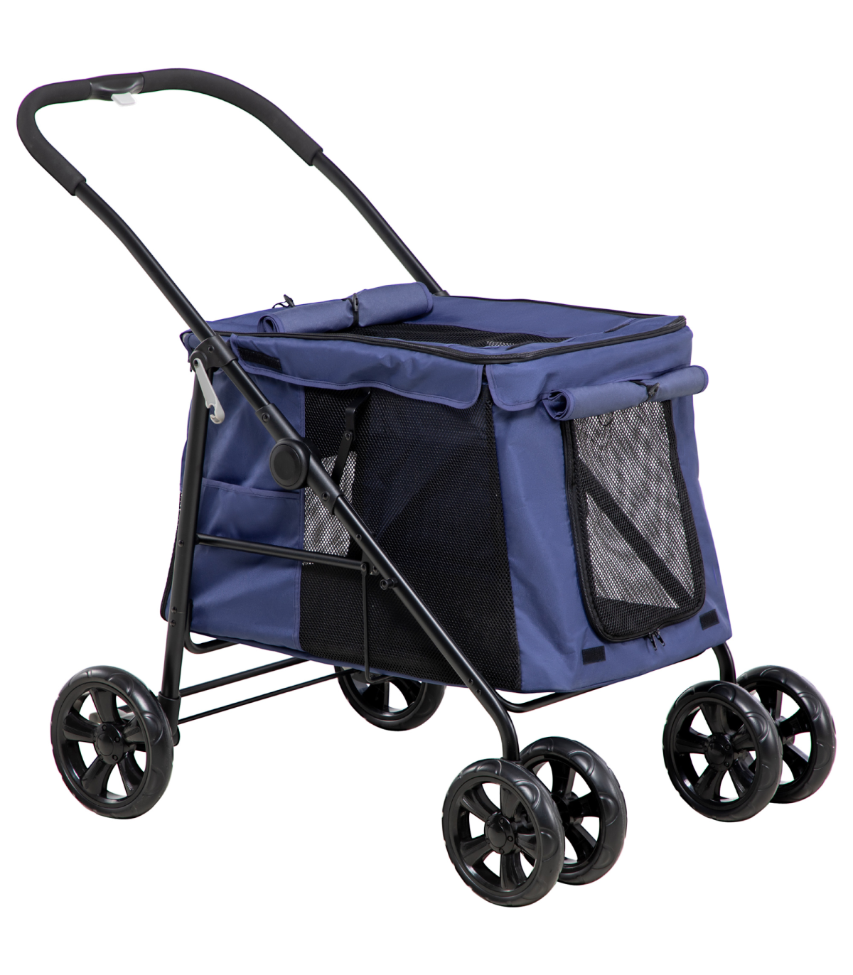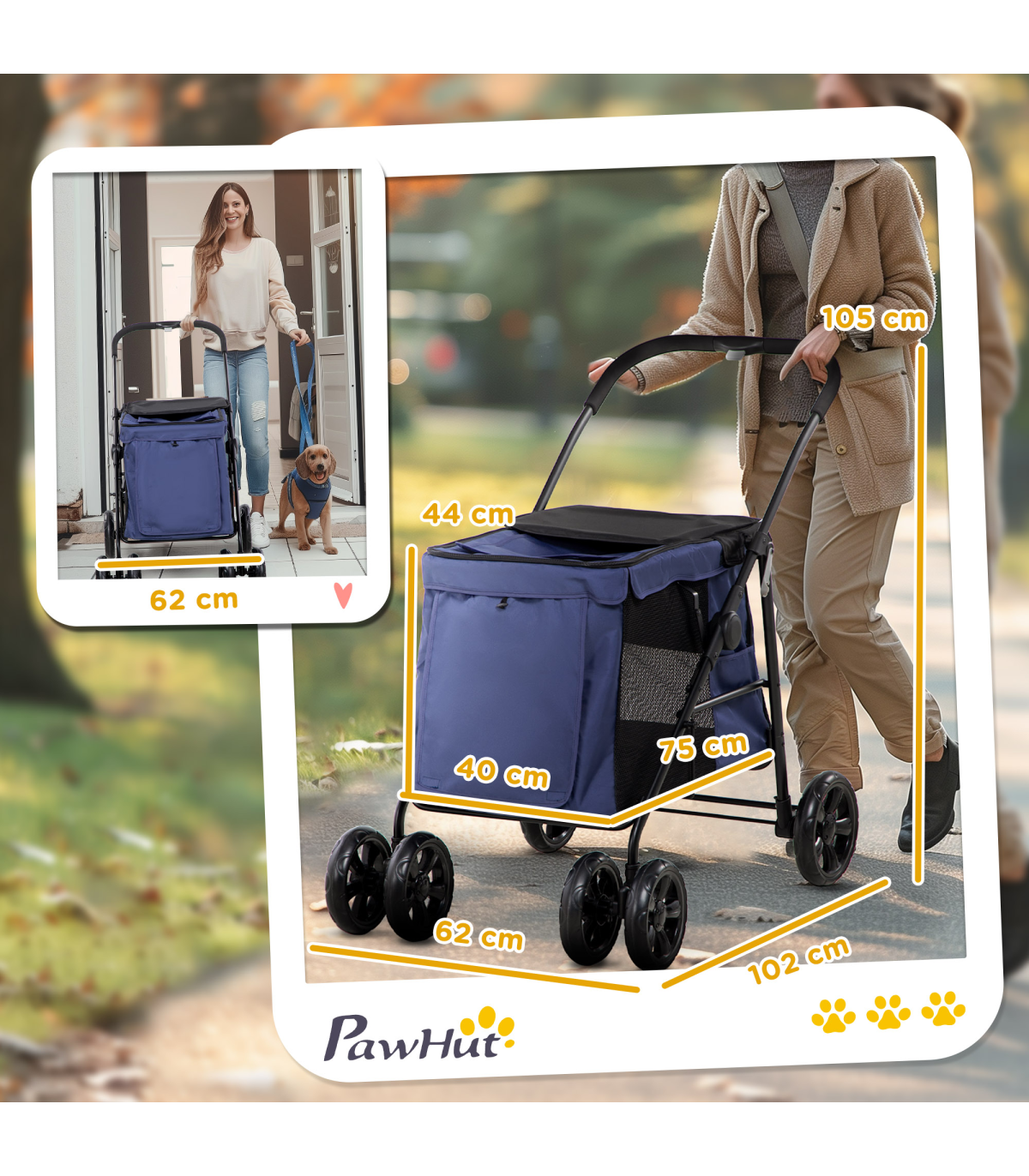 - "PawHut One-click Foldable Pet Stroller w/ Mesh Windows, for Small Pets - Blue" - Description: "Comfortable: When inside this dog buggy, pets will sit on a soft cushion, whilst each side has breathable mesh, letting air flow through to keep them cool. - Foldable frame: This pet stroller is lightweight and portable, making it easy to carry and take anywhere. Also saves space when storing. - Solid material: Strong steel frame, it's covered in 600D Oxford cloth for durability – suitable for daily use. - Four wheels: Includes brakes on two rear wheels for extra safety, whilst the two 360° front wheels are universal, providing smooth and easy movement when pushing this dog stroller. - Dimensions: 105H x 102L x 62Wcm. Inside: 44H x 57L x 40Wcm. - Suitable for small and miniature dogs, less than 37cm in length and 10kg. Maximum load 20kg. - Assembly required.