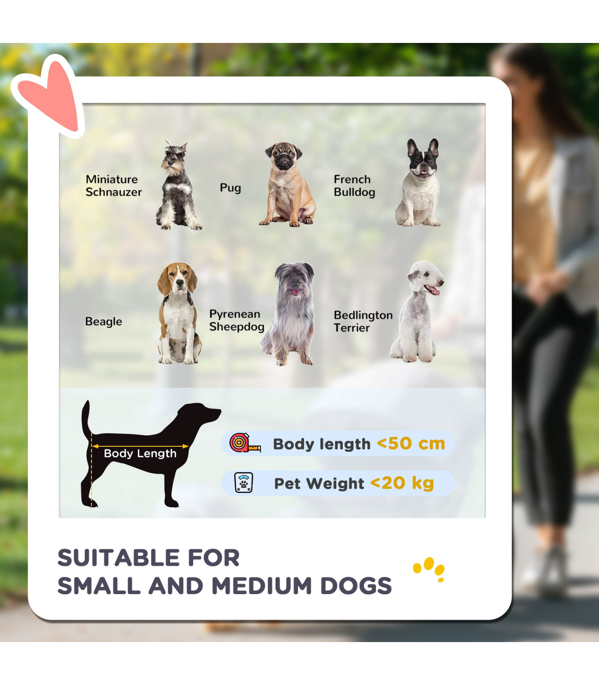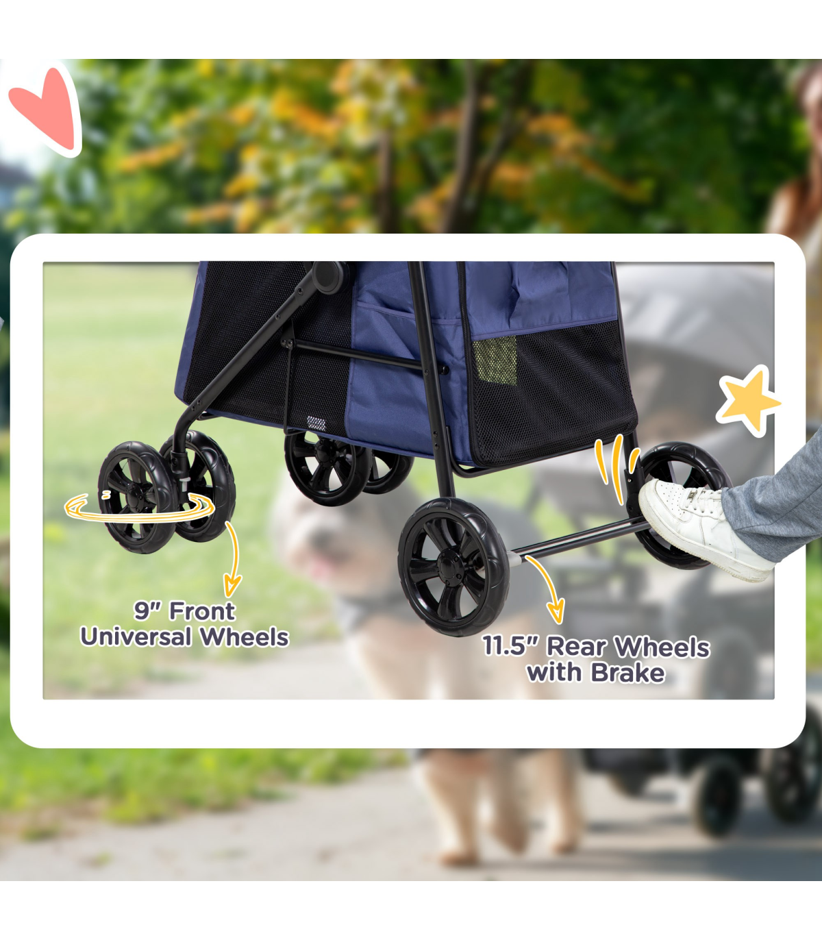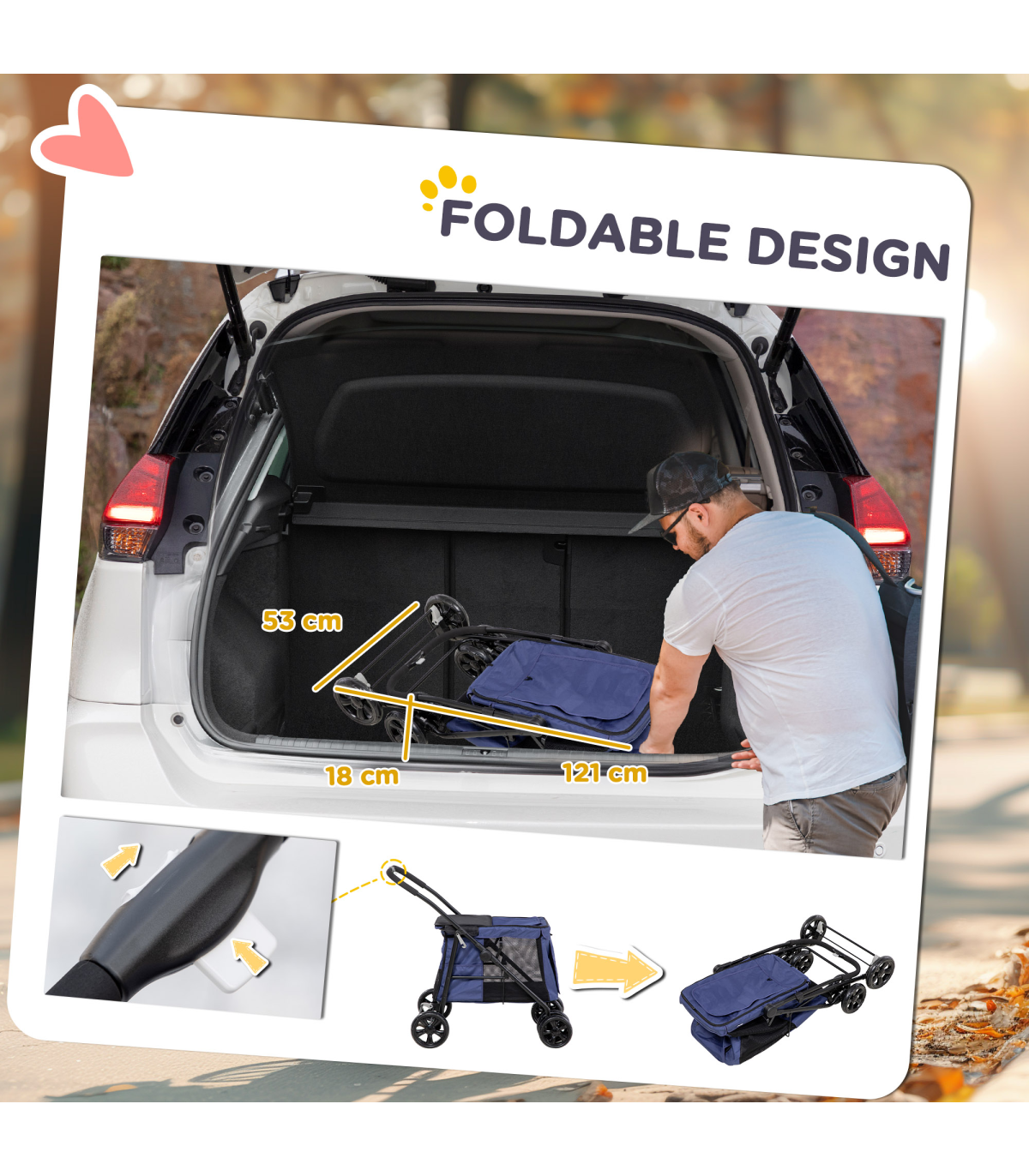 - "PawHut One-click Foldable Pet Stroller w/ Mesh Windows, for Small Pets - Blue" - Description: "Comfortable: When inside this dog buggy, pets will sit on a soft cushion, whilst each side has breathable mesh, letting air flow through to keep them cool. - Foldable frame: This pet stroller is lightweight and portable, making it easy to carry and take anywhere. Also saves space when storing. - Solid material: Strong steel frame, it's covered in 600D Oxford cloth for durability – suitable for daily use. - Four wheels: Includes brakes on two rear wheels for extra safety, whilst the two 360° front wheels are universal, providing smooth and easy movement when pushing this dog stroller. - Dimensions: 105H x 102L x 62Wcm. Inside: 44H x 57L x 40Wcm. - Suitable for small and miniature dogs, less than 37cm in length and 10kg. Maximum load 20kg. - Assembly required.