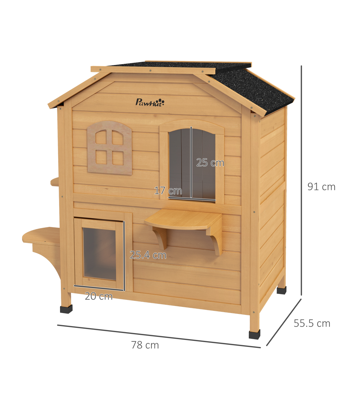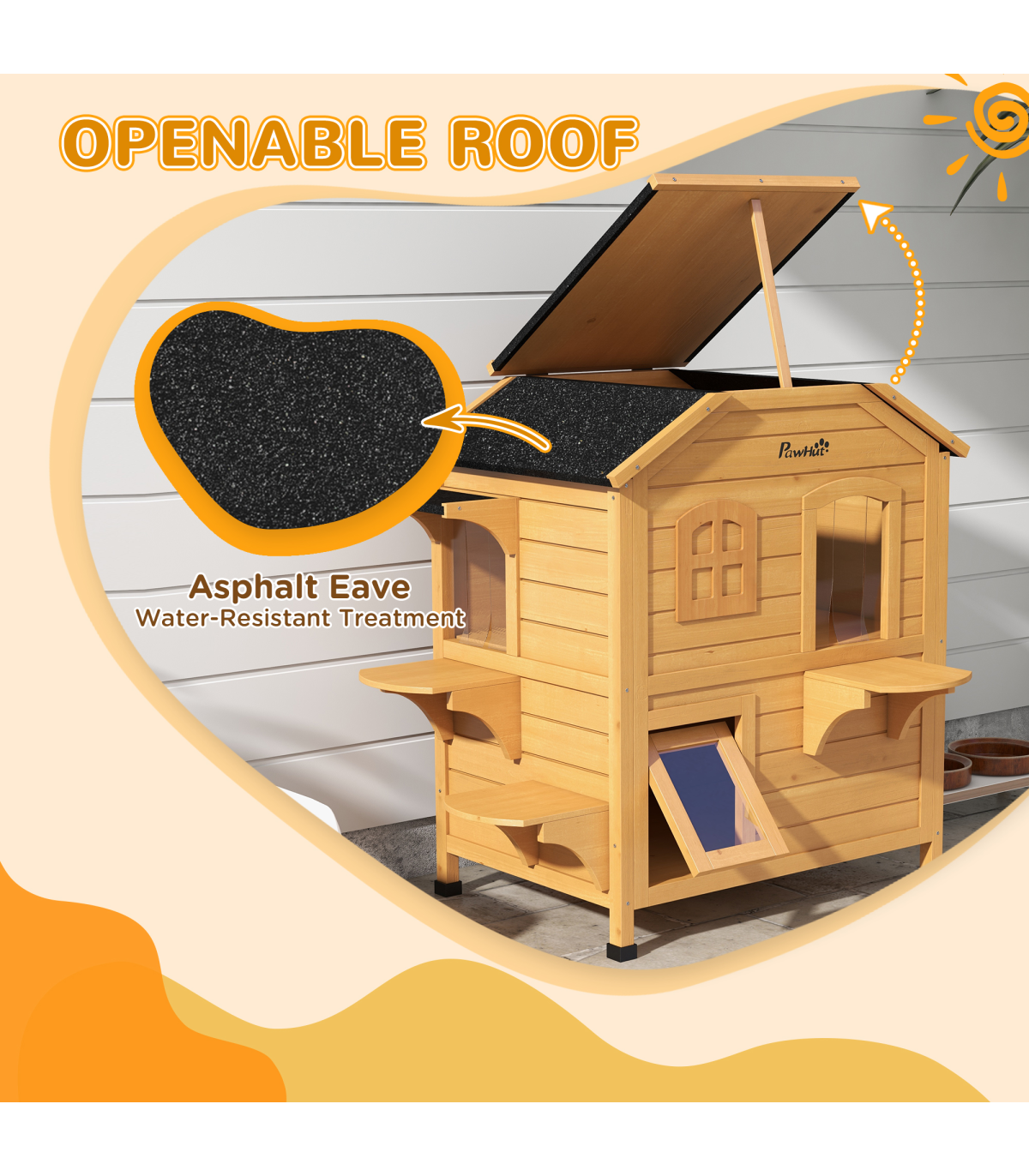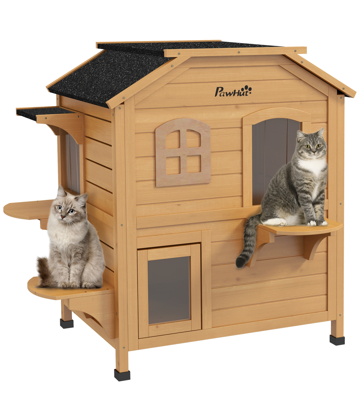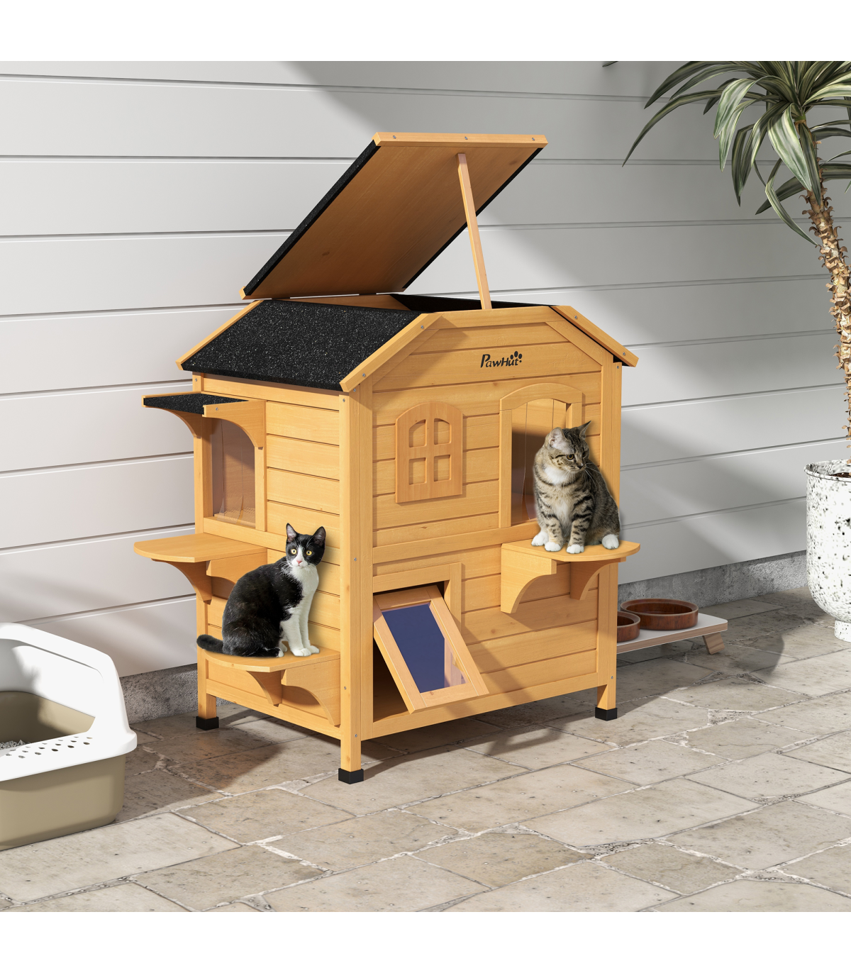 All cats are sure to enjoy this PawHut outdoor cat house. Its asphalt roof and wooden structure is water-resistant ? suitable for outdoors. There are two levels, providing enough room for two cats to relax comfortably. With three jumping steps, two doors, a floor hole and an escape door, there are plenty of fun ways to get in and out. Finished with an openable roof, making it easy to get in and clean this cat house ? it also keeps their area ventilated, preventing unpleasant odours from forming.