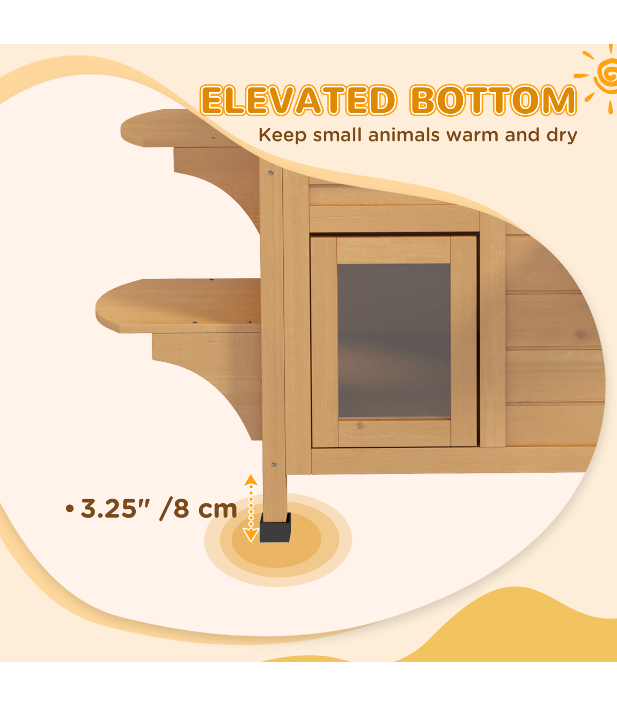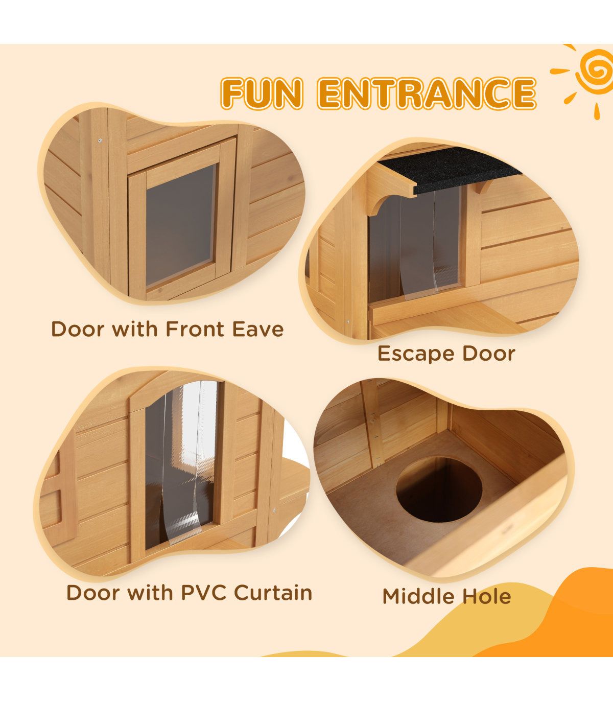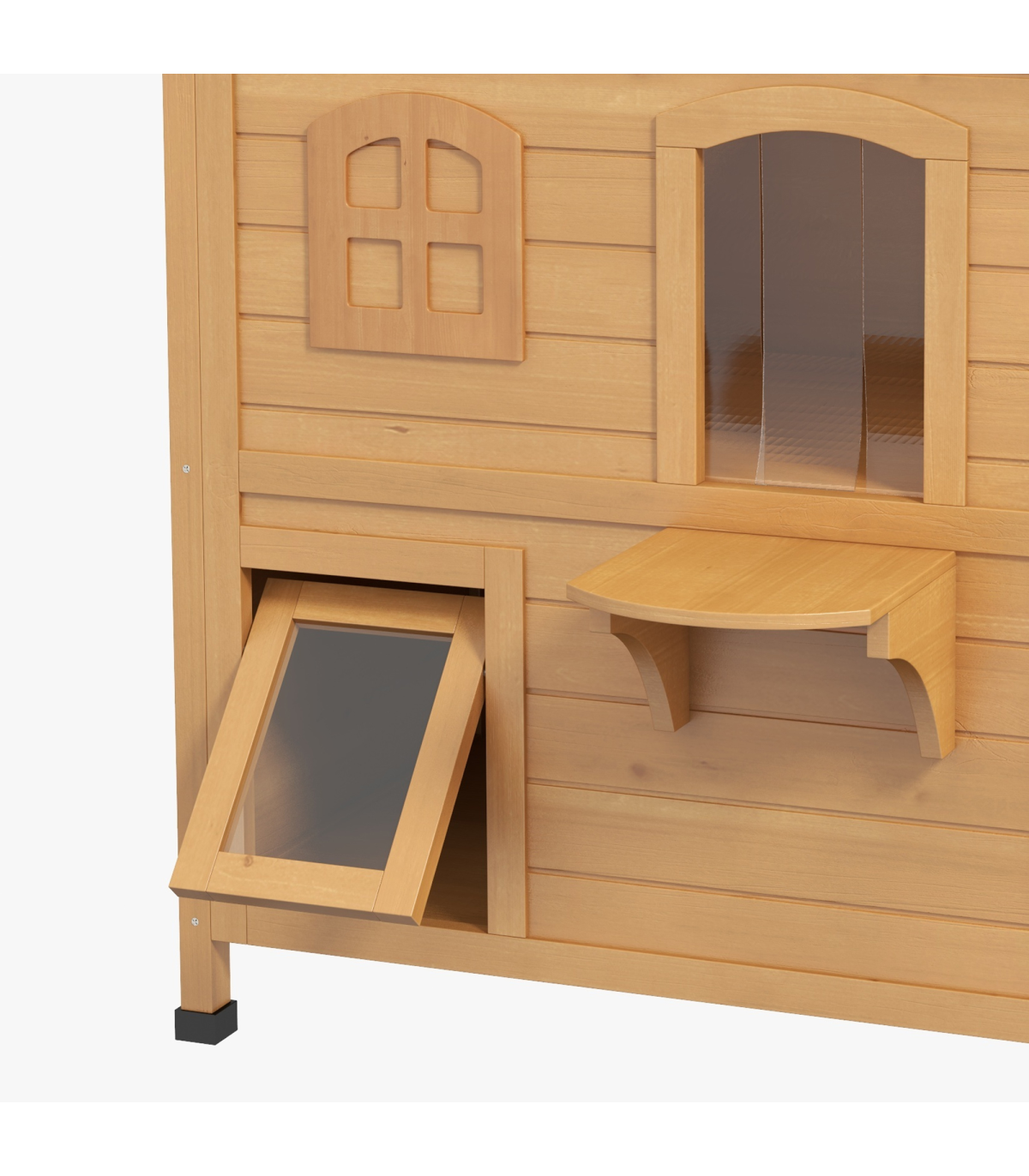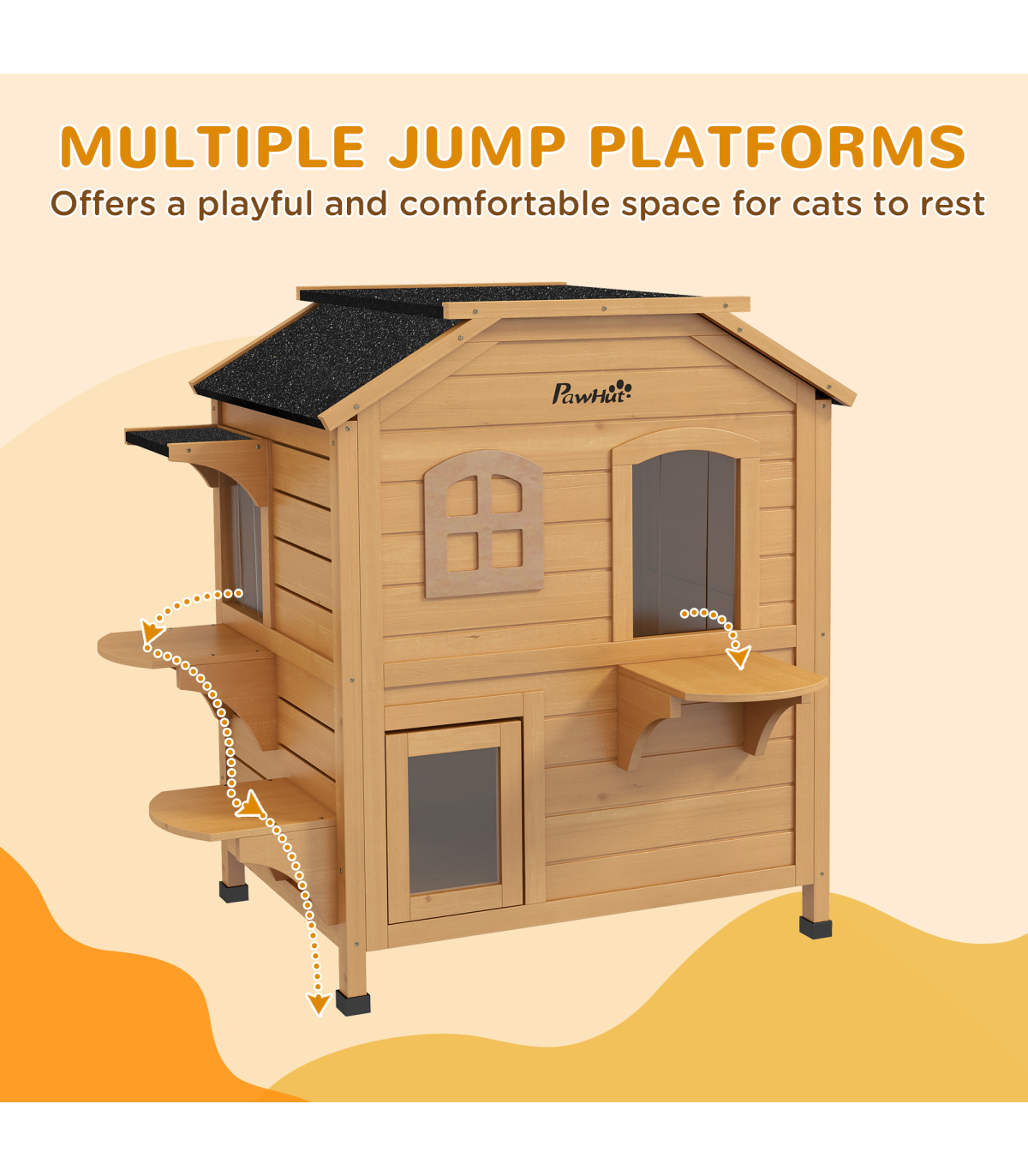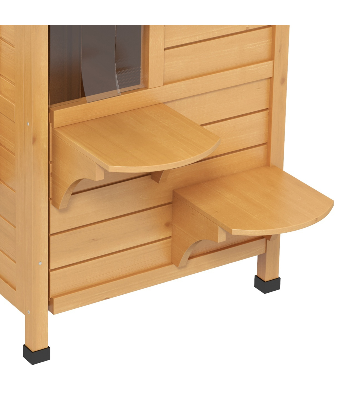 All cats are sure to enjoy this PawHut outdoor cat house. Its asphalt roof and wooden structure is water-resistant ? suitable for outdoors. There are two levels, providing enough room for two cats to relax comfortably. With three jumping steps, two doors, a floor hole and an escape door, there are plenty of fun ways to get in and out. Finished with an openable roof, making it easy to get in and clean this cat house ? it also keeps their area ventilated, preventing unpleasant odours from forming.