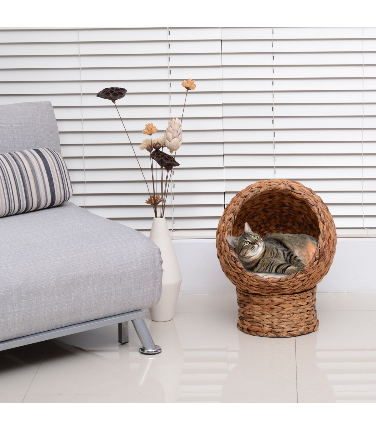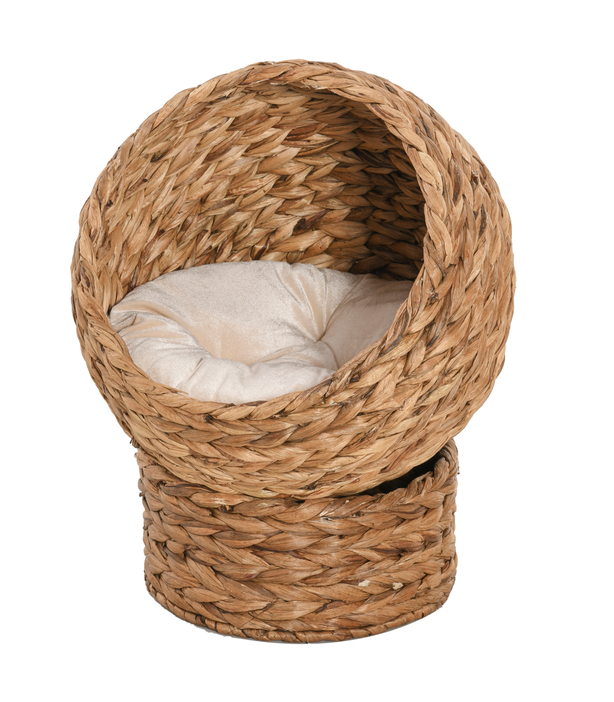 Comfortable features: This cat cave includes a soft cushion, which is removable and washable, keeping their space clean and cosy.Raised cat house: The cylindrical base keeps the cat bed basket stable and balanced. With it being raised, it allows air to circulate freely, keeping pets cool and comfortable.Durable material: Made of natural water hyacinth, this cat basket is a safe and secure space for pets to relax in.Dimensions: 52H x 42L x 33Wcm.Assembly required.