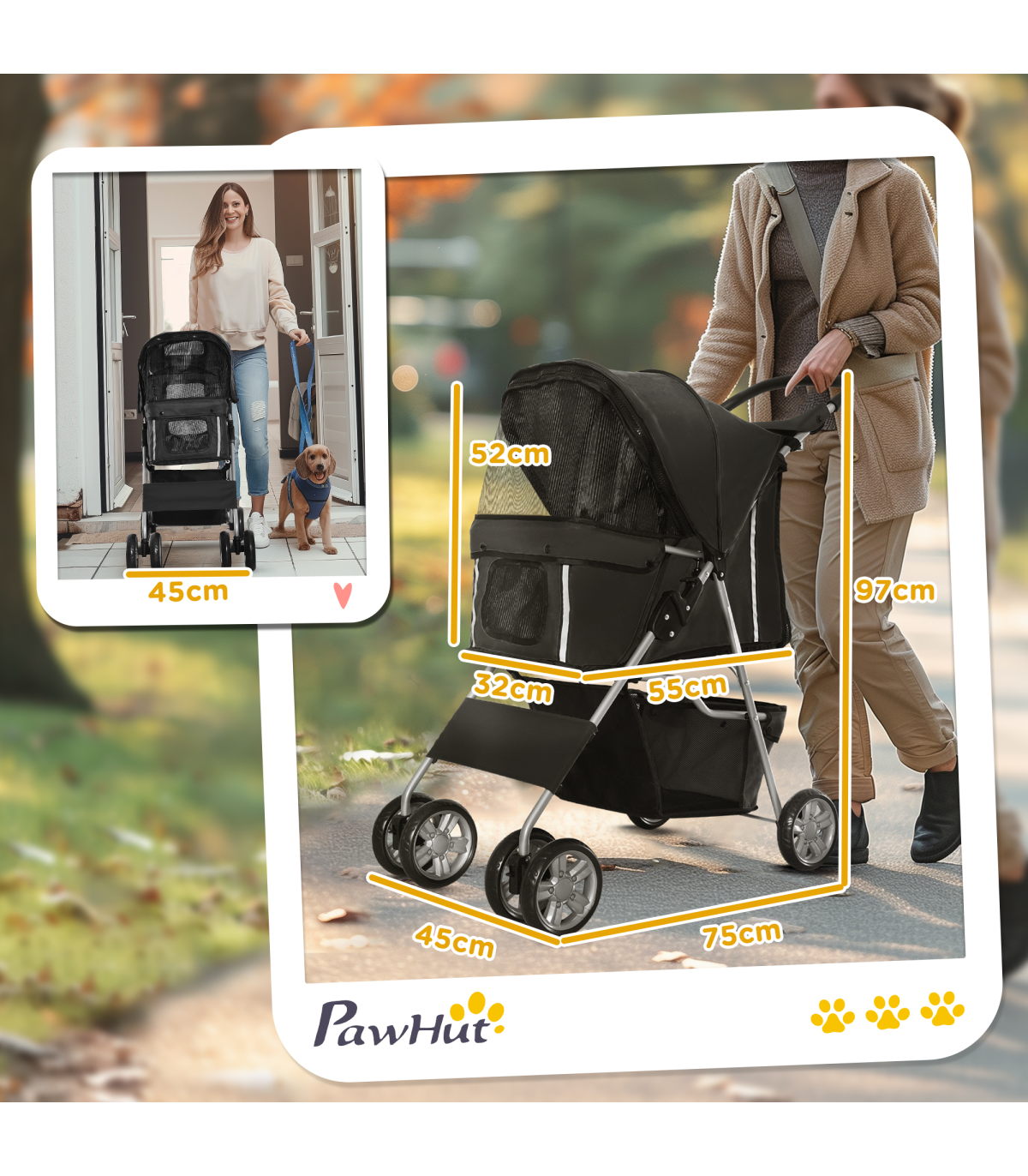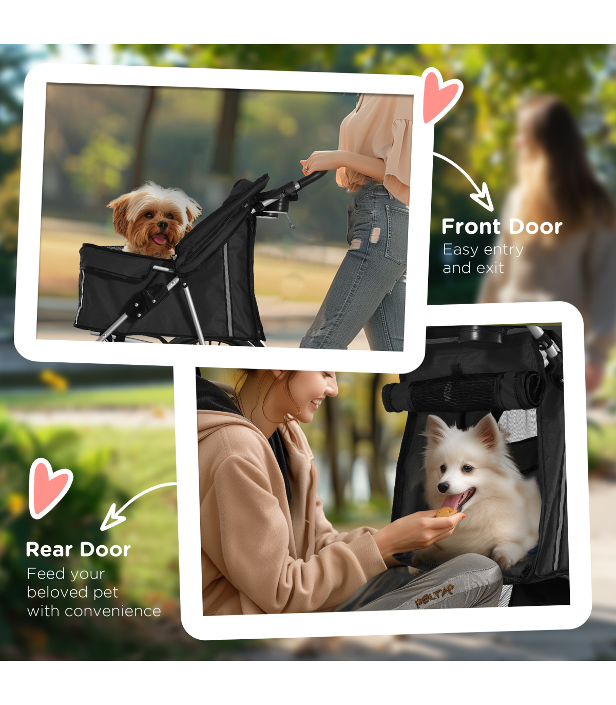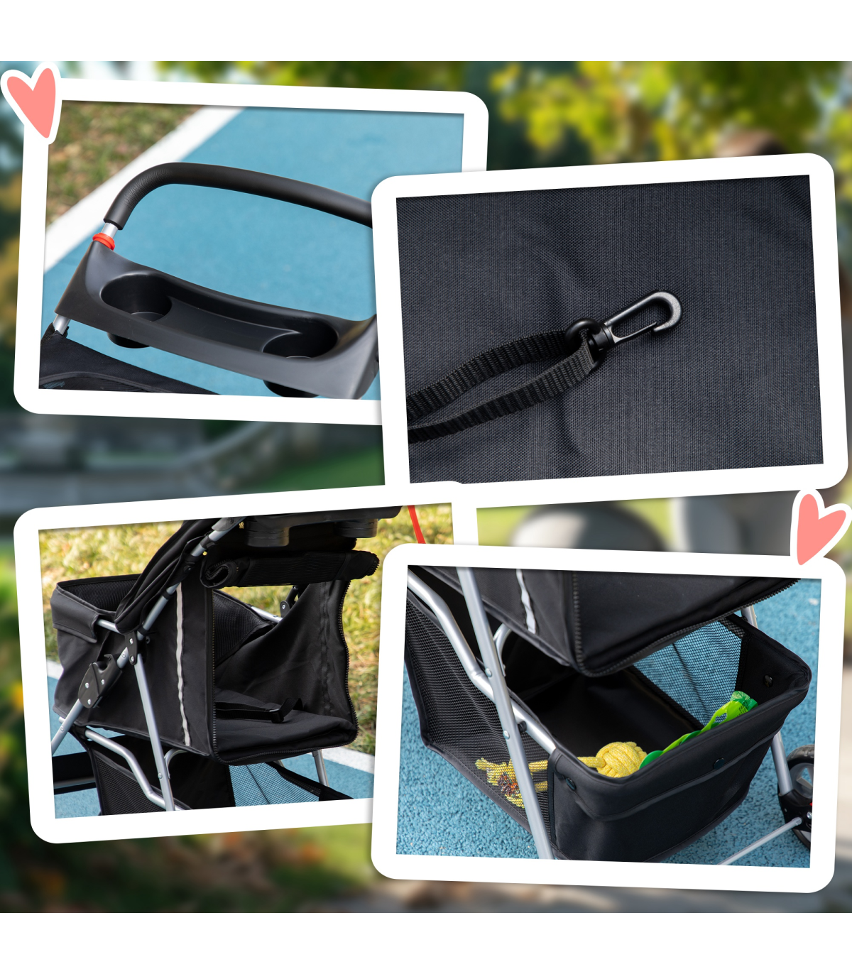 Quality material: This dog stroller features solid sprayed steel frame with high-quality 600D Oxford cloth to prevent claws and biting right through. The dog pram is durable for long-lasting use. A bottom basket is included for convenient storage, and cup holders and tray on the handle for water and treats.Thoughtful design: Features a zippered door on front and back for easy entry. And 3 breathable nets included for good air circulation & visibility and protect against bad insects.Safety first: Front universal wheels, and rear directional wheels with brake lever included for easy parking, as well as a safety leash inside to keep your pet securely strapped in. 2 pairs of reflective strips on the front and back of the dog pushchair to attract attention.Easy storage & transport: The frame of this cat stroller has a folding design, which means it's easy to store when not needed, and perfect for traveling by car.Overall dimension: 75L x 45W x 97Hcm, Inner space size: 55L x 32W x 52Hcm. Folded dimension: 83L x 45W x 25Hcm. Suitable for small and miniature dogs less than 35cm in length and less than 10kg in weight.