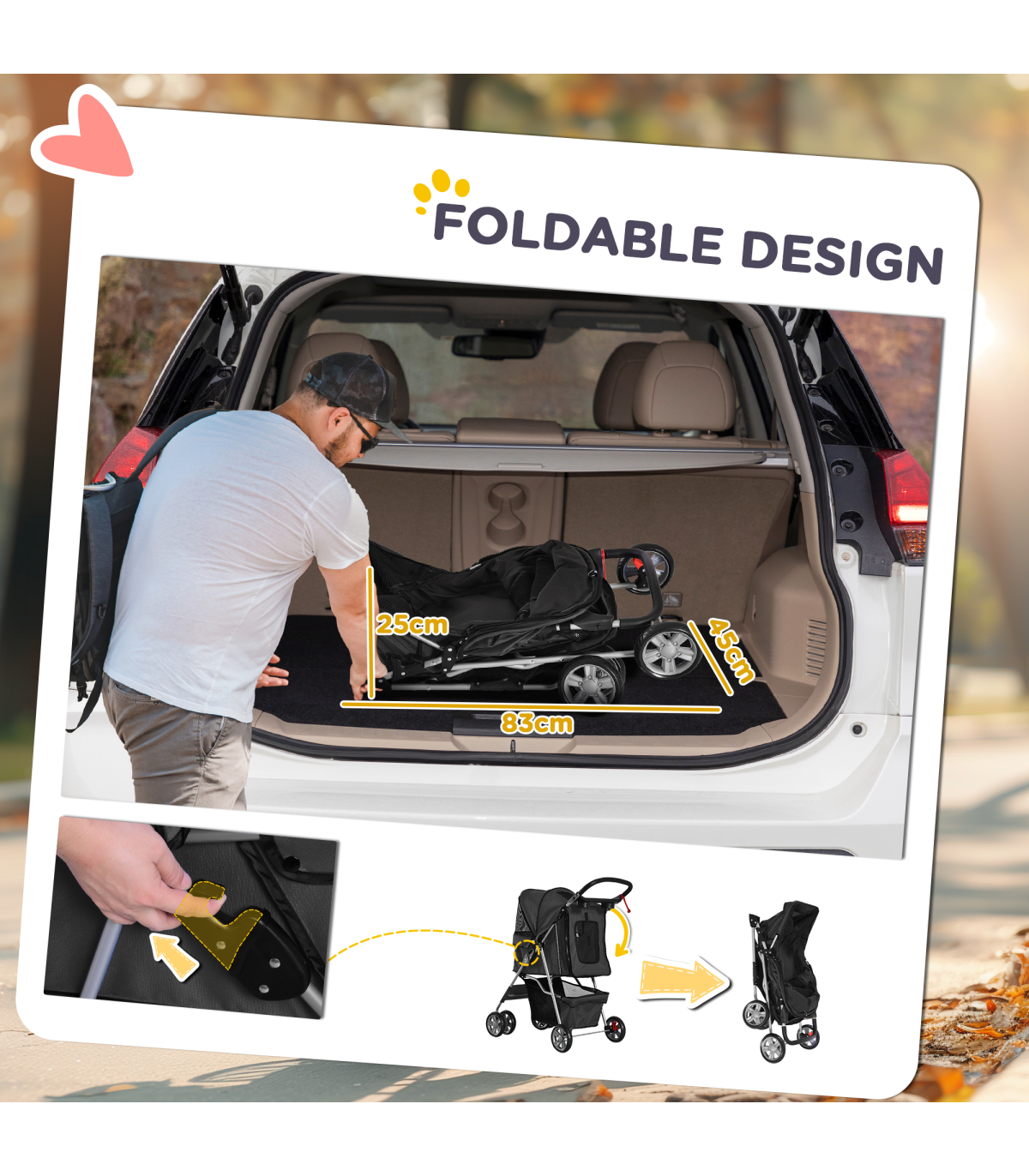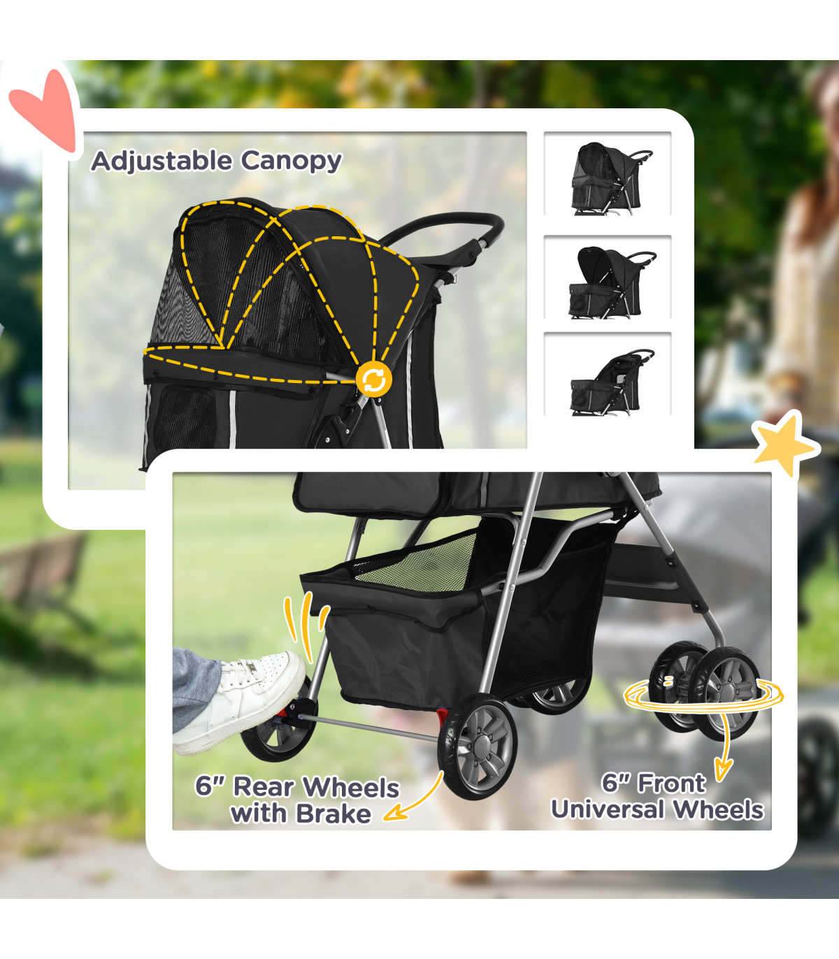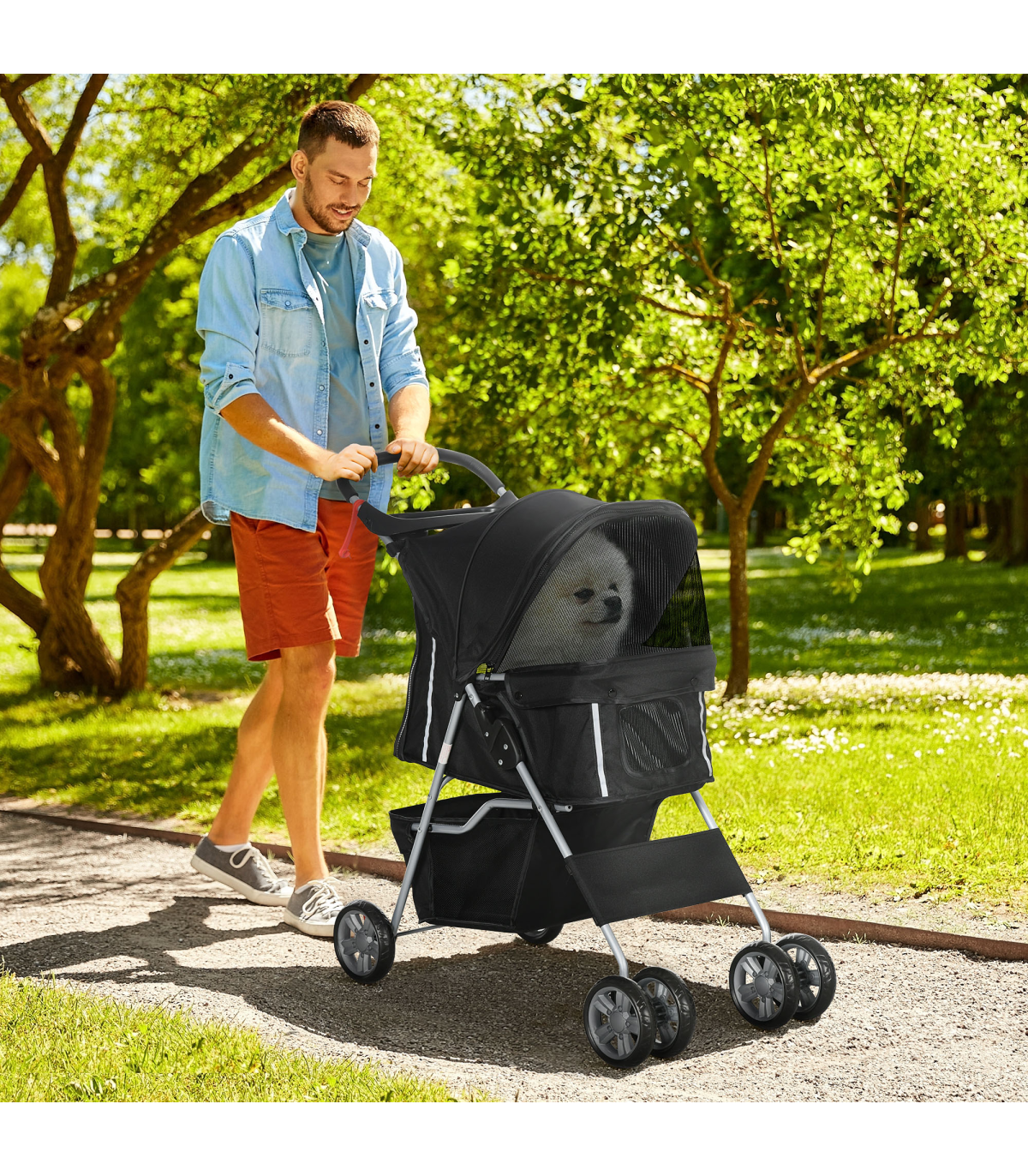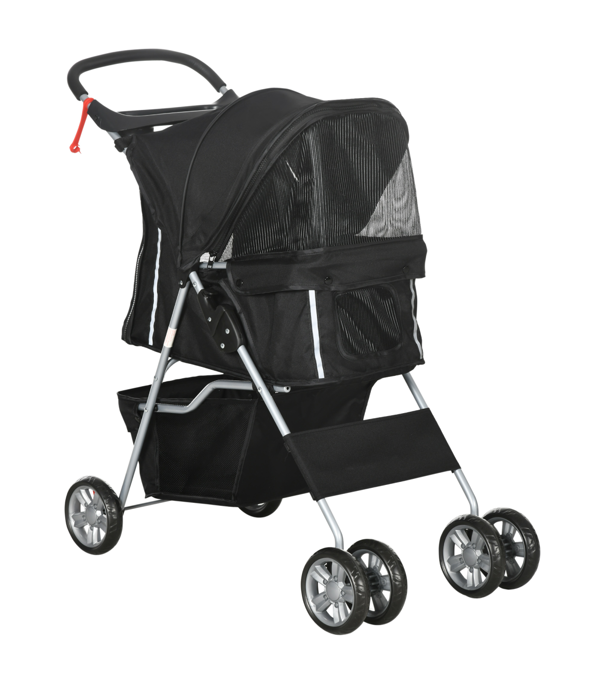 Quality material: This dog stroller features solid sprayed steel frame with high-quality 600D Oxford cloth to prevent claws and biting right through. The dog pram is durable for long-lasting use. A bottom basket is included for convenient storage, and cup holders and tray on the handle for water and treats.Thoughtful design: Features a zippered door on front and back for easy entry. And 3 breathable nets included for good air circulation & visibility and protect against bad insects.Safety first: Front universal wheels, and rear directional wheels with brake lever included for easy parking, as well as a safety leash inside to keep your pet securely strapped in. 2 pairs of reflective strips on the front and back of the dog pushchair to attract attention.Easy storage & transport: The frame of this cat stroller has a folding design, which means it's easy to store when not needed, and perfect for traveling by car.Overall dimension: 75L x 45W x 97Hcm, Inner space size: 55L x 32W x 52Hcm. Folded dimension: 83L x 45W x 25Hcm. Suitable for small and miniature dogs less than 35cm in length and less than 10kg in weight.