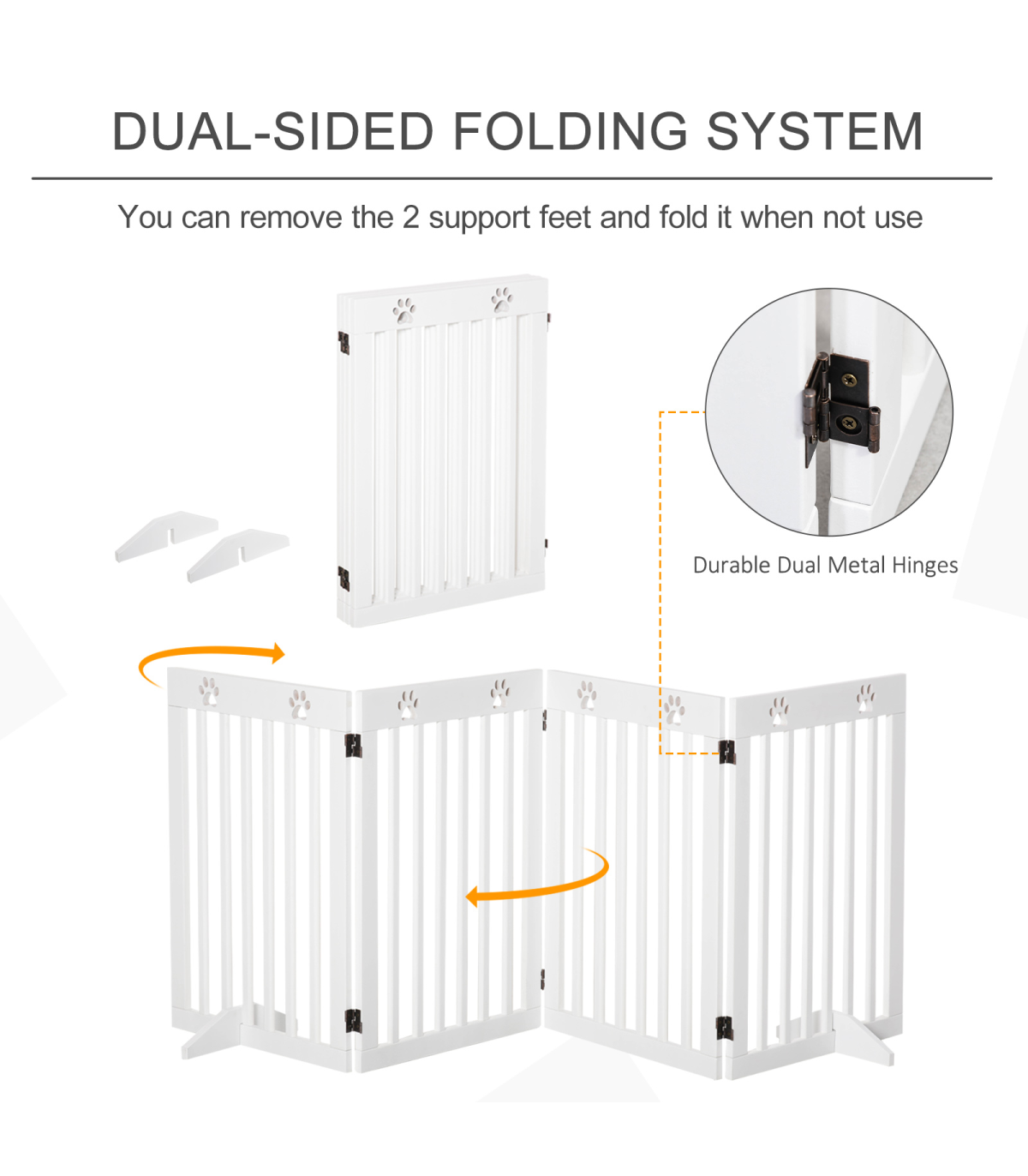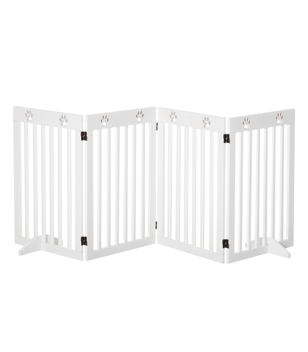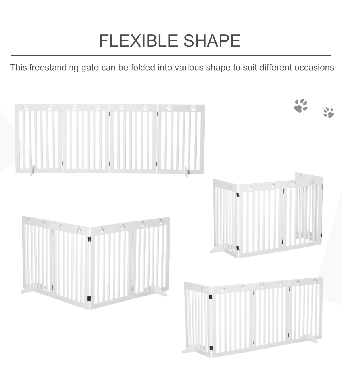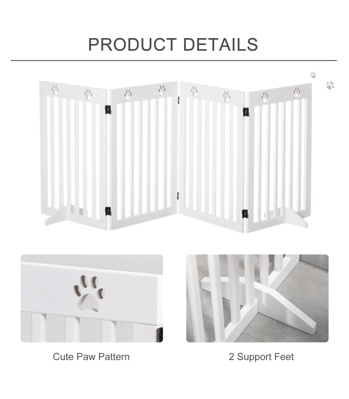 - Solid MDF frame is durable and pet-friendly - Duel-sided folding system with quality dual hinges makes it easy to set into different shapes - Great for doorways, halls, bedrooms and staircases - Cut-out paw pattern on top is cute - Two removable fee