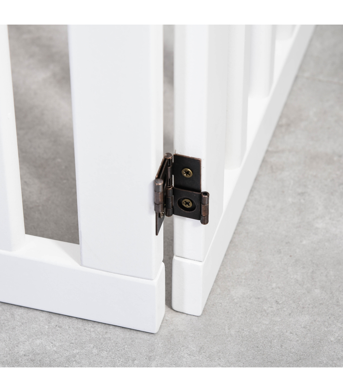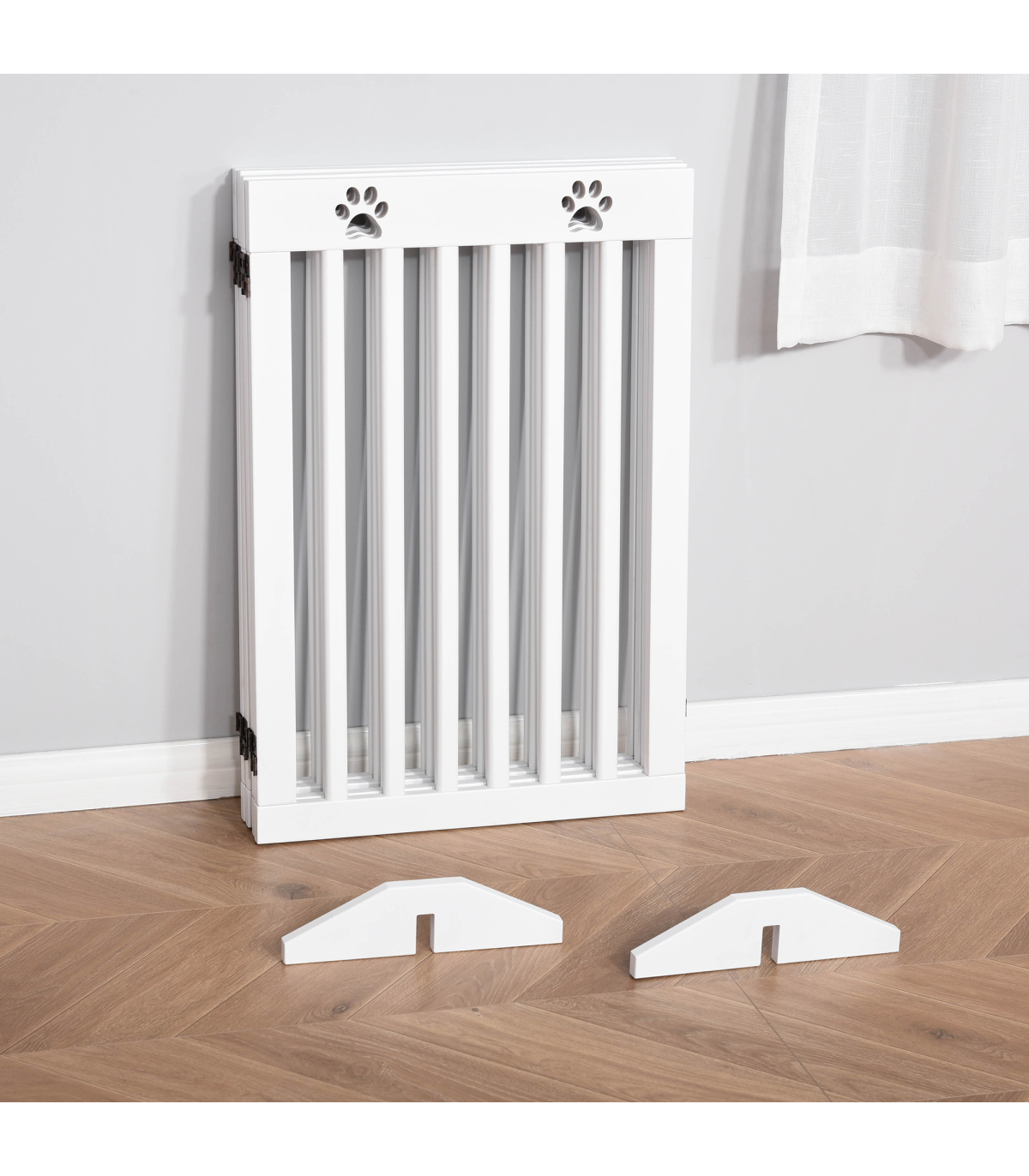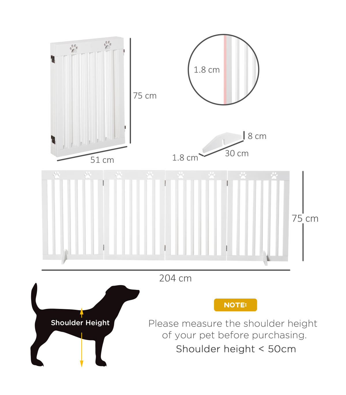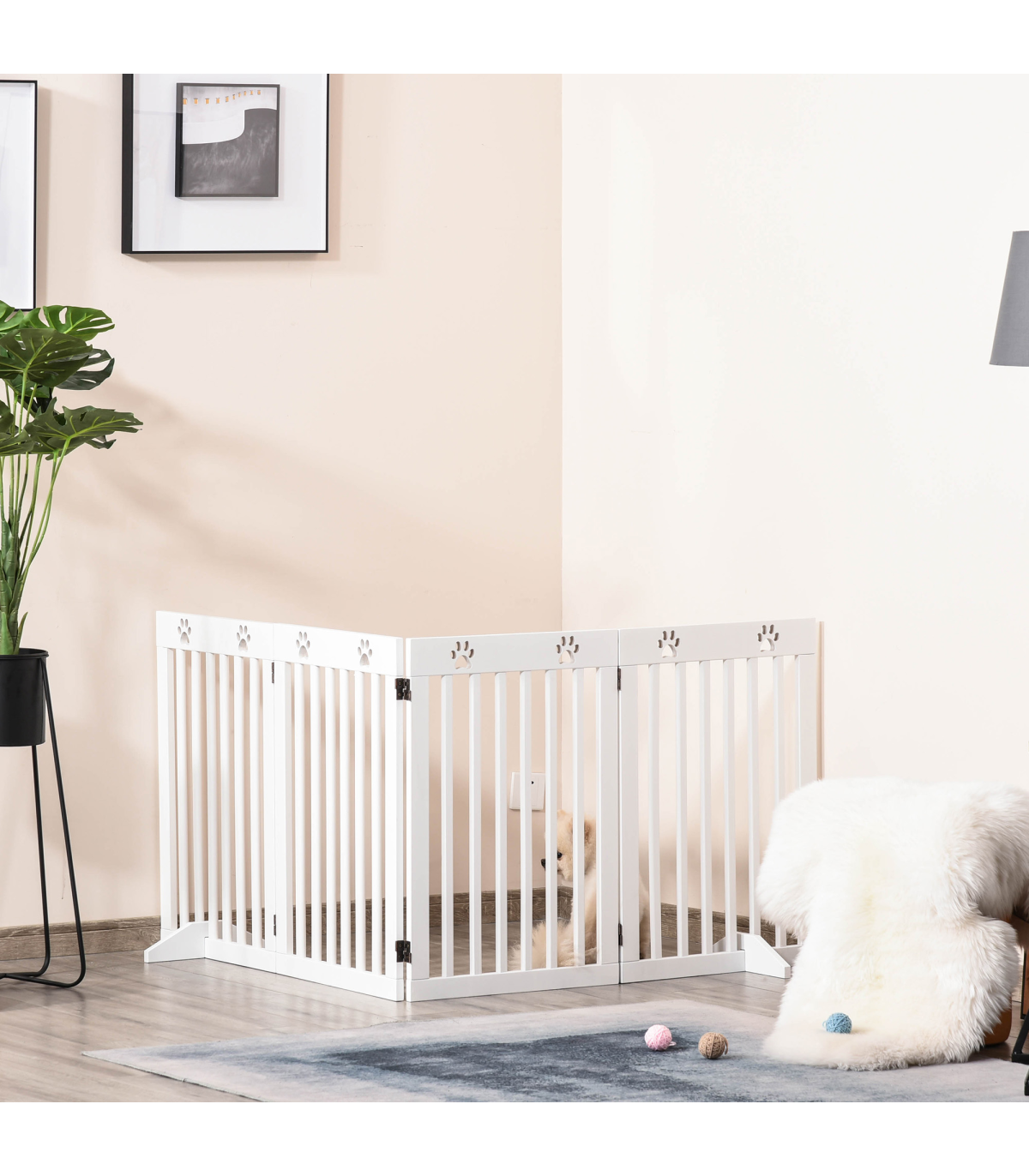 - Solid MDF frame is durable and pet-friendly - Duel-sided folding system with quality dual hinges makes it easy to set into different shapes - Great for doorways, halls, bedrooms and staircases - Cut-out paw pattern on top is cute - Two removable fee