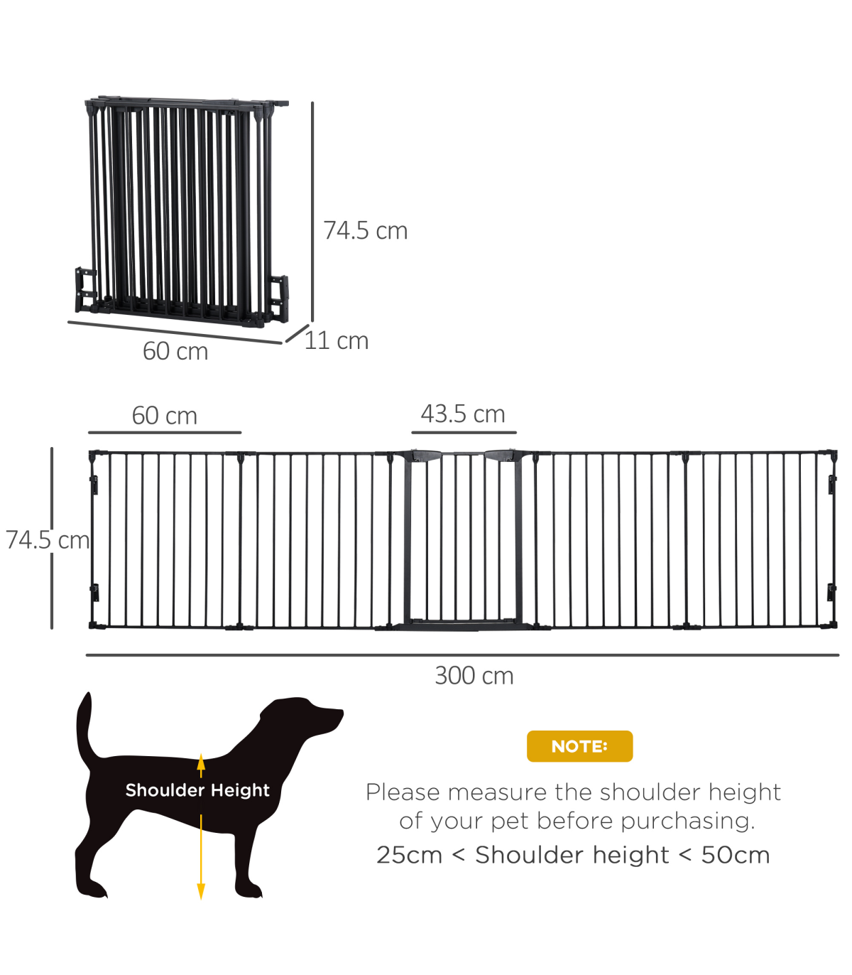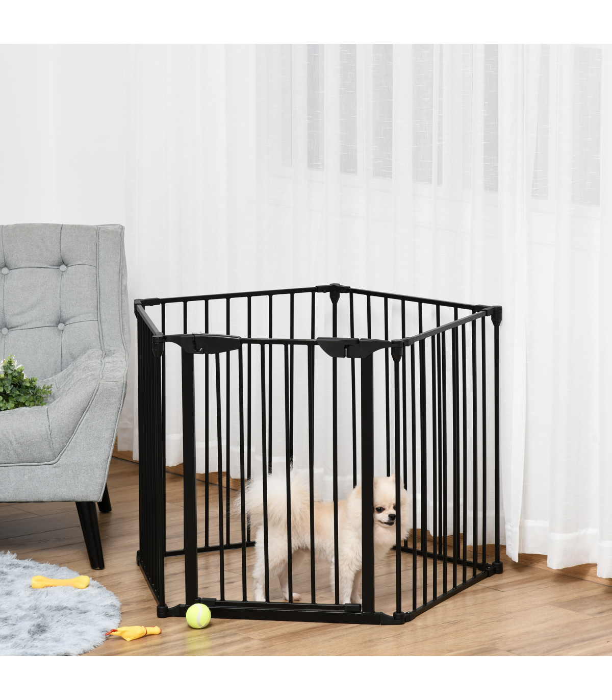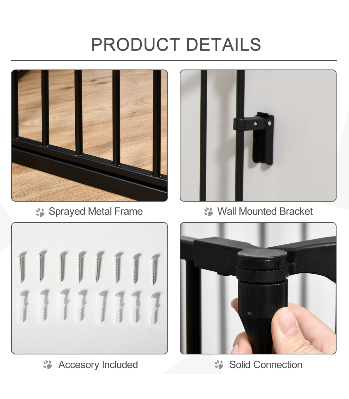 - "Pet Gate 5-Panel Dog Playpen for Indoor Stair Barrier W/ Walk Through Door Black" - Description: - Can be used as a freestanding gate or mounted on the wall with included accessories - Can be used as a pet playpen, safety gate, Christmas and stove fence, room divider etc - The door can be closed automatically when its opening angle is less than 90 degrees, and stay open when goes over 90 degrees (The door won't close when its angle is less than 15 degrees) - This pet gate can be formed in any shape you want, L-shape, U-shape, pentagonal, etc - Pull back the button and lift to open the door - Strong metal frame with powder coated finish, safe and durable for long-term use - Foldable design for easy storage and transport - Suitable for small and medium-sized dogs between 25cm and 50cm in height at the shoulder