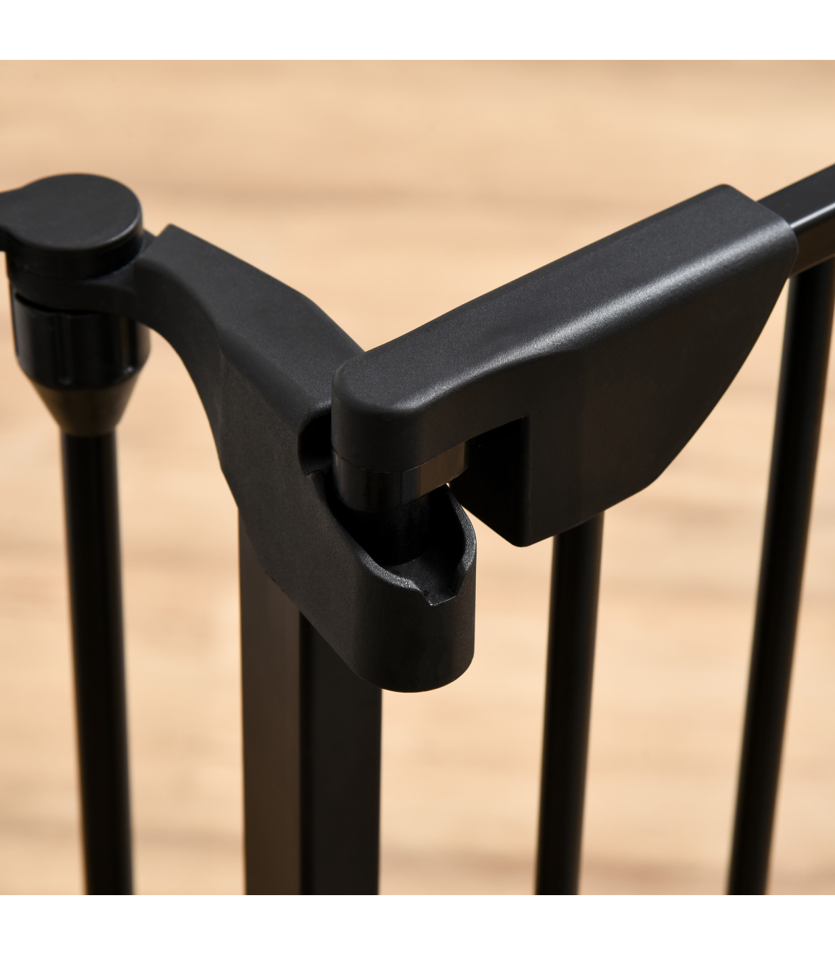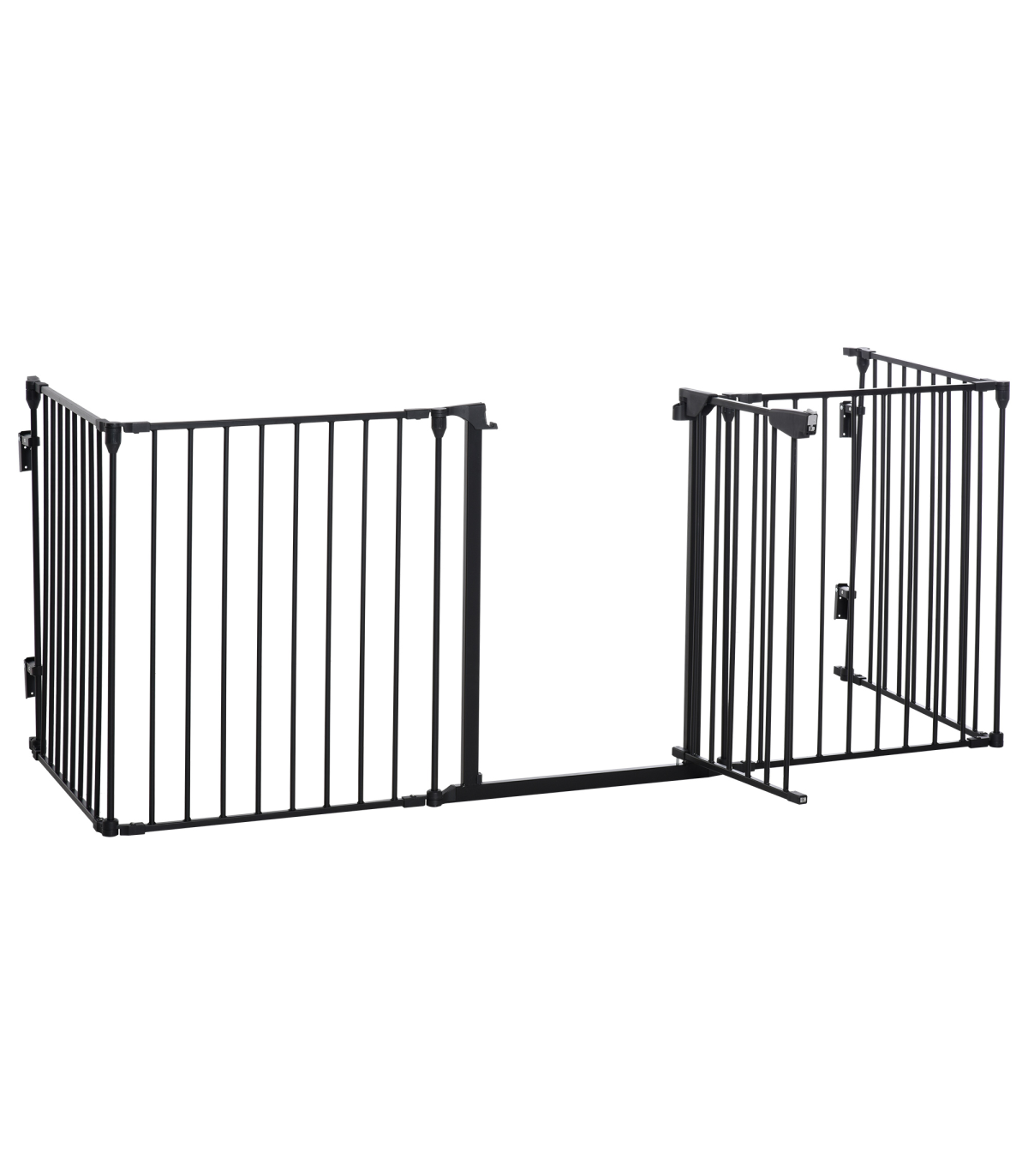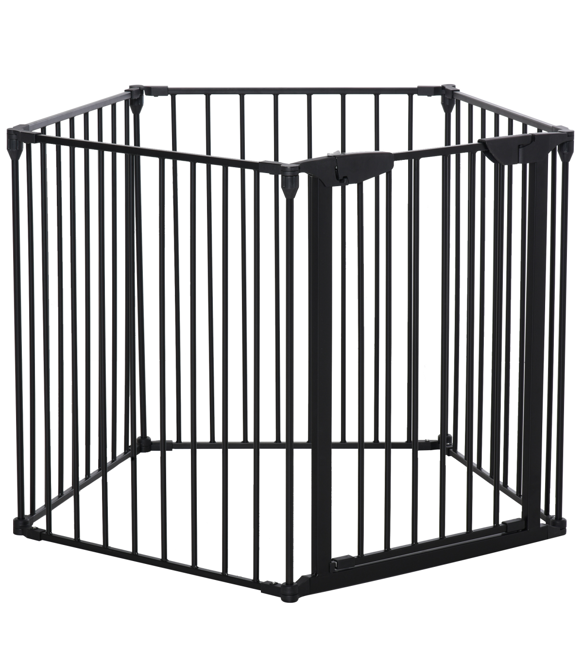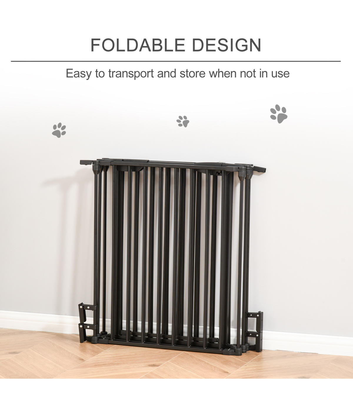 - "Pet Gate 5-Panel Dog Playpen for Indoor Stair Barrier W/ Walk Through Door Black" - Description: - Can be used as a freestanding gate or mounted on the wall with included accessories - Can be used as a pet playpen, safety gate, Christmas and stove fence, room divider etc - The door can be closed automatically when its opening angle is less than 90 degrees, and stay open when goes over 90 degrees (The door won't close when its angle is less than 15 degrees) - This pet gate can be formed in any shape you want, L-shape, U-shape, pentagonal, etc - Pull back the button and lift to open the door - Strong metal frame with powder coated finish, safe and durable for long-term use - Foldable design for easy storage and transport - Suitable for small and medium-sized dogs between 25cm and 50cm in height at the shoulder