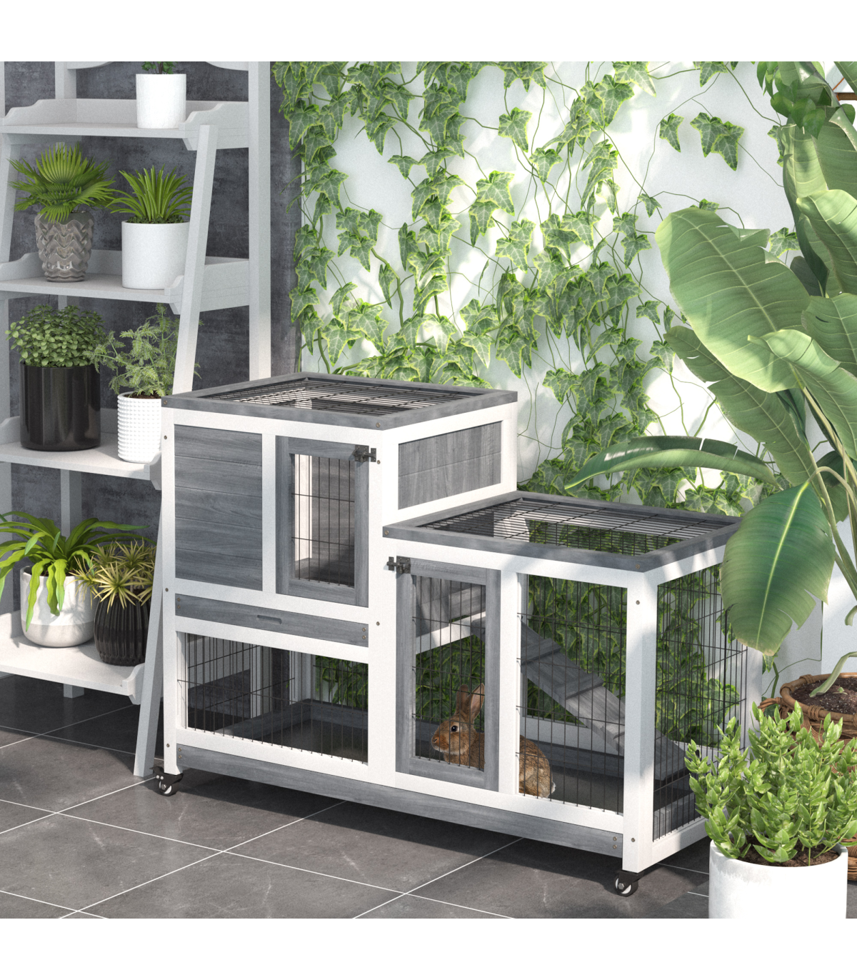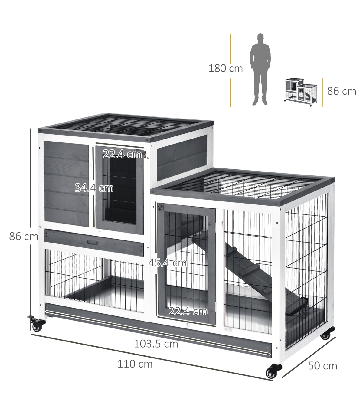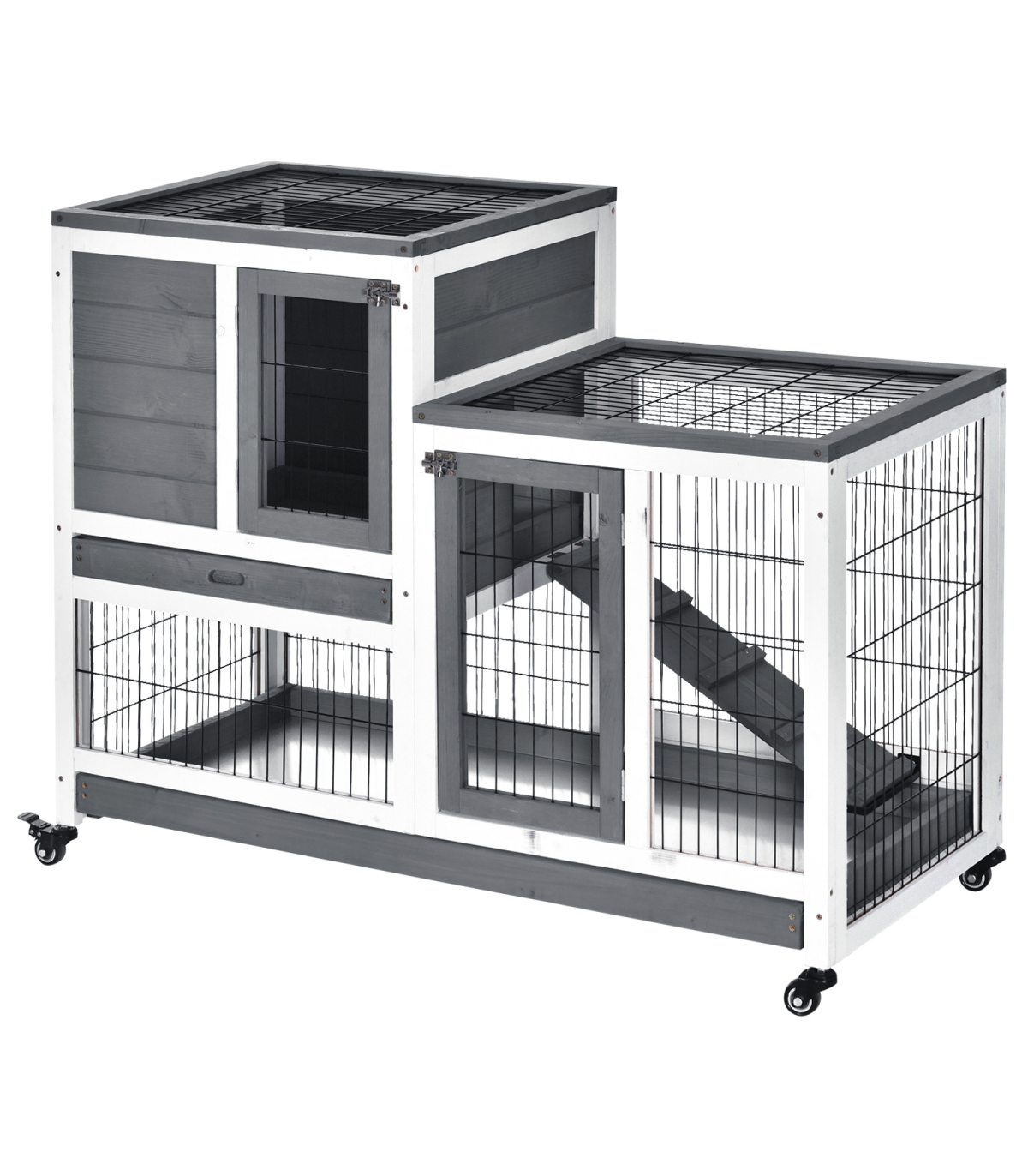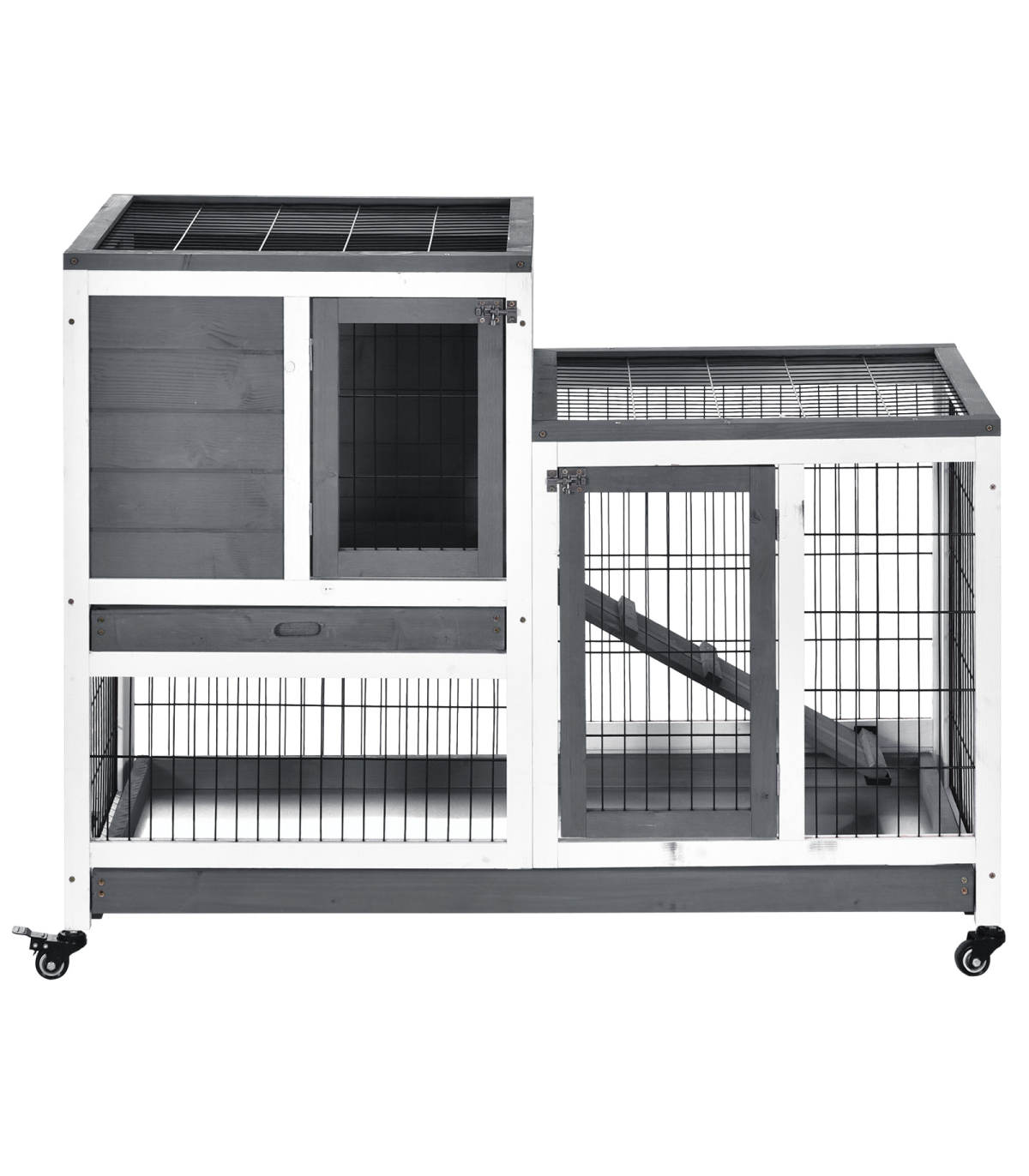 - Crafted from fir wood for a structure which is Solid and safe for pets to live in - four wheels allow you to move hutch around smoothly and easily. Two wheels have brakes - Raised design keeps your animals dry when the ground is wet - Two-tier design, formed of a top living house and a Bottom open area, with metal wiring surrounding the Bottom for safety - Non slip ramp connects the Two levels - Two Lockable doors and Slide-out trays for easy access - Ideal for rabbits, guineas pigs and other small animals. Assembly required