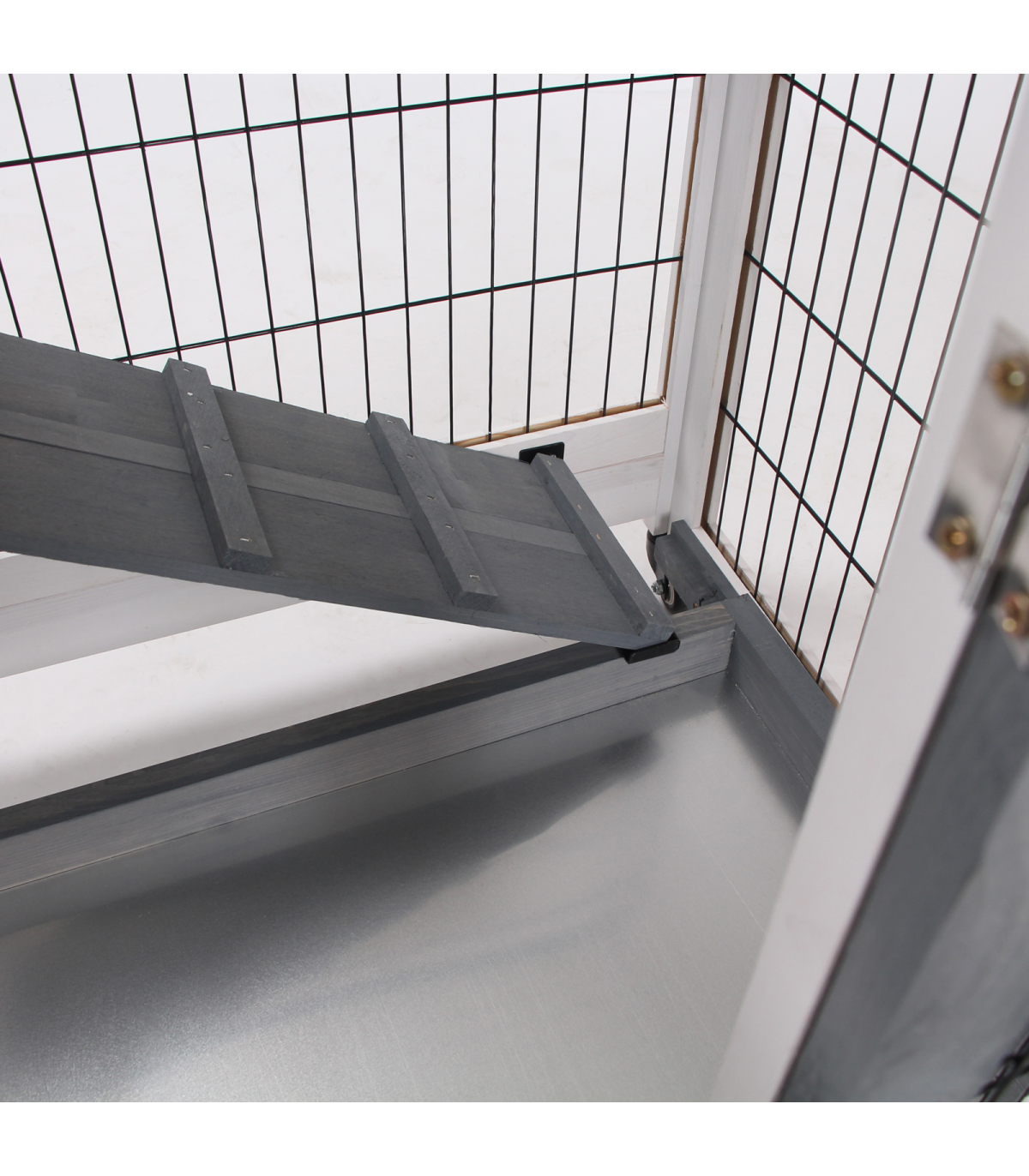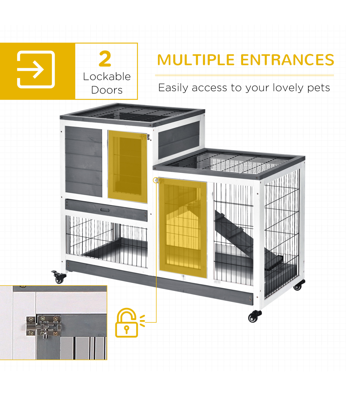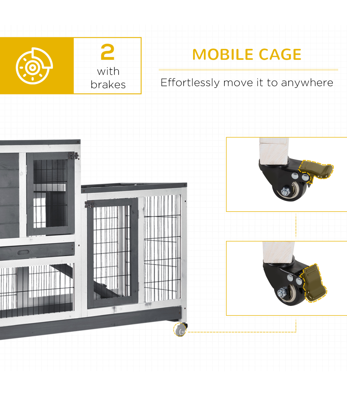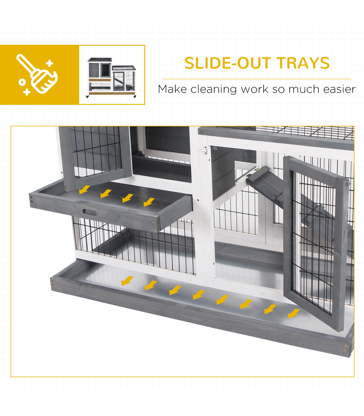 - Crafted from fir wood for a structure which is Solid and safe for pets to live in - four wheels allow you to move hutch around smoothly and easily. Two wheels have brakes - Raised design keeps your animals dry when the ground is wet - Two-tier design, formed of a top living house and a Bottom open area, with metal wiring surrounding the Bottom for safety - Non slip ramp connects the Two levels - Two Lockable doors and Slide-out trays for easy access - Ideal for rabbits, guineas pigs and other small animals. Assembly required