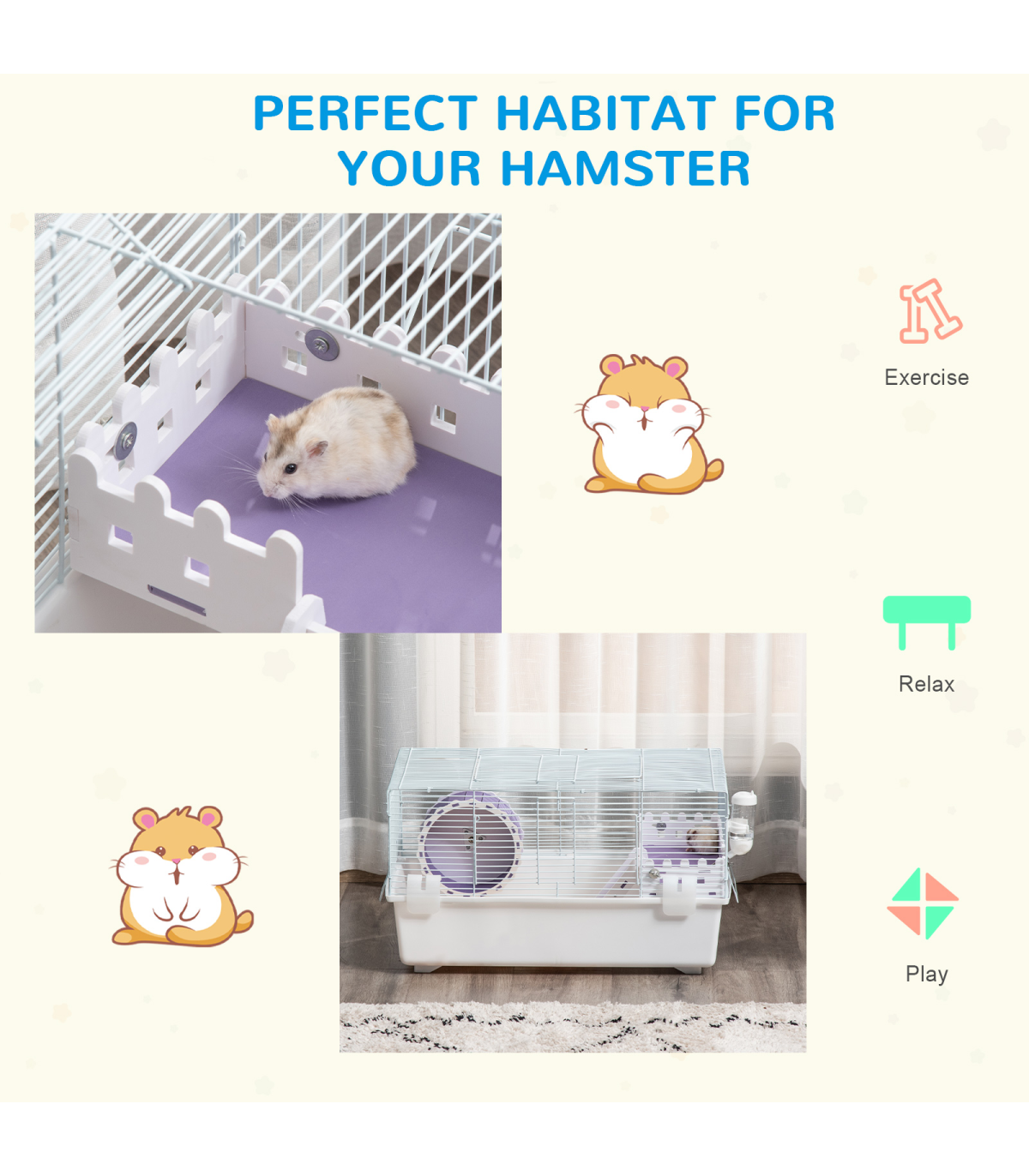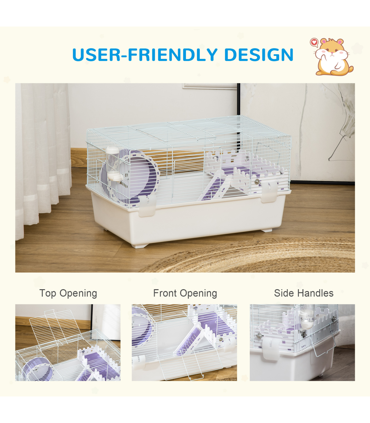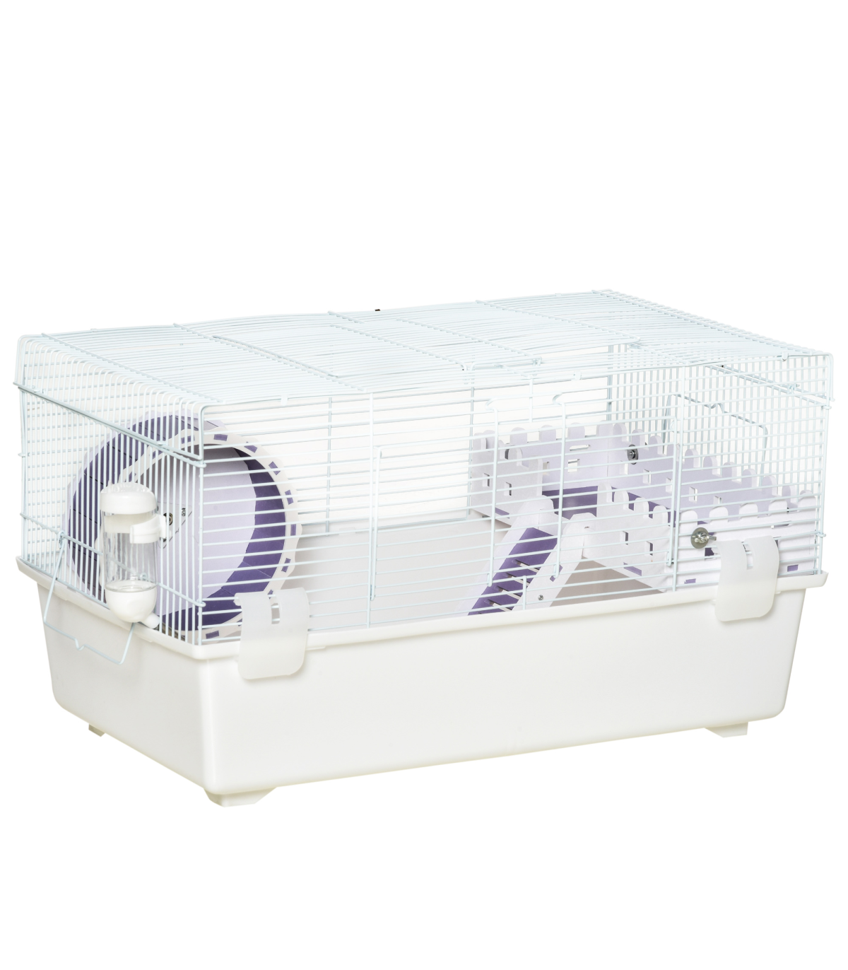 A new home for your hamster, in the form of this pet cage from PawHut. With two levels, a ladder, water bottle and an exercise wheel, they have all the necessities to stay occupied throughout the day. Keep their new home hygienic by removing and cleaning the plastic tray, just take your pet from the cage when maintaining, using the front or top opening. It's an activity centre and a resting spot - the ideal setup for small pets.