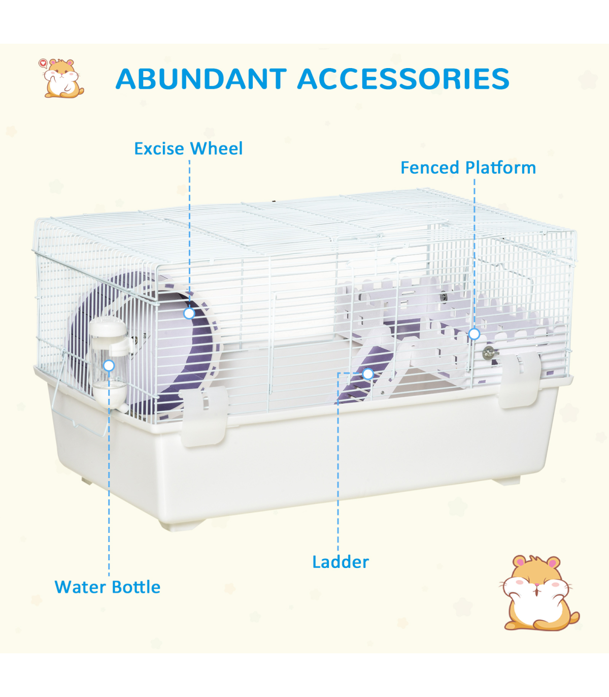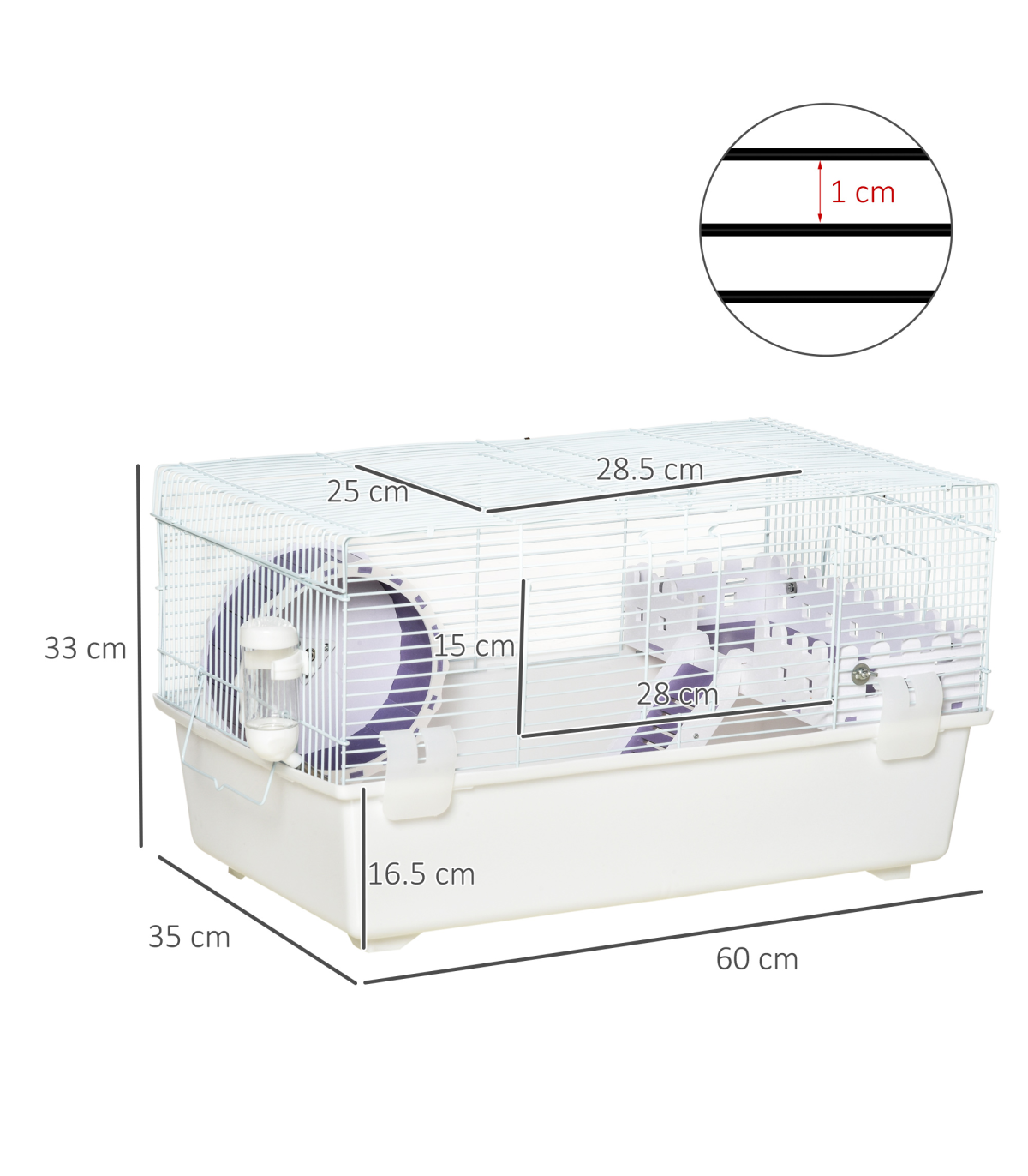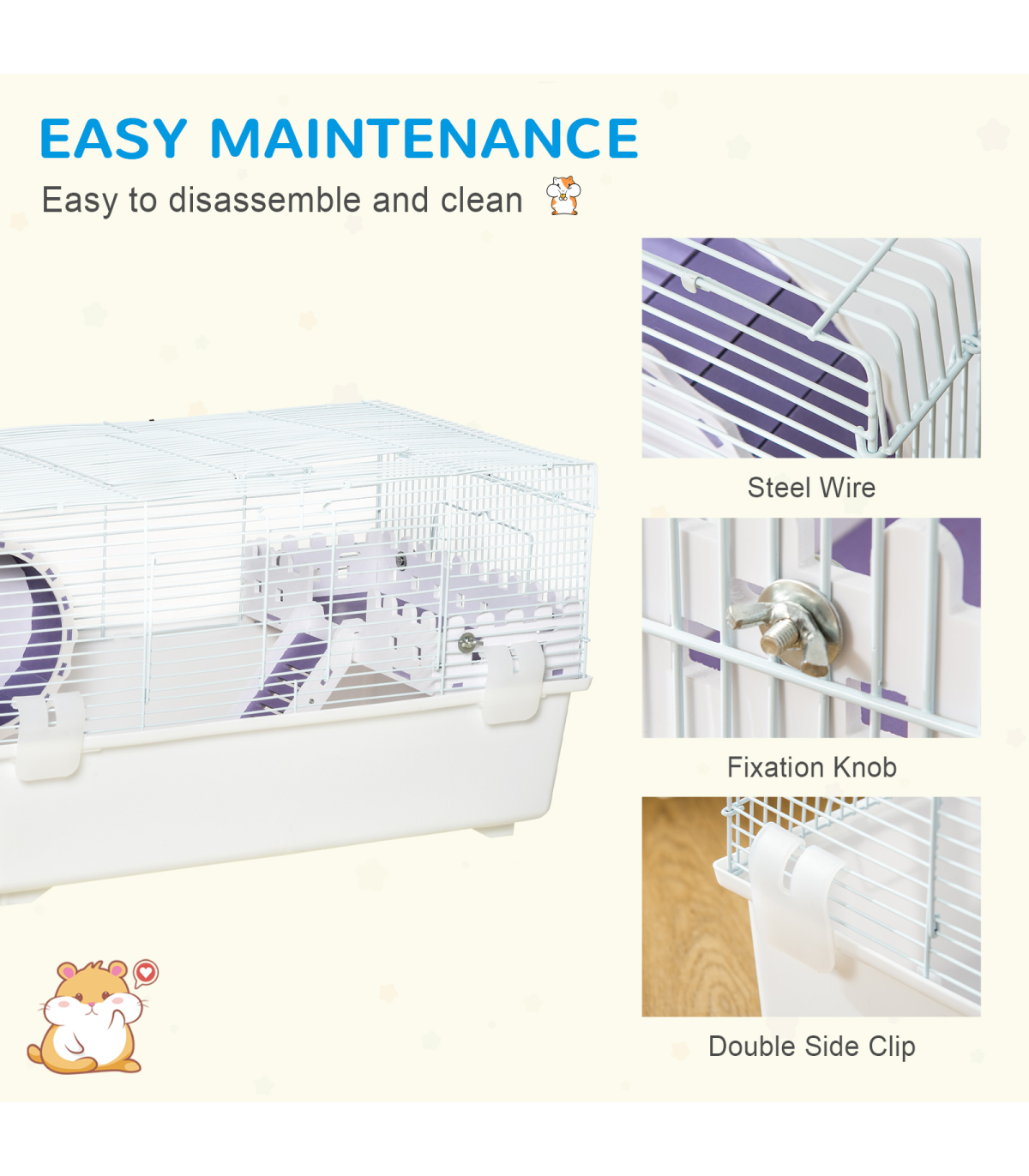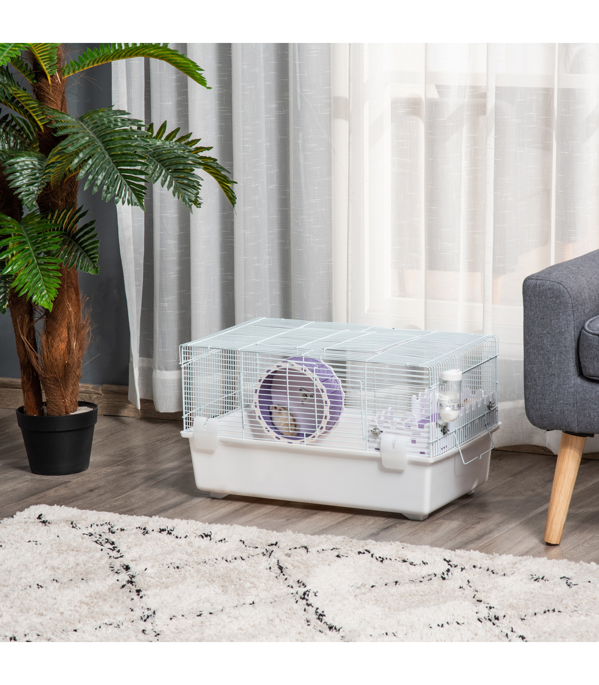 A new home for your hamster, in the form of this pet cage from PawHut. With two levels, a ladder, water bottle and an exercise wheel, they have all the necessities to stay occupied throughout the day. Keep their new home hygienic by removing and cleaning the plastic tray, just take your pet from the cage when maintaining, using the front or top opening. It's an activity centre and a resting spot - the ideal setup for small pets.