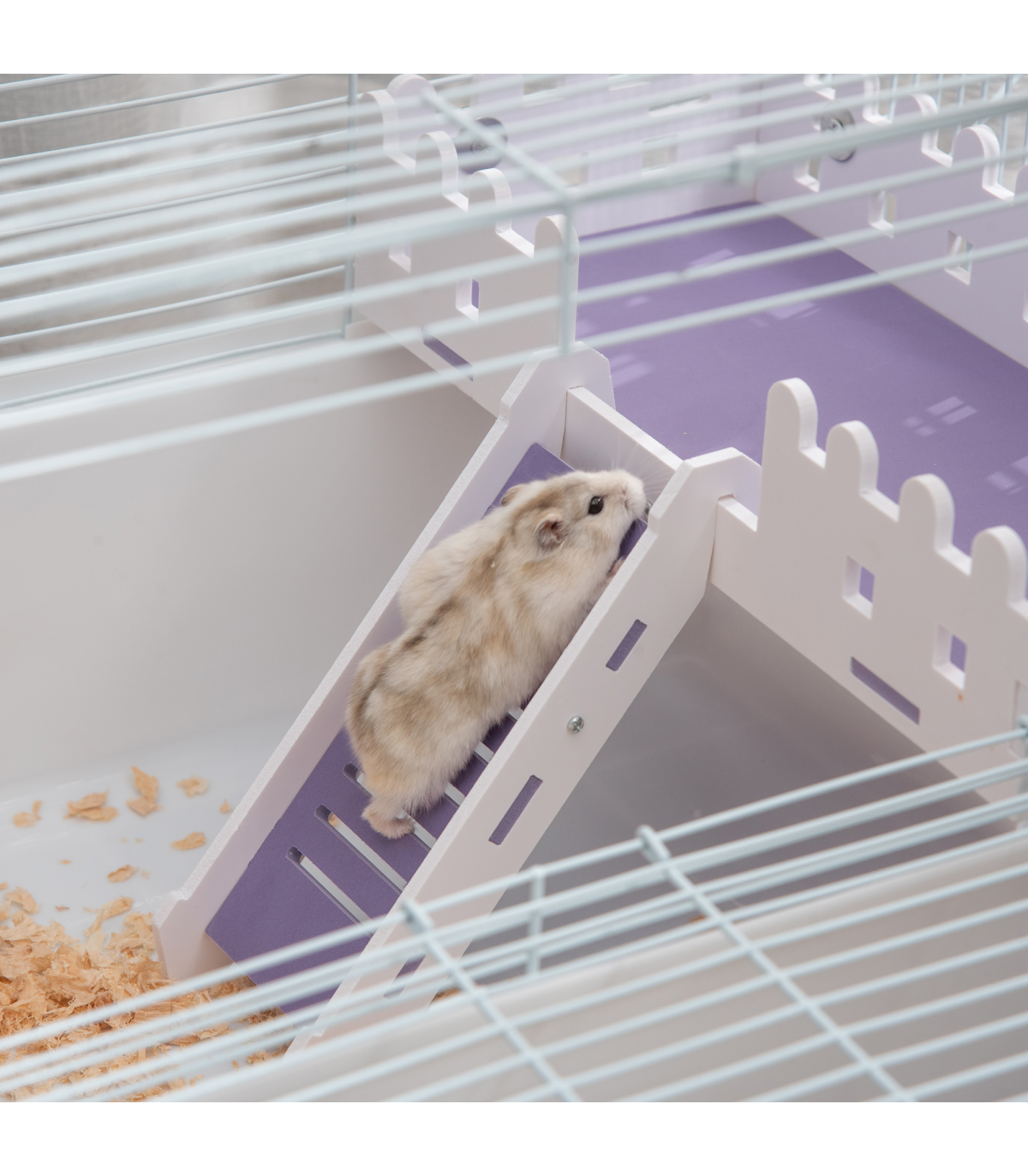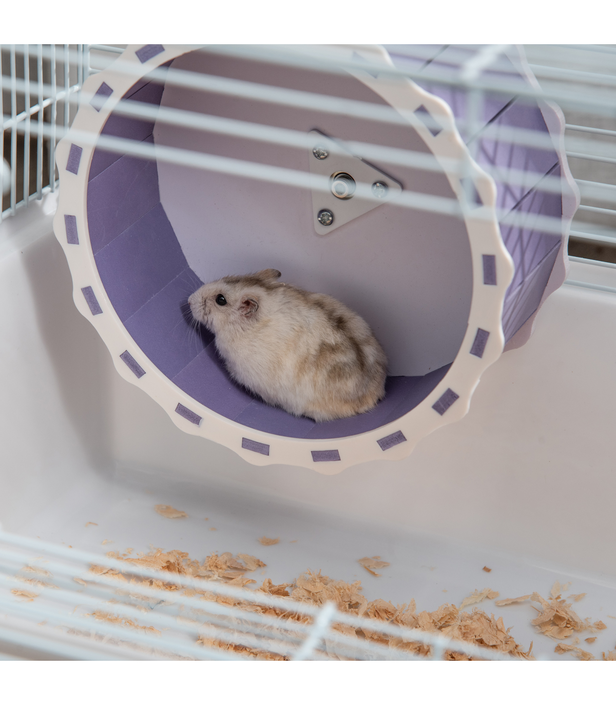 - offers Two platforms for space to move, relax and exercise - Includes a fenced platform, water bottler, ladder and exercise wheel - steel wire for good ventilation and side handles for easy grip - features Two openings: one on the top and the other at the front for easy access - Suitable for indoors - Assembly required