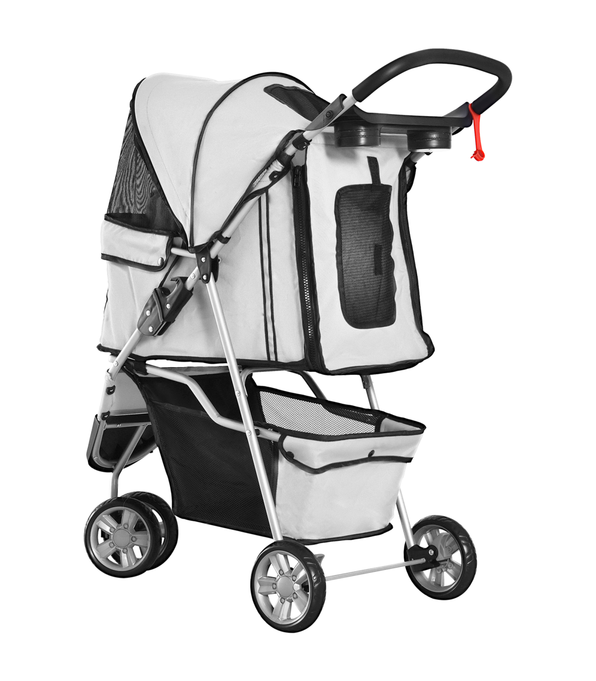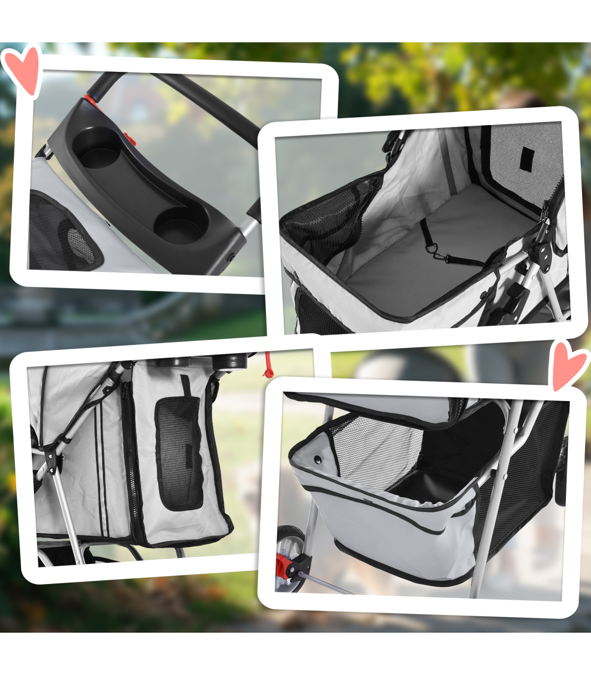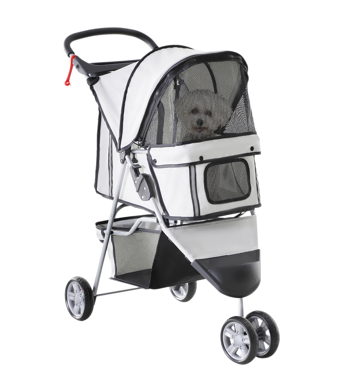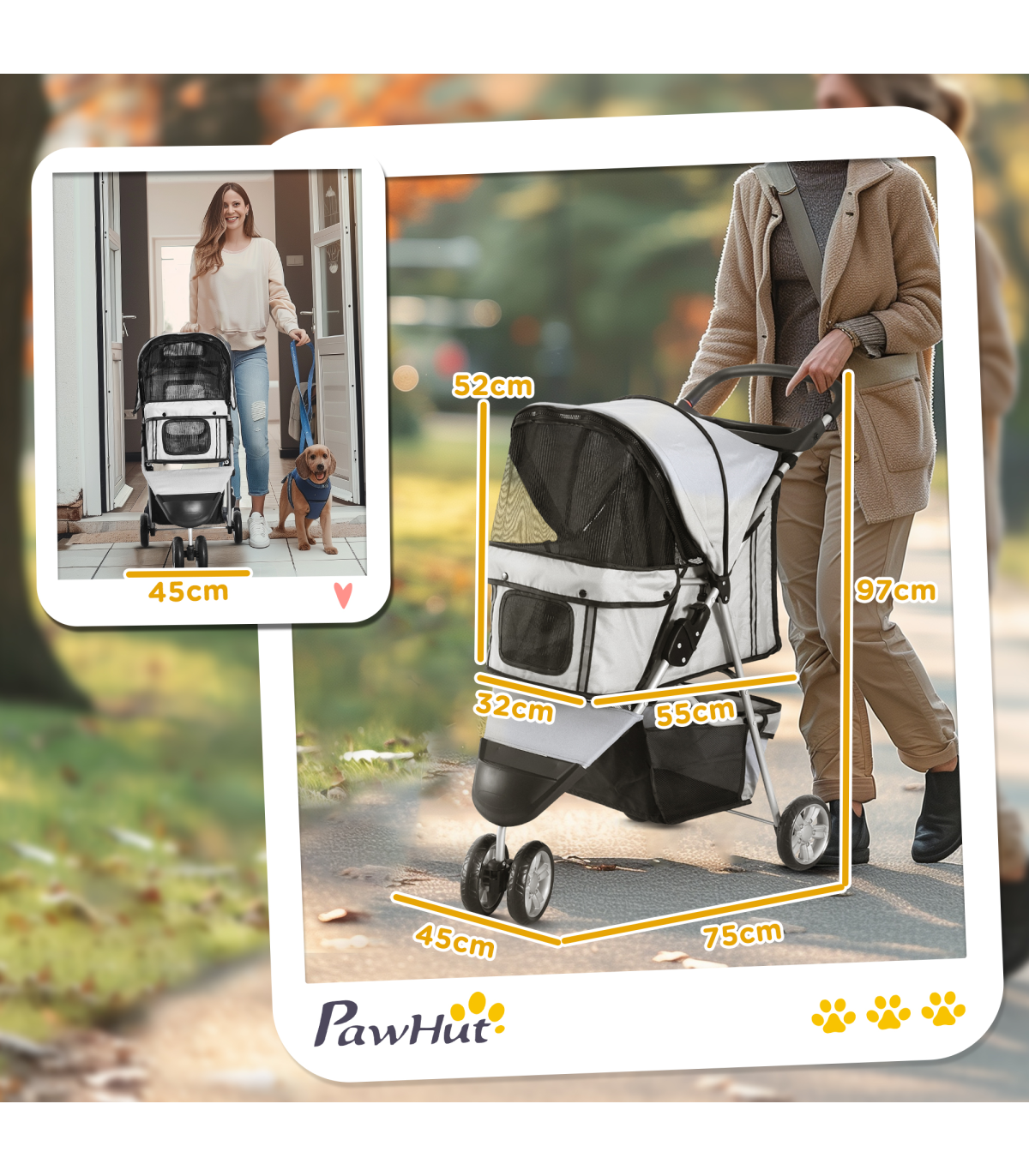 - Pet Stroller Pushchair Carrier for Cat Puppy with 3 Wheels Grey Pawhut - Description: - STYLISH DESIGN: Clear structure with simple colors, equipped with cup holder and bottom storage pocket - SAFETY: Front universal wheels, rear wheels with brake lever for easy parking, 2 pairs of reflective strips on the front and back, fastened with zipper on the back for secure strapping - VENTILATE: Breathable gauze made of 120g/㎡ nylon breathable mesh for air circulation and breathability - DURABILITY: Solid steel frame with sturdy structure and cationic oxford cloth, durable for long-lasting use, includes bottom basket for convenient storage - DIMENSIONS: Overall Dimension: 75L x 45W x 97H cm, Folded Dimension: 83L x 45W x 25H cm - Suitable for small and miniature dogs less than 35 cm in length and less than 10 kg in weight - Note: Please measure the body length of your dog before purchasing.