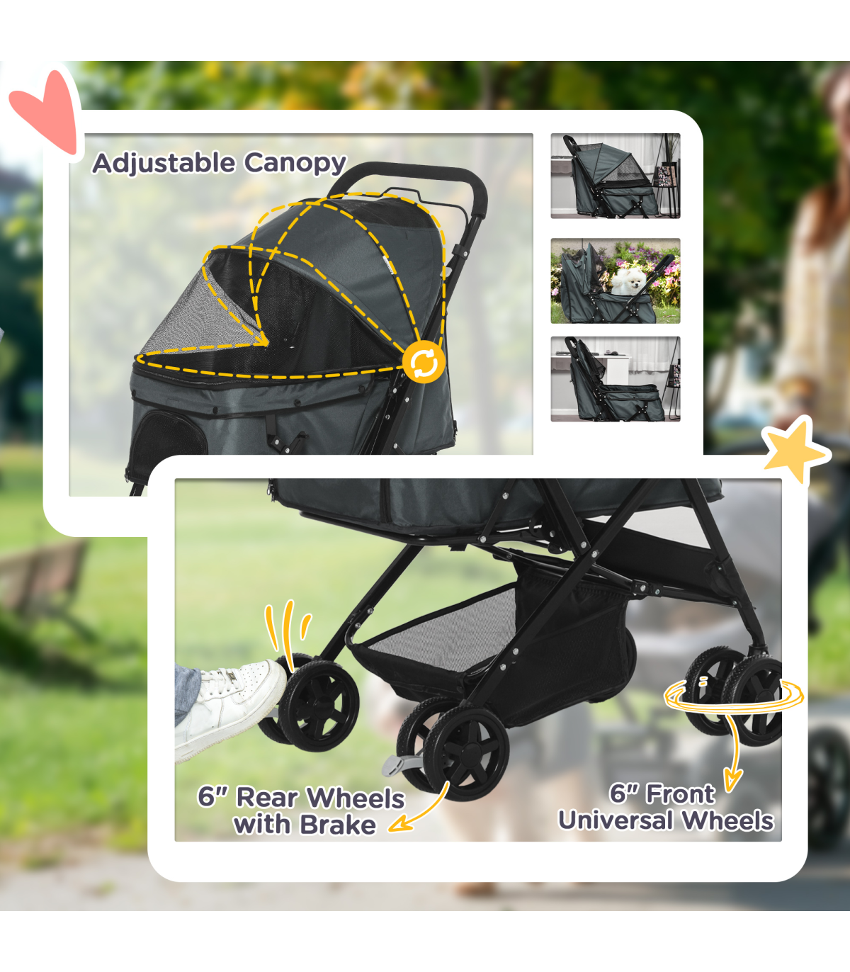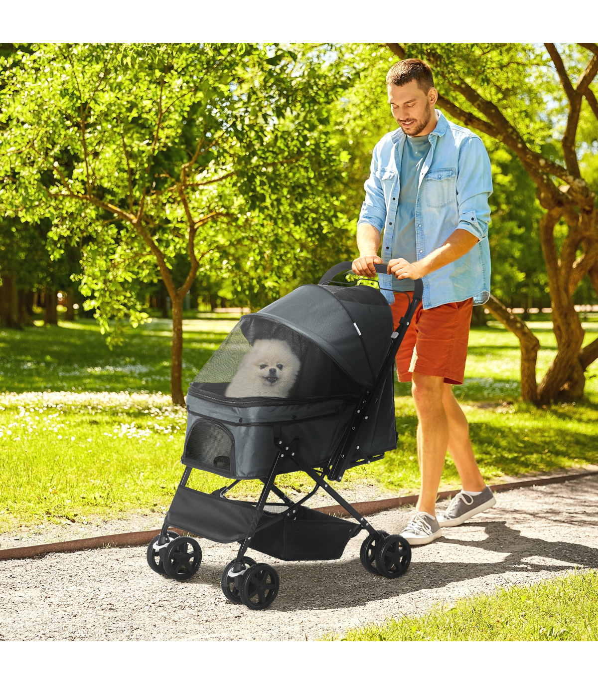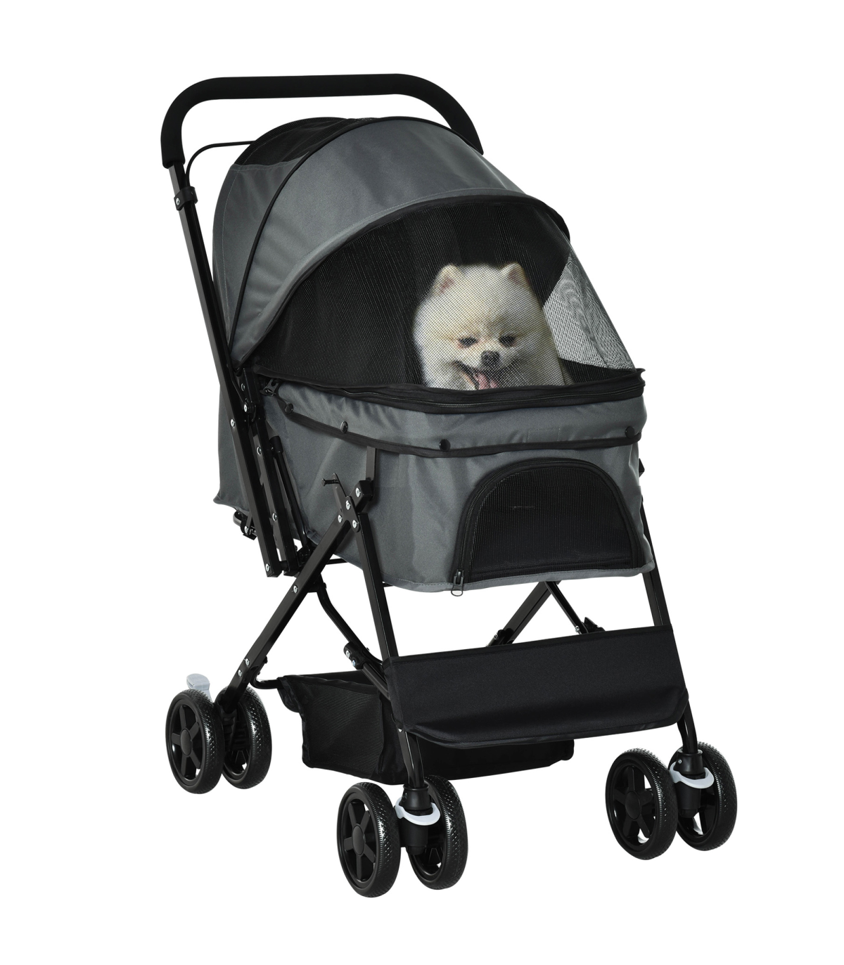 - Oxford cloth shell covers basket, with a mesh window to let air inside. Adjustable canopy to protect - Two inner leashes to keep pet safely strapped in - Four wheels and handlebar to push easily - two with brakes - Bottom basket and zipped bag for storage - Handlebar position is reversible - can face pet whilst pushing stroller along - Suitable for small and miniature dogs less than 43 cm in length and less than 10 kg in weight - Easy to fold and carry, assembly required- Colour: Grey - Material: Steel, Oxford Fabric - Overall Dimension: 76.5L x 52W x 95H cm - Internal Dimension: 63L x 36W x 51/20H cm(Canopy included/not included) - Folded Size: 80L x 52W x 27H cm - Rear Door Size: 29W x 38.5H cm - Top Mesh Skylight Size: 24L x 19W cm - Front Zipped Mesh Window Size: 26L x 14.5W cm - Basket Size: 34L x 27.5W x 14H cm - Front Wheel Size: 6" - Rear Wheel Size: 6" - Item Label: D00-126GY